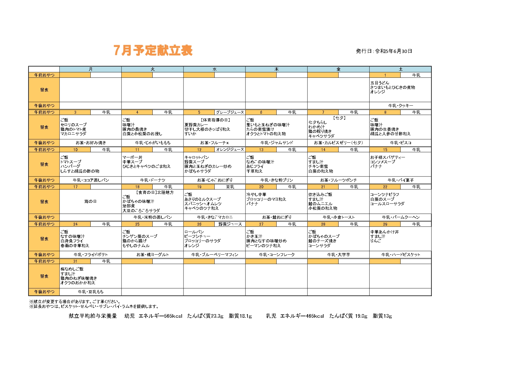 7月の給食だより・献立表