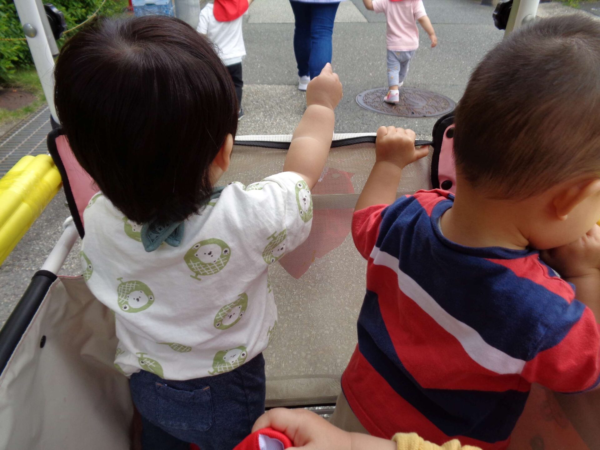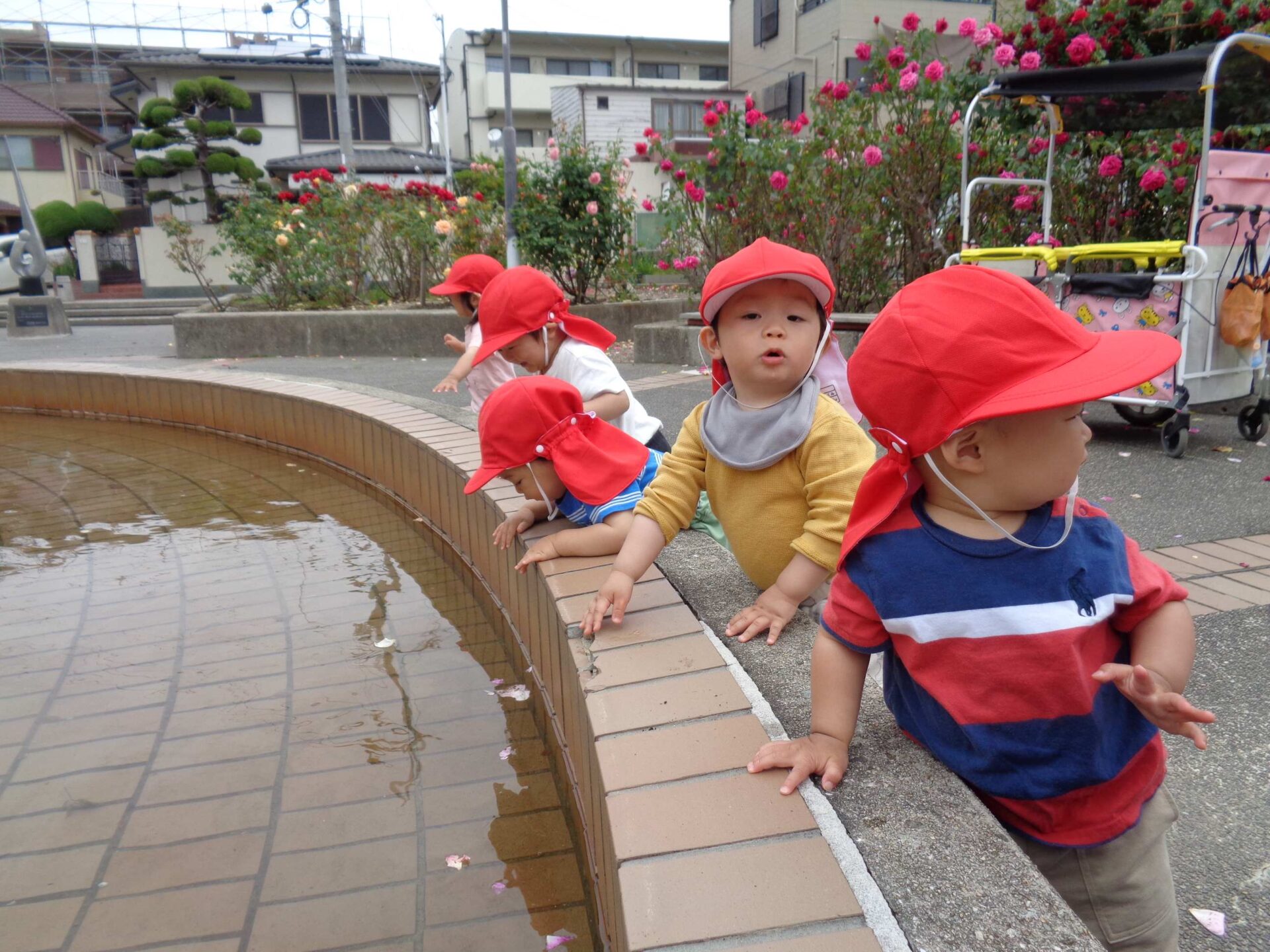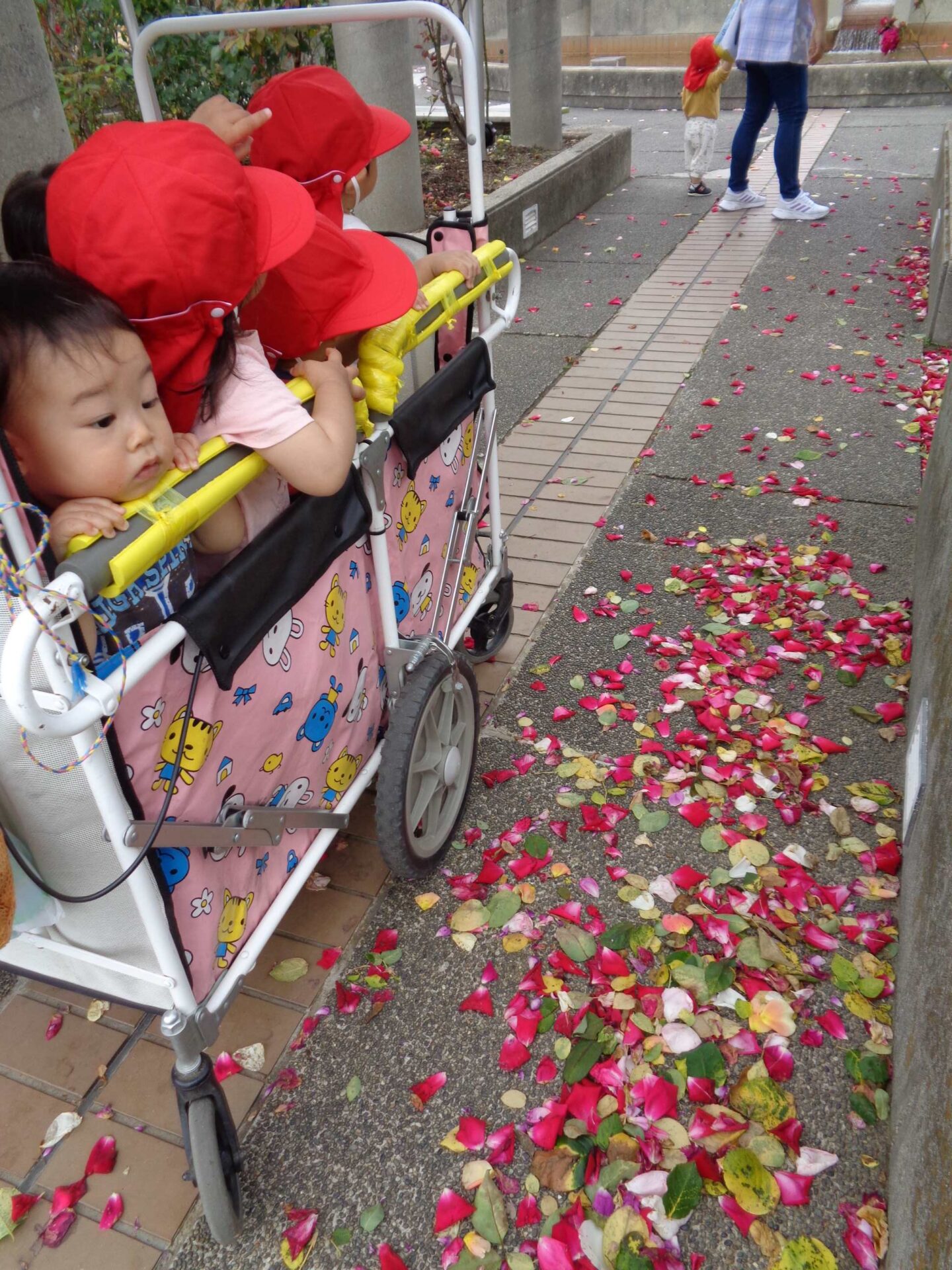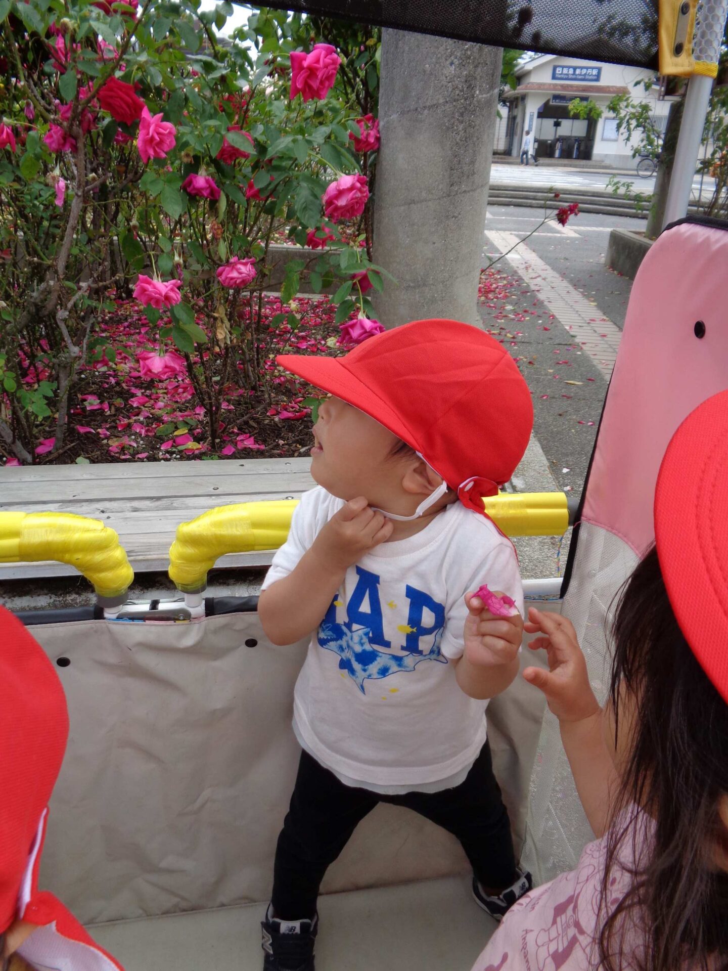 満開のバラと、カートの中の子どもたち^^(1歳児 だいち組)