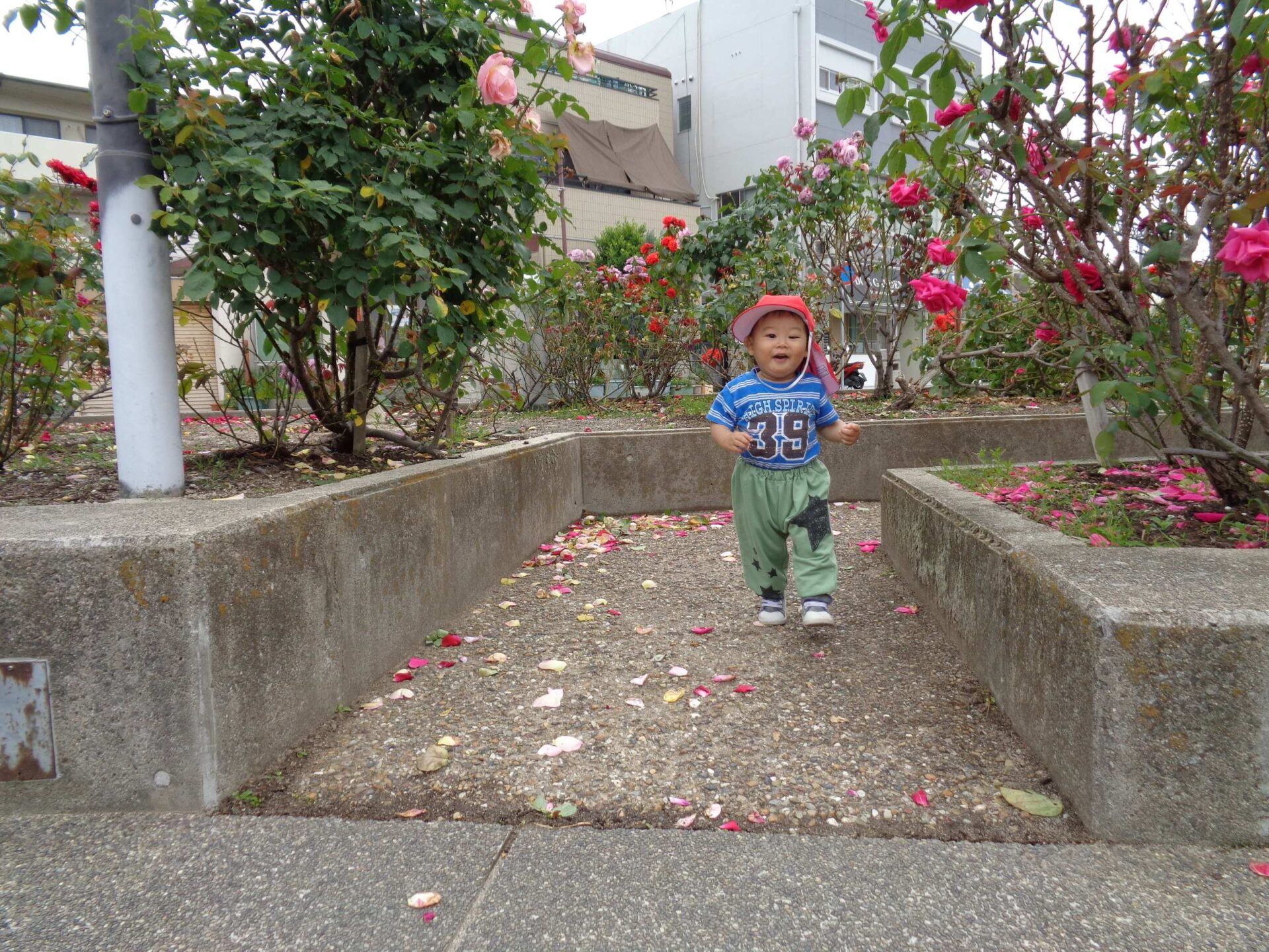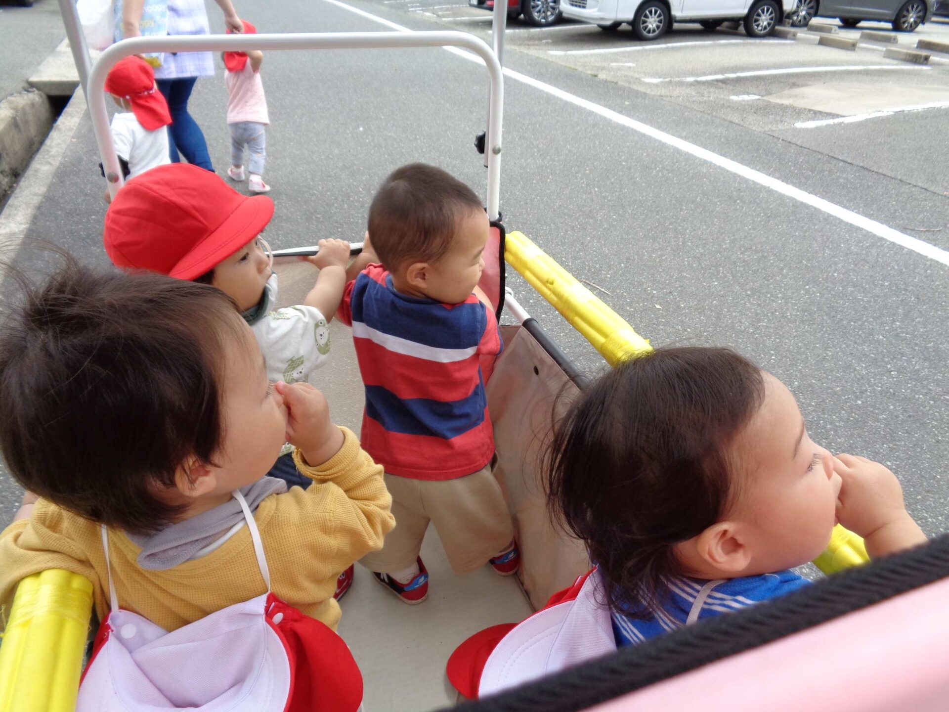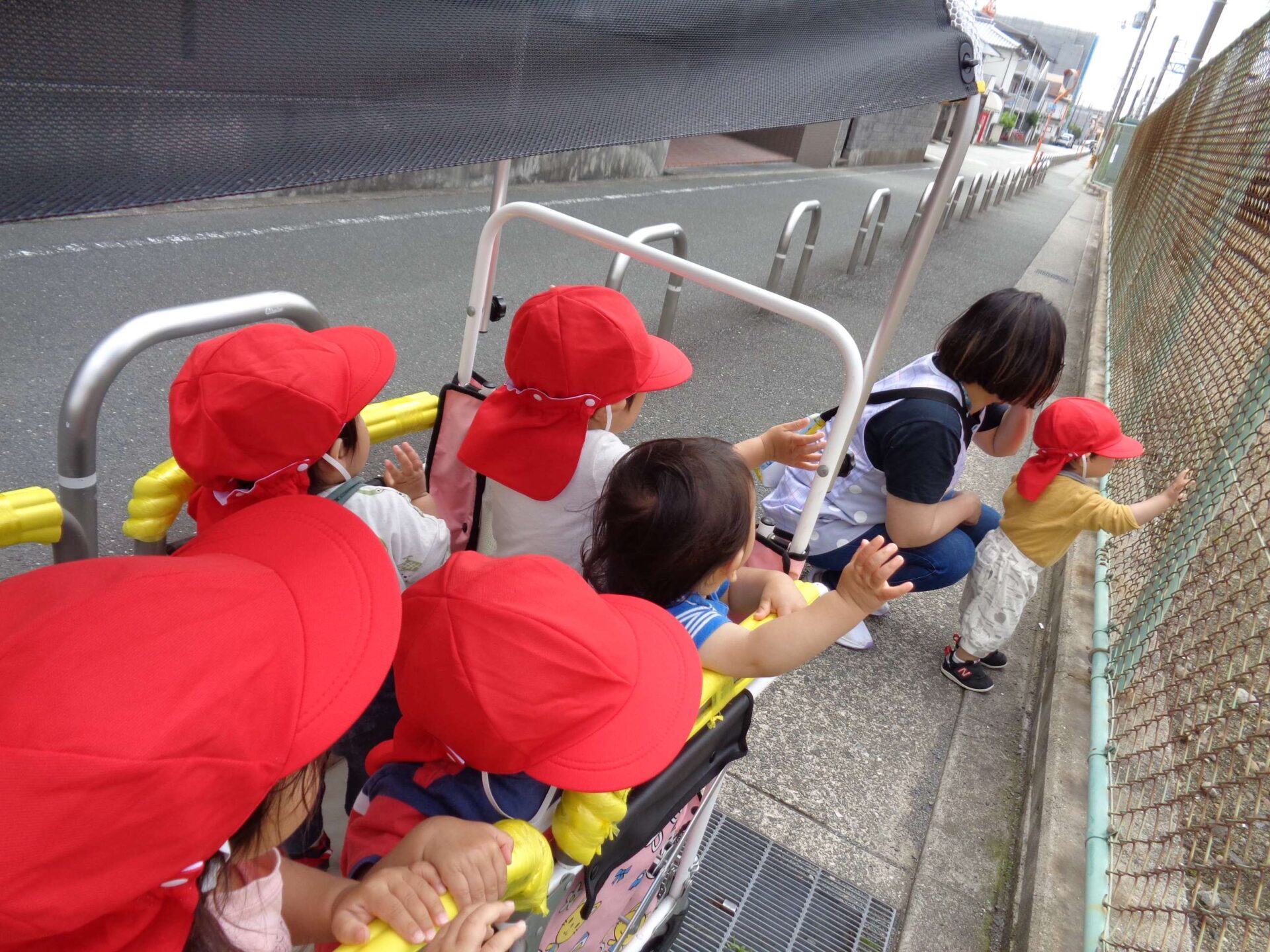 満開のバラと、カートの中の子どもたち^^(1歳児 だいち組)