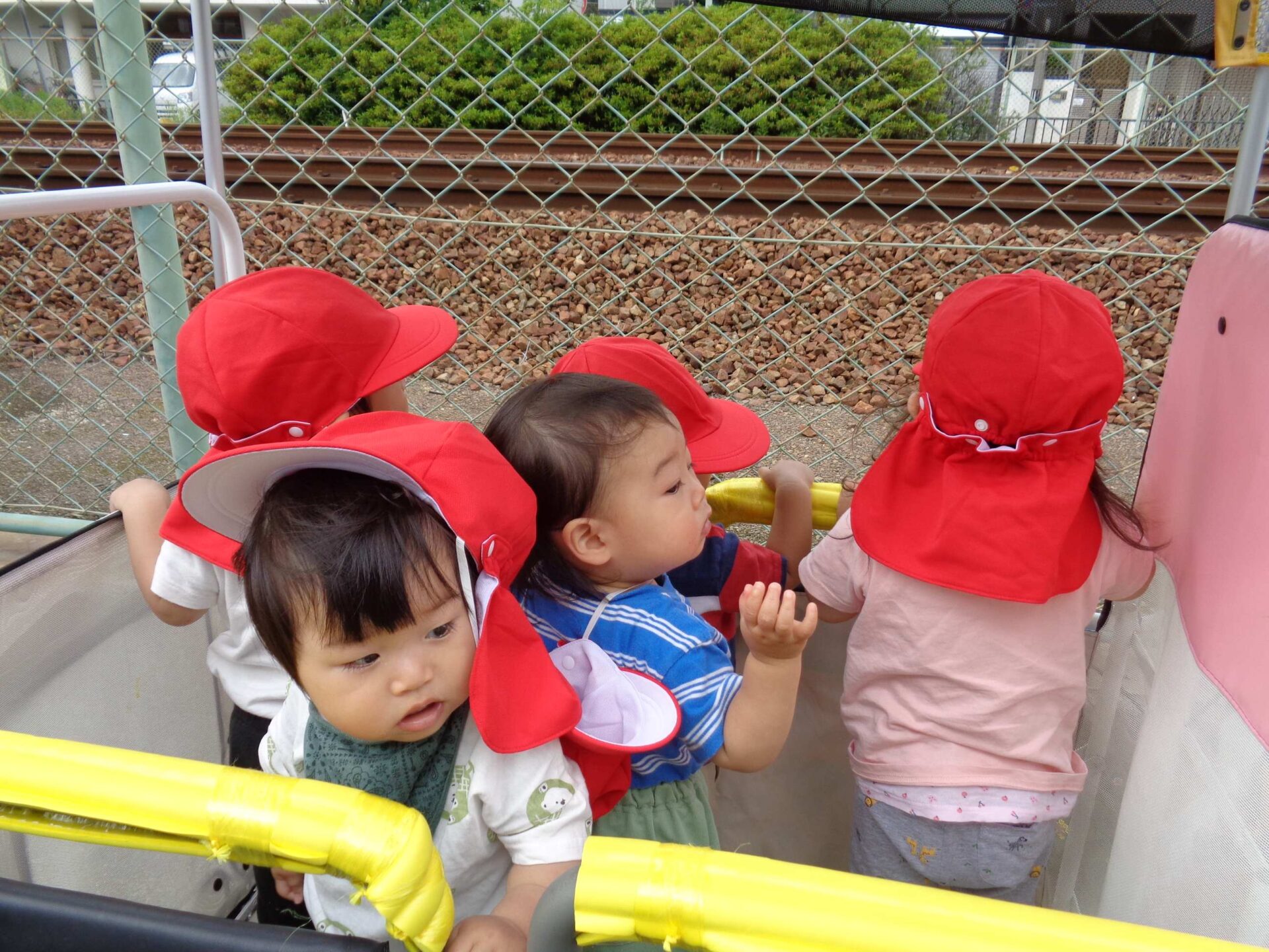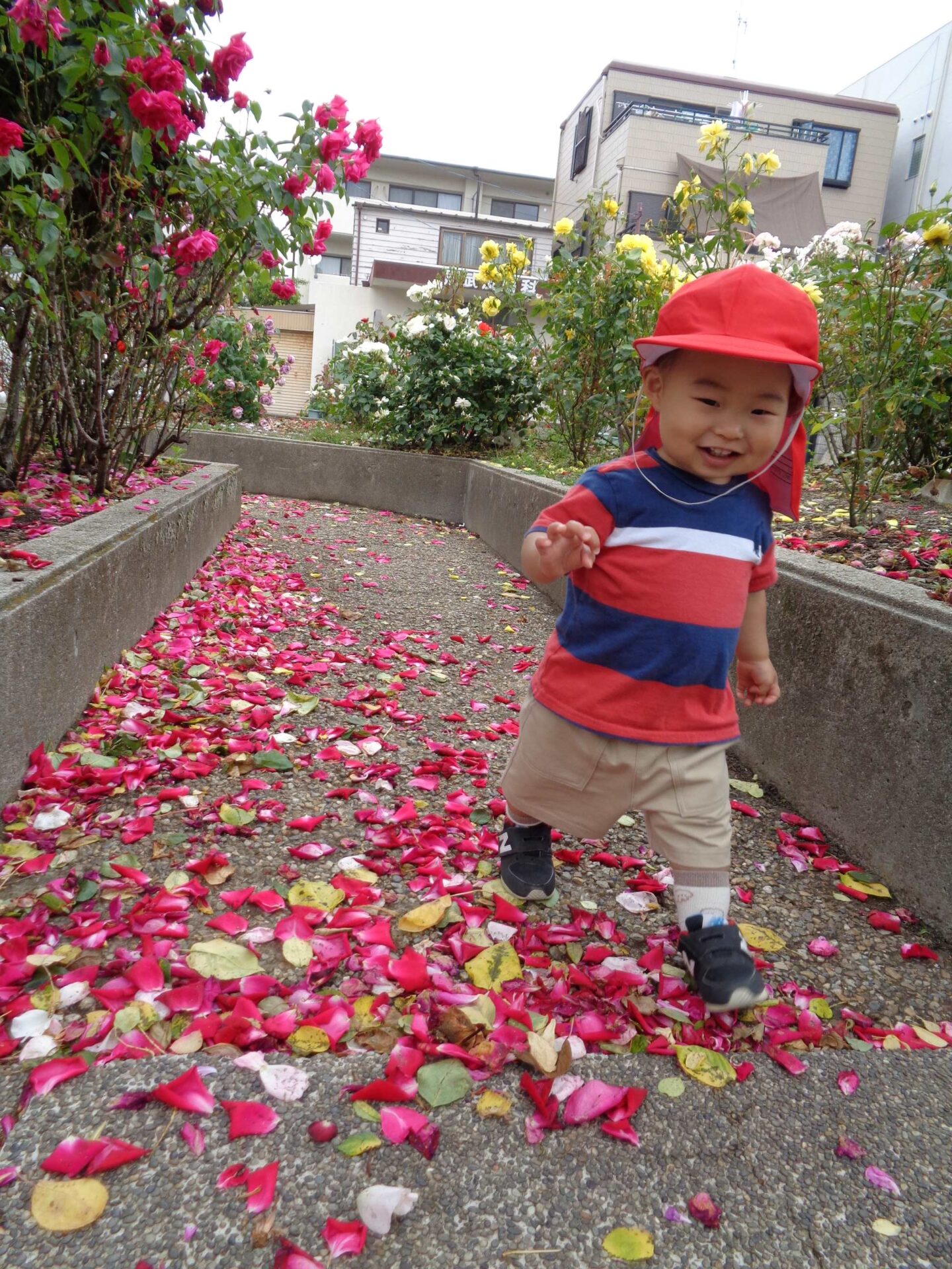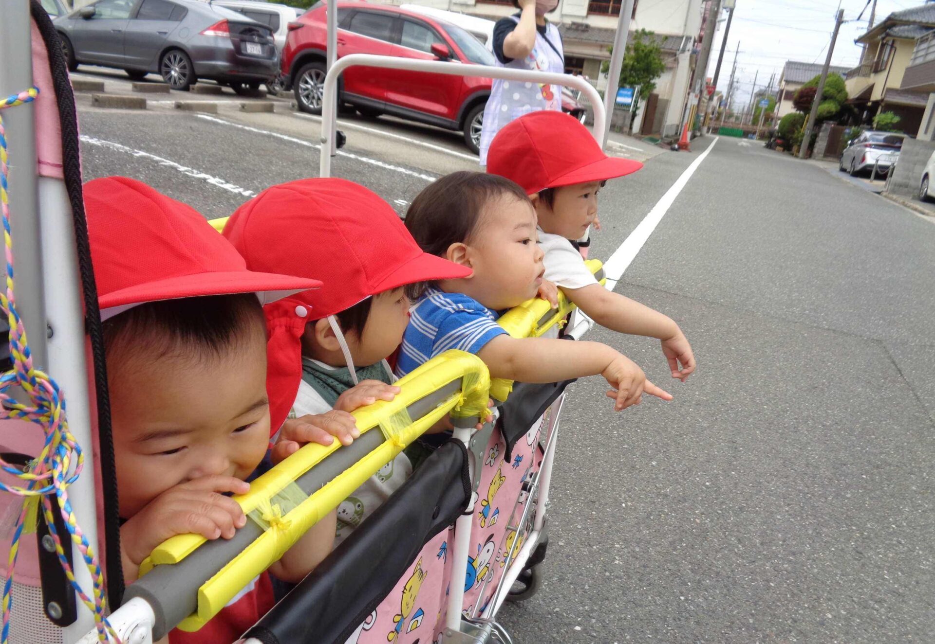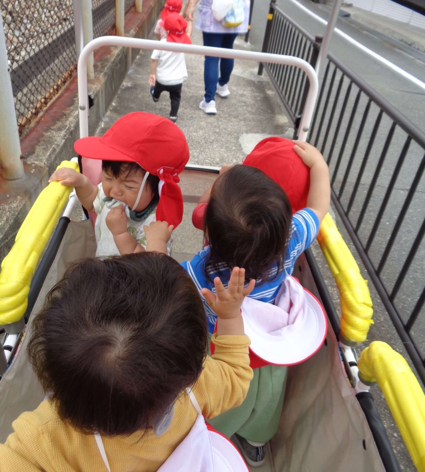 満開のバラと、カートの中の子どもたち^^(1歳児 だいち組)