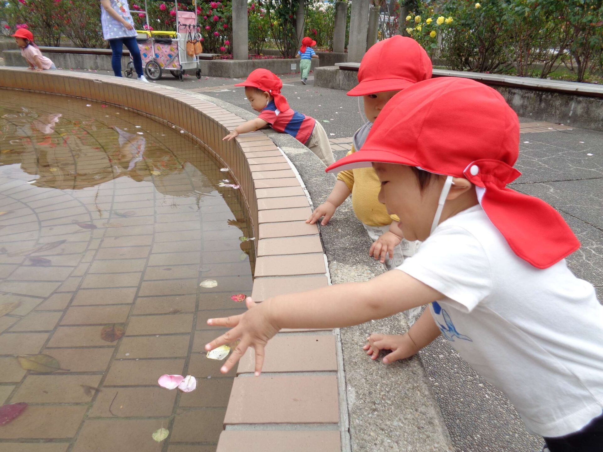 水面に花びらが浮かんでいるのを見つけると、足元にあった花びらを池に落とし始めました。