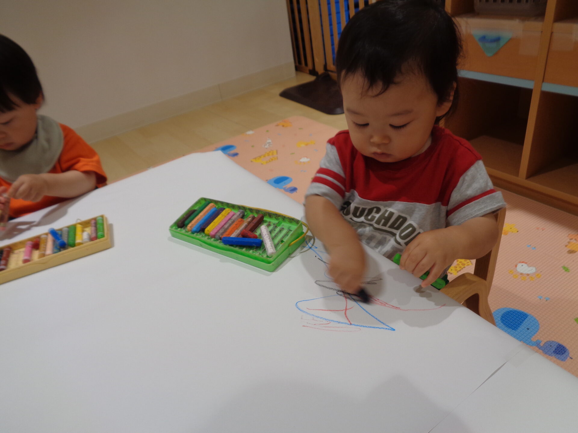 大きな模造紙を机に貼り、クレヨンで自由に描きました🖍