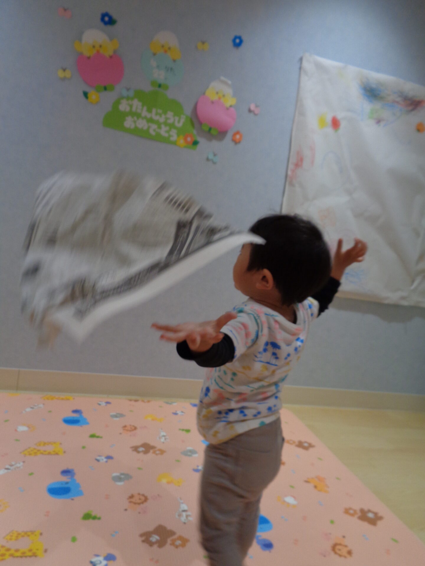 新聞を上に飛ばして、ひらひら舞うのを楽しんでいました。