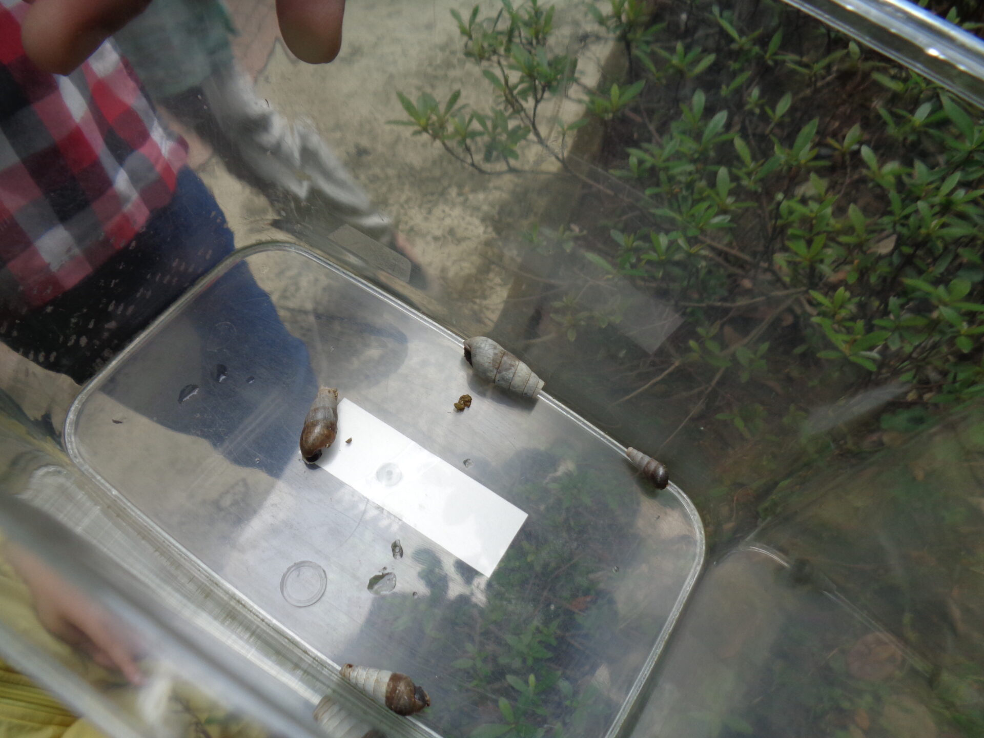 商店街の植え込みに、だんごむしがいた!と見ていたら、なんと巻き貝のような貝がコロコロとありました。よく見ると、貝の中にちゃんと住人がいました!