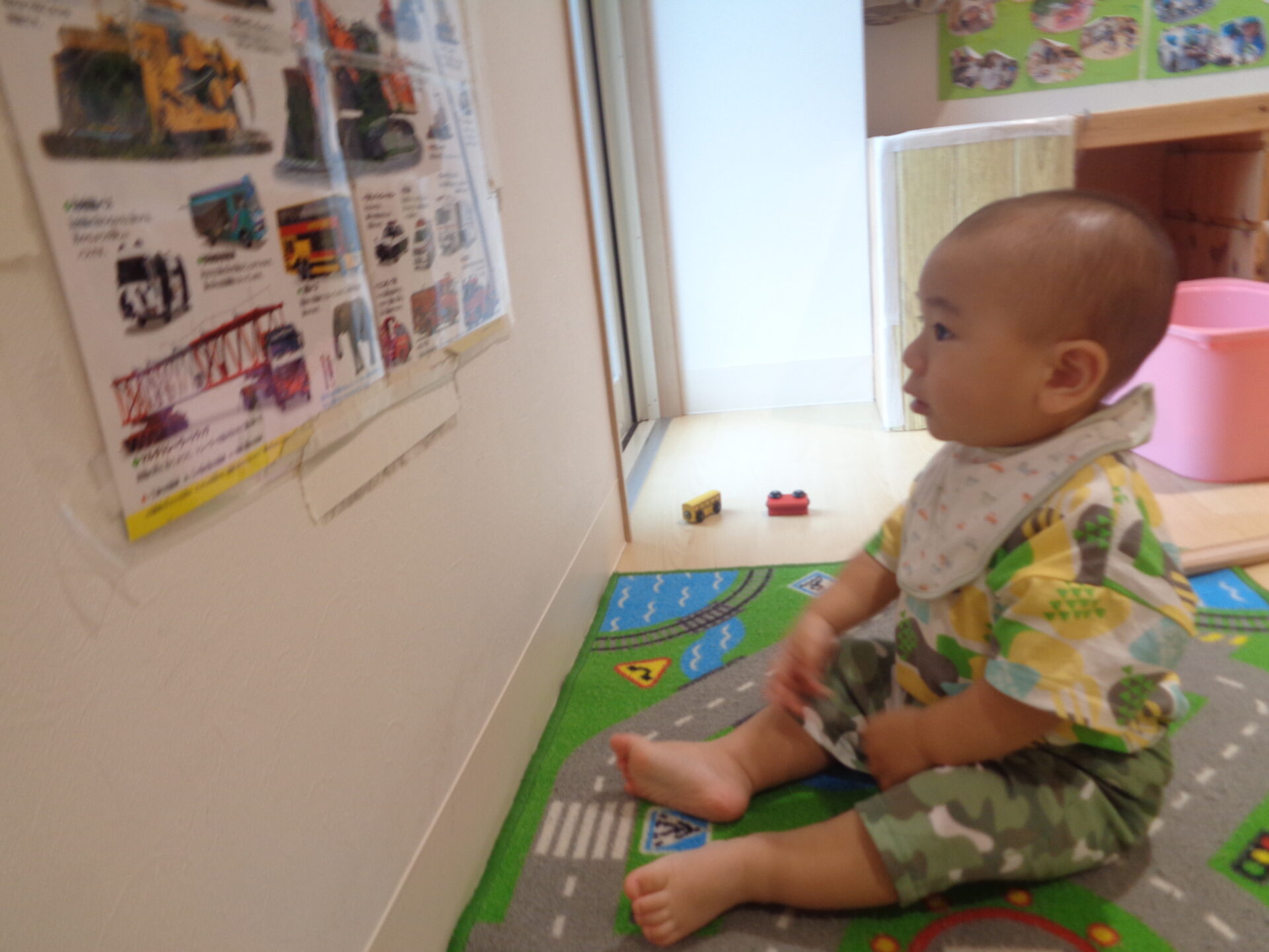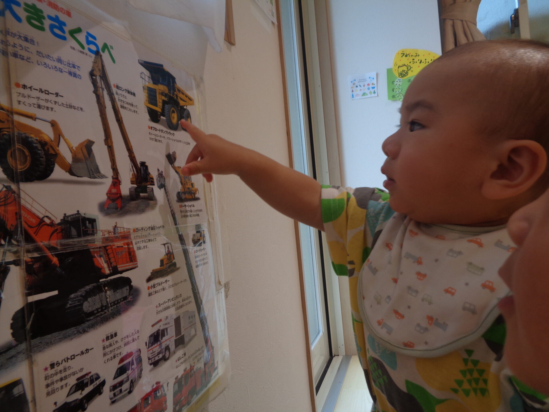 1,2歳児クラスの保育室に乗り物の写真が貼ってあるのですが、興味津々で見ている様子…。