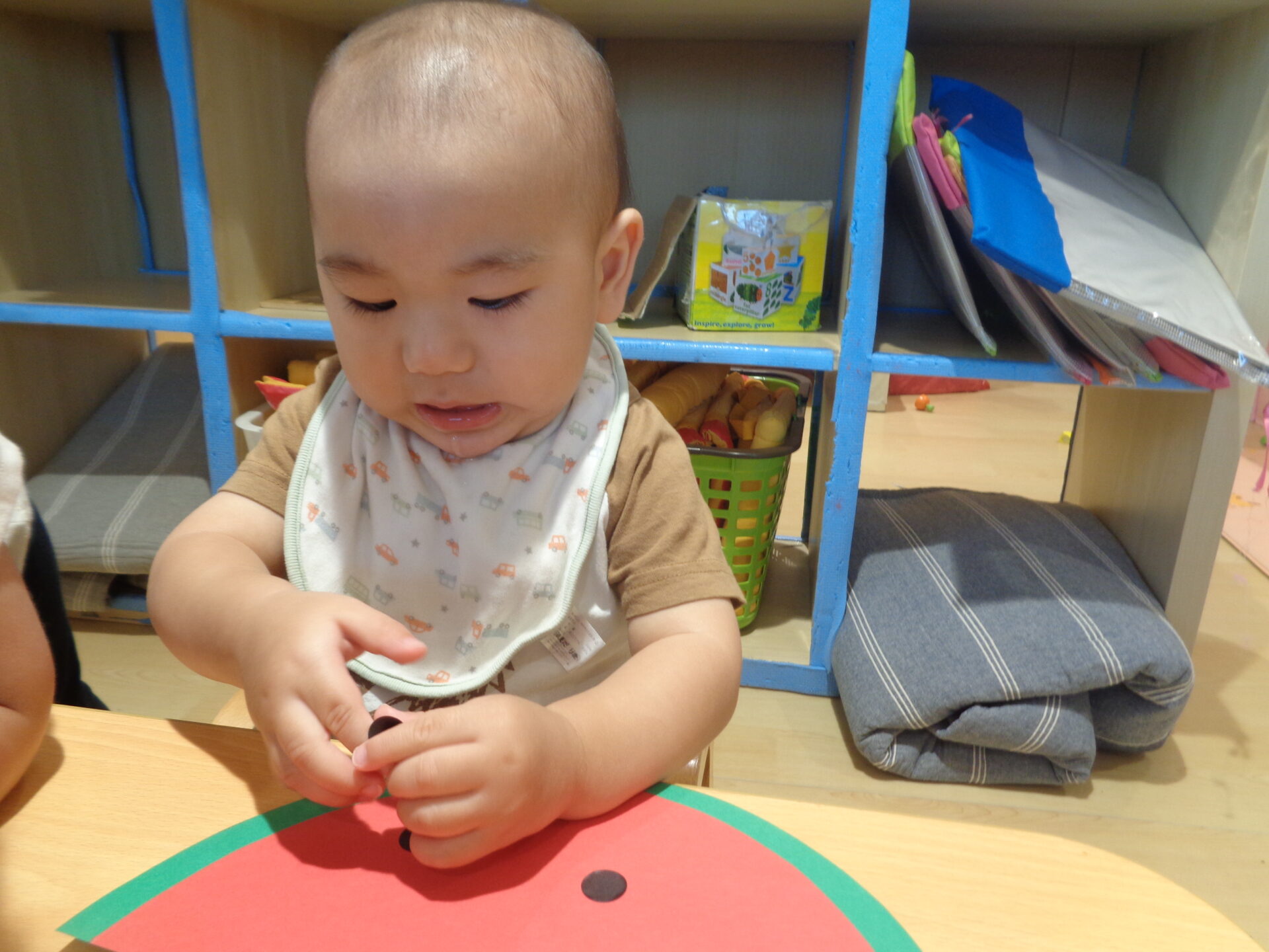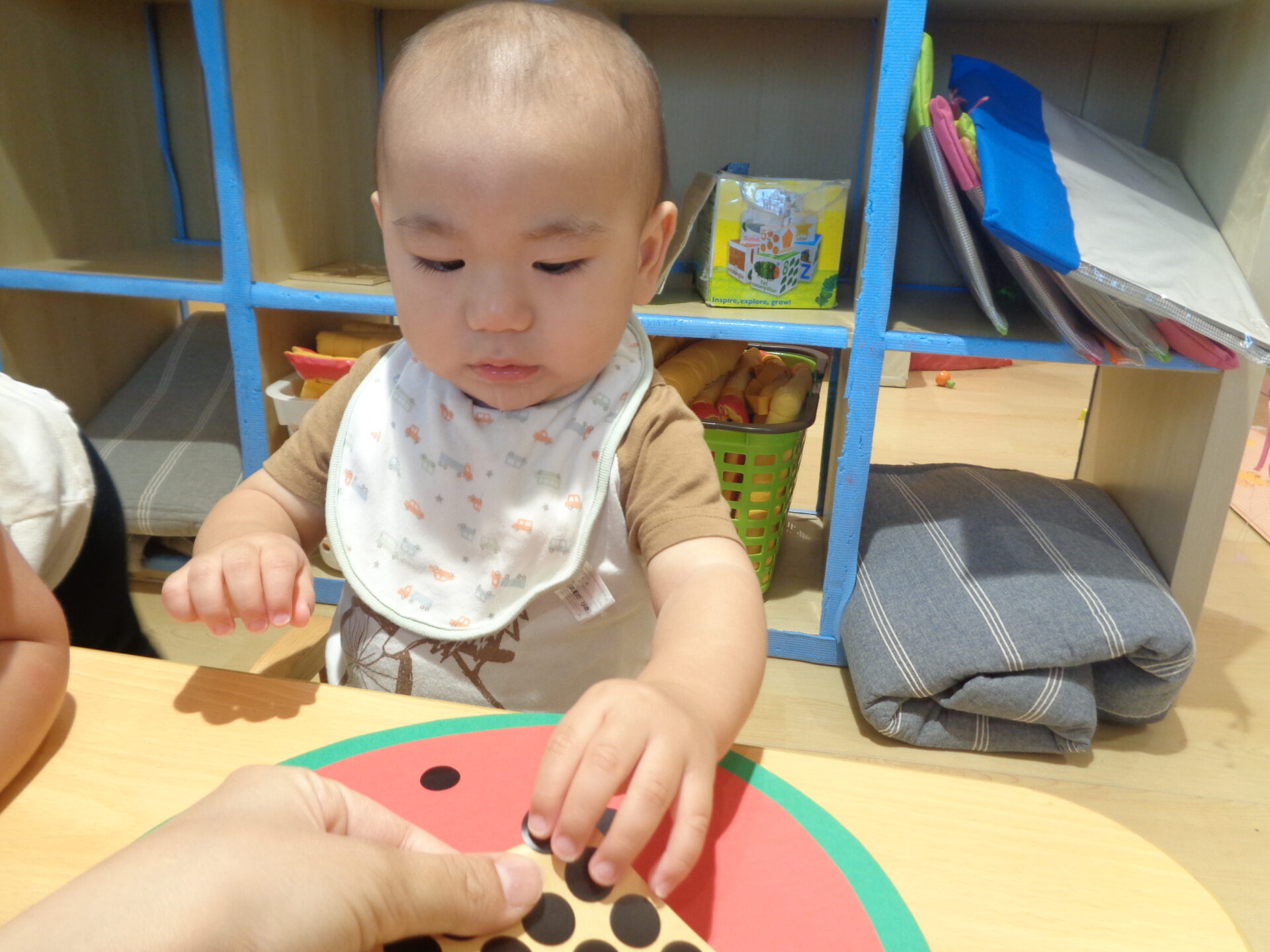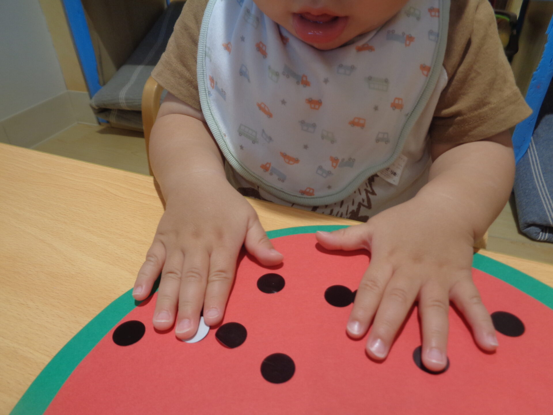シールの台紙を見せると、「自分で取る~!」と台紙からシールを取ろうとしていました。