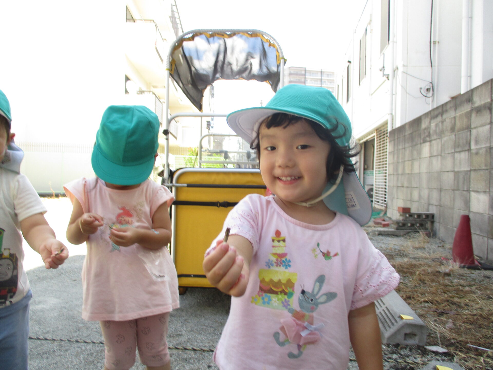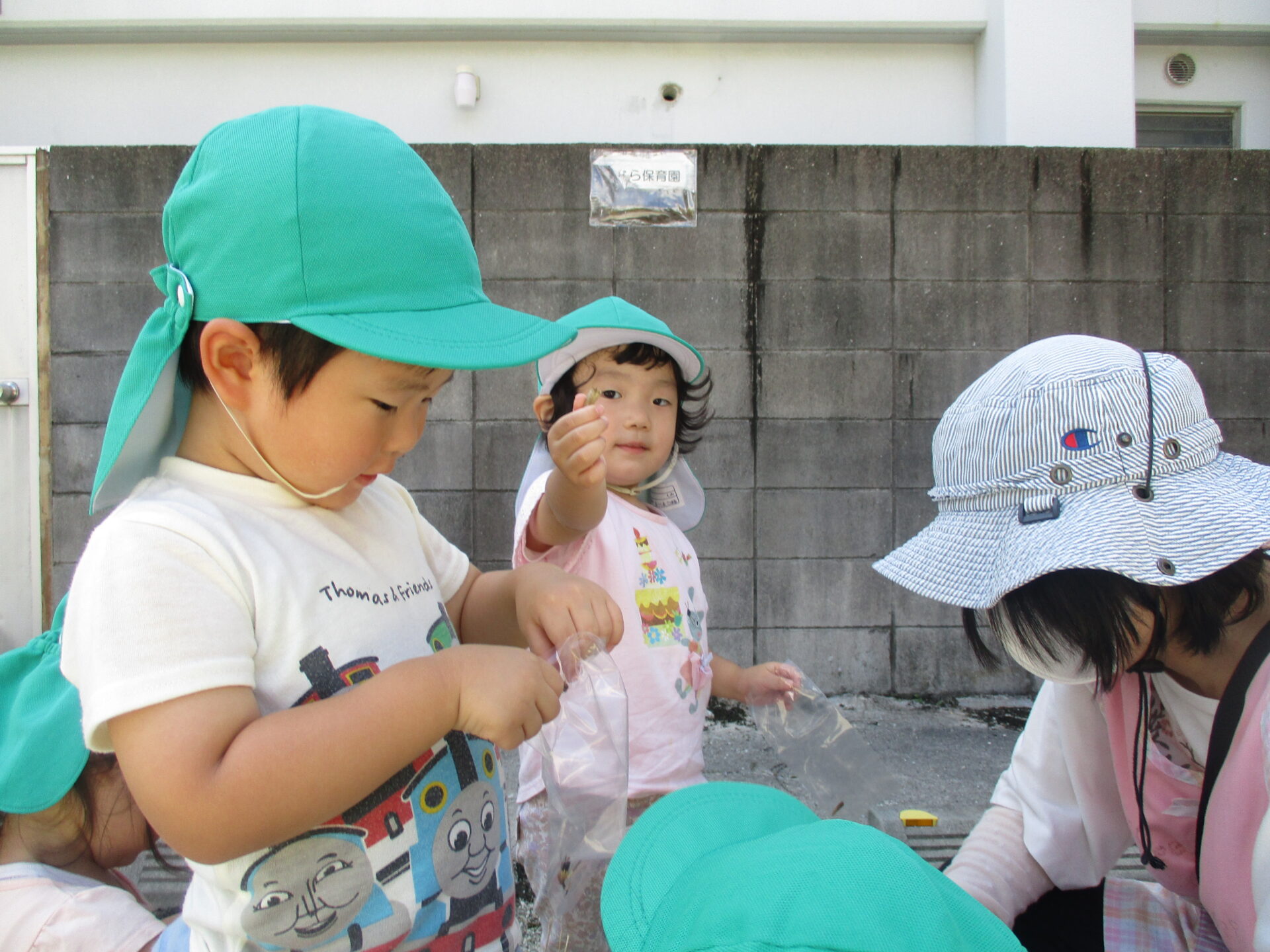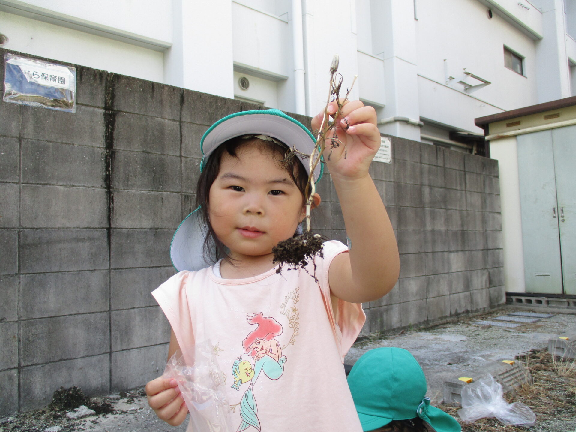最初は、何か虫に見えたのか保育士が「見てみて~✨」と収穫して見せると