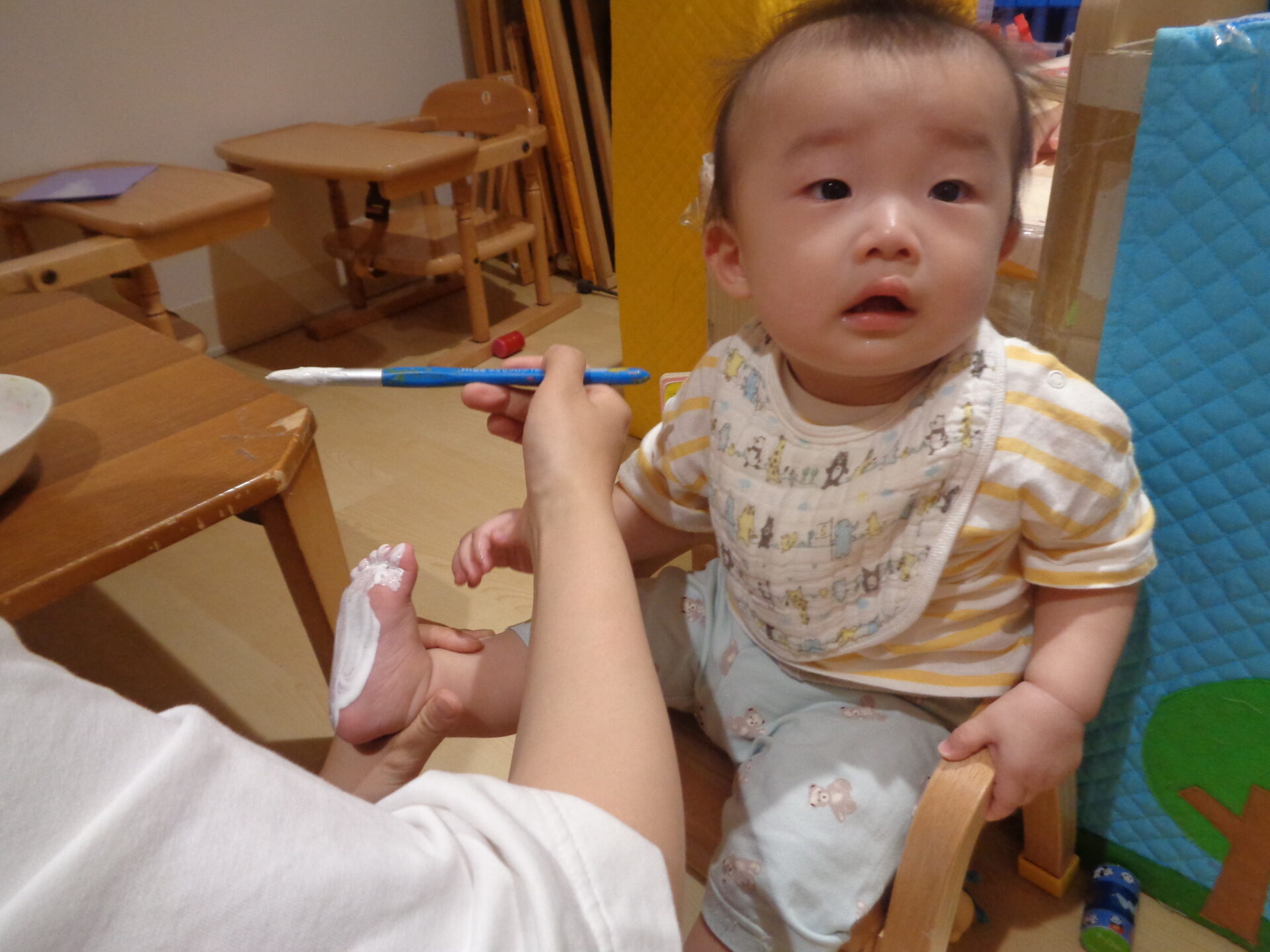 足の裏に絵の具を塗ると、「えっ!?何をされているんだろう?」と驚いていました。