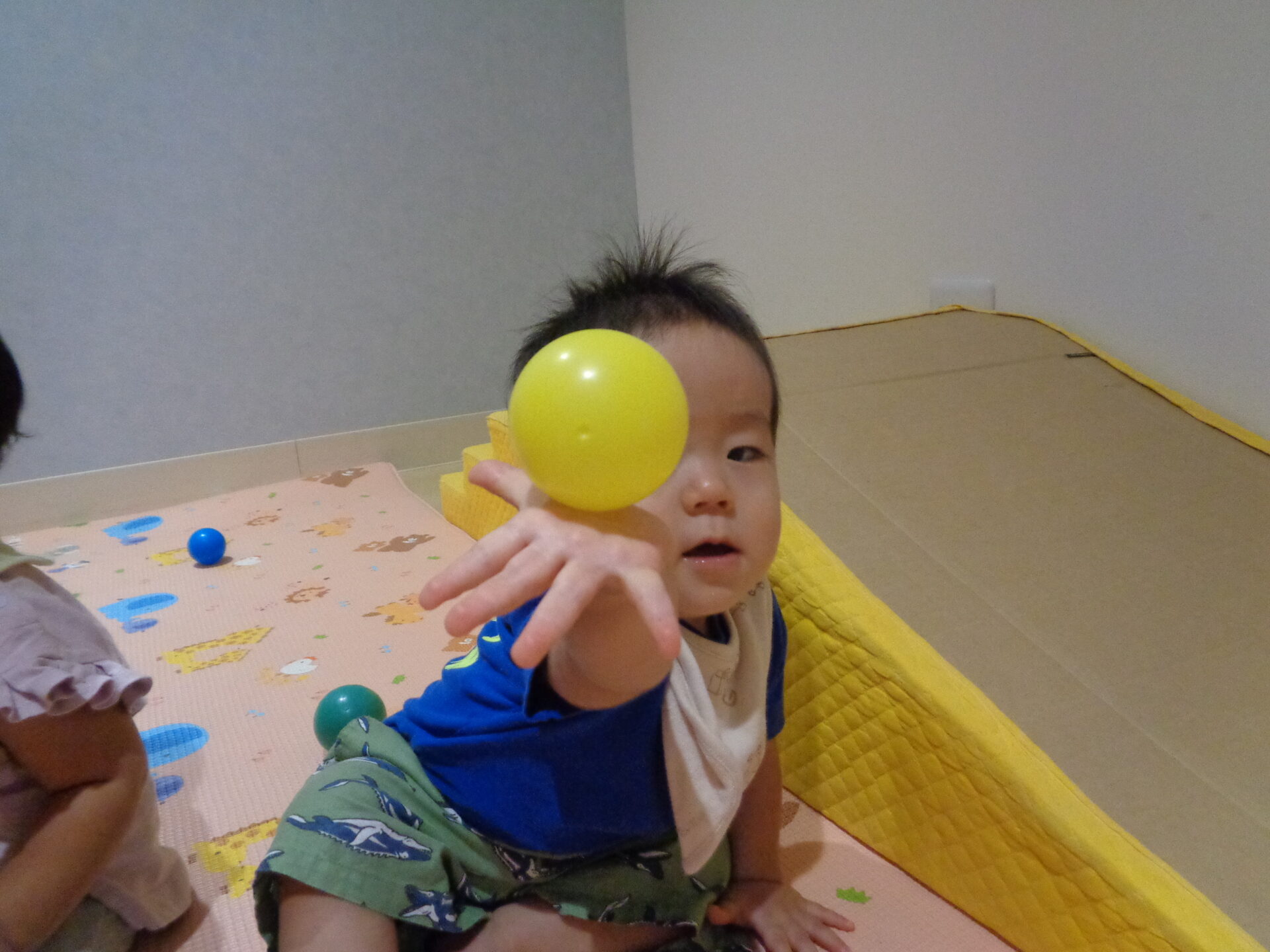 今日は雨が降りそうな天気だったので、うみ組はお部屋でボールプールを出して、遊びました。