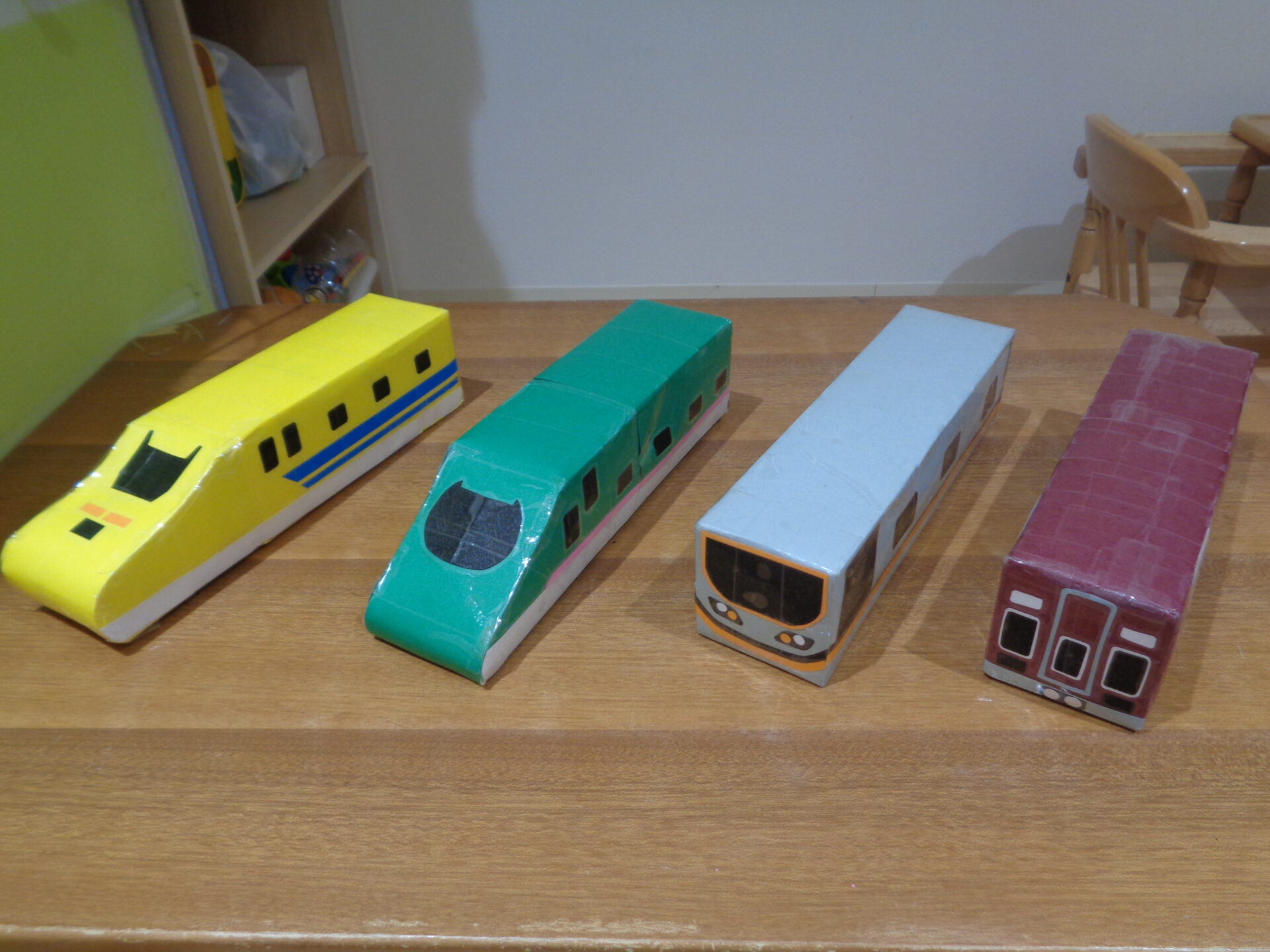 牛乳パックの中に丸めた新聞紙を入れて、周りの窓やライトなどは、画用紙で作っています。