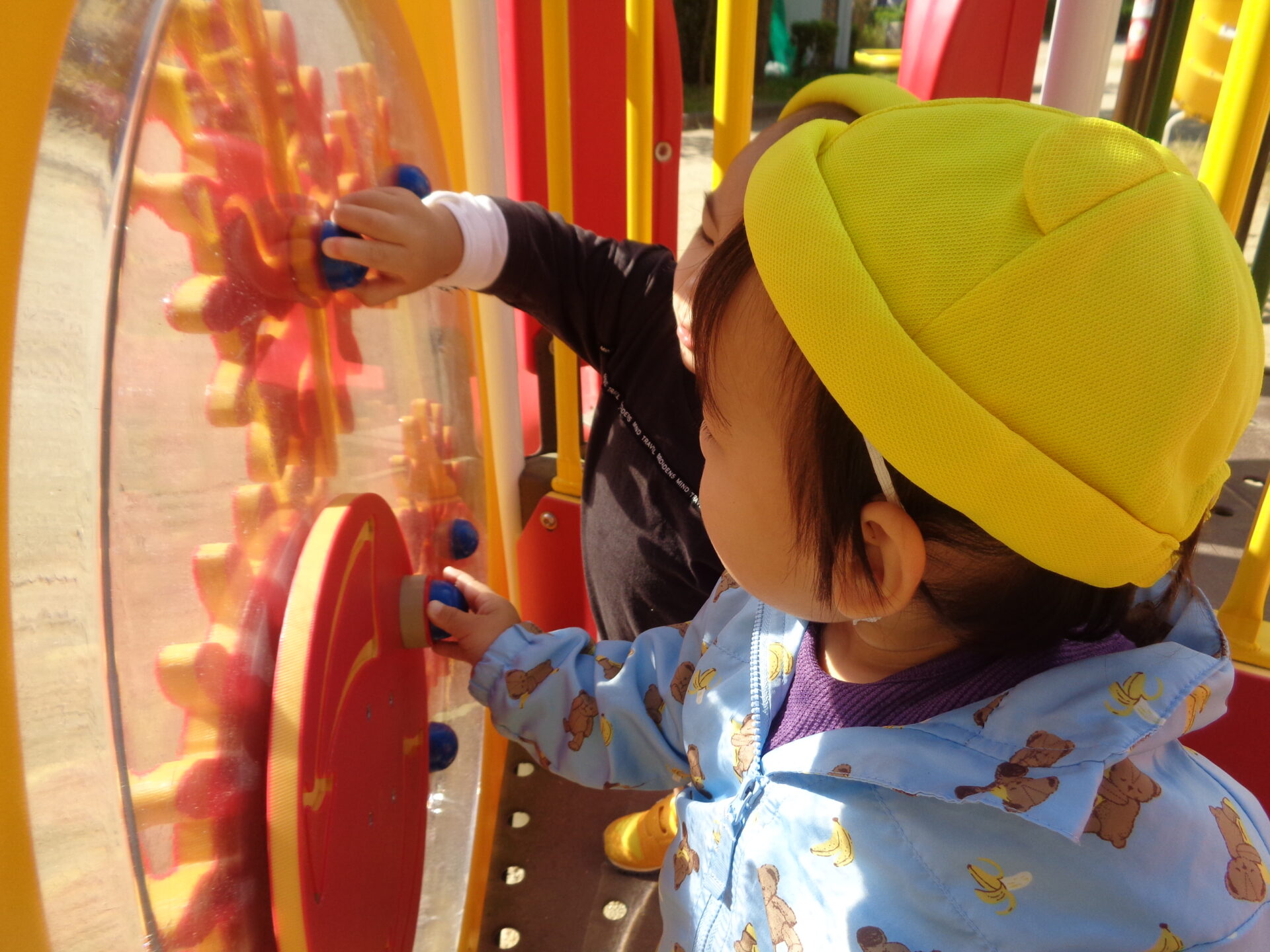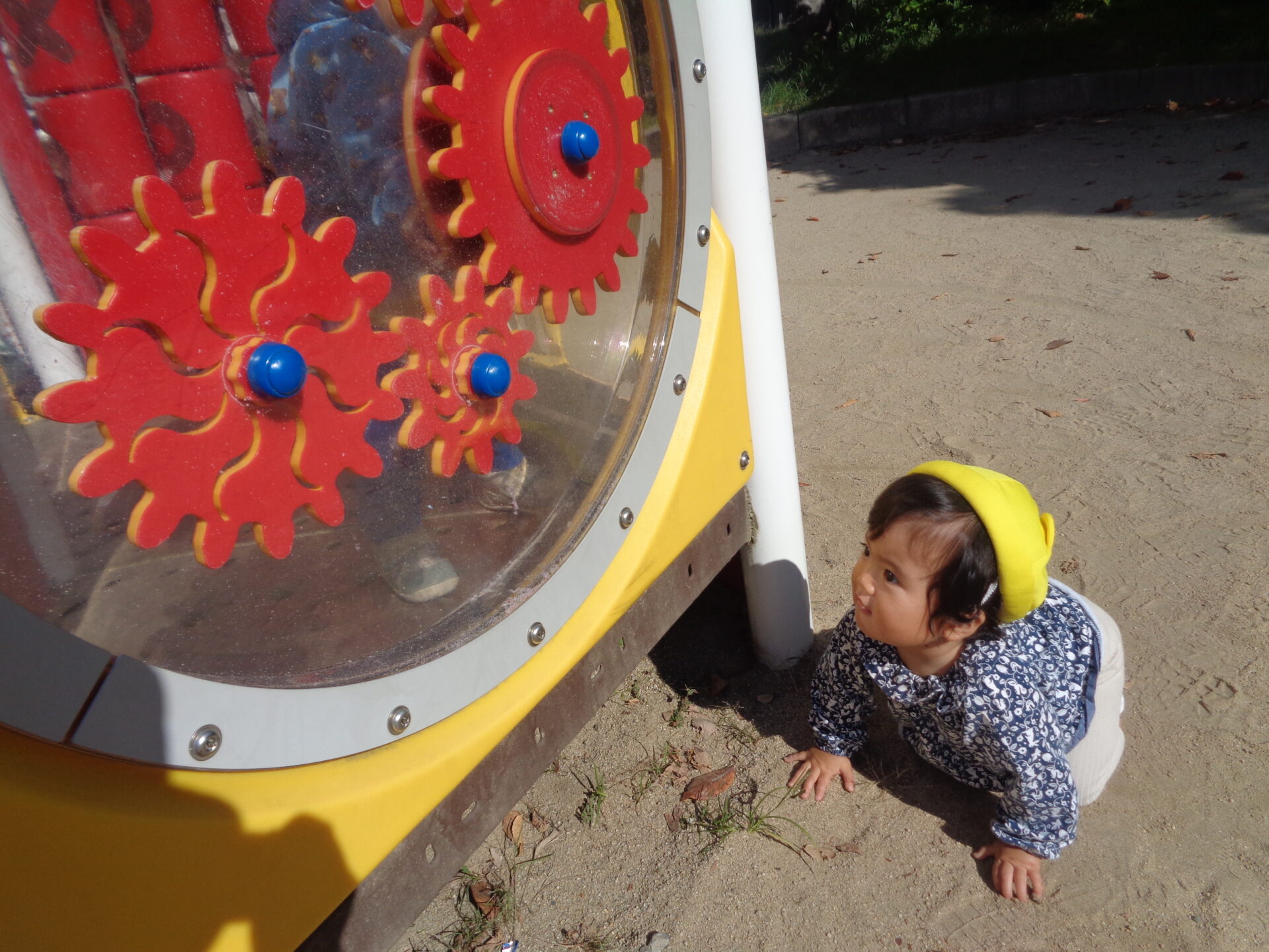 この歯車が動いたのが気になり、「どうなっているんだろう?」と覗き込みに行くお友だちもいました!