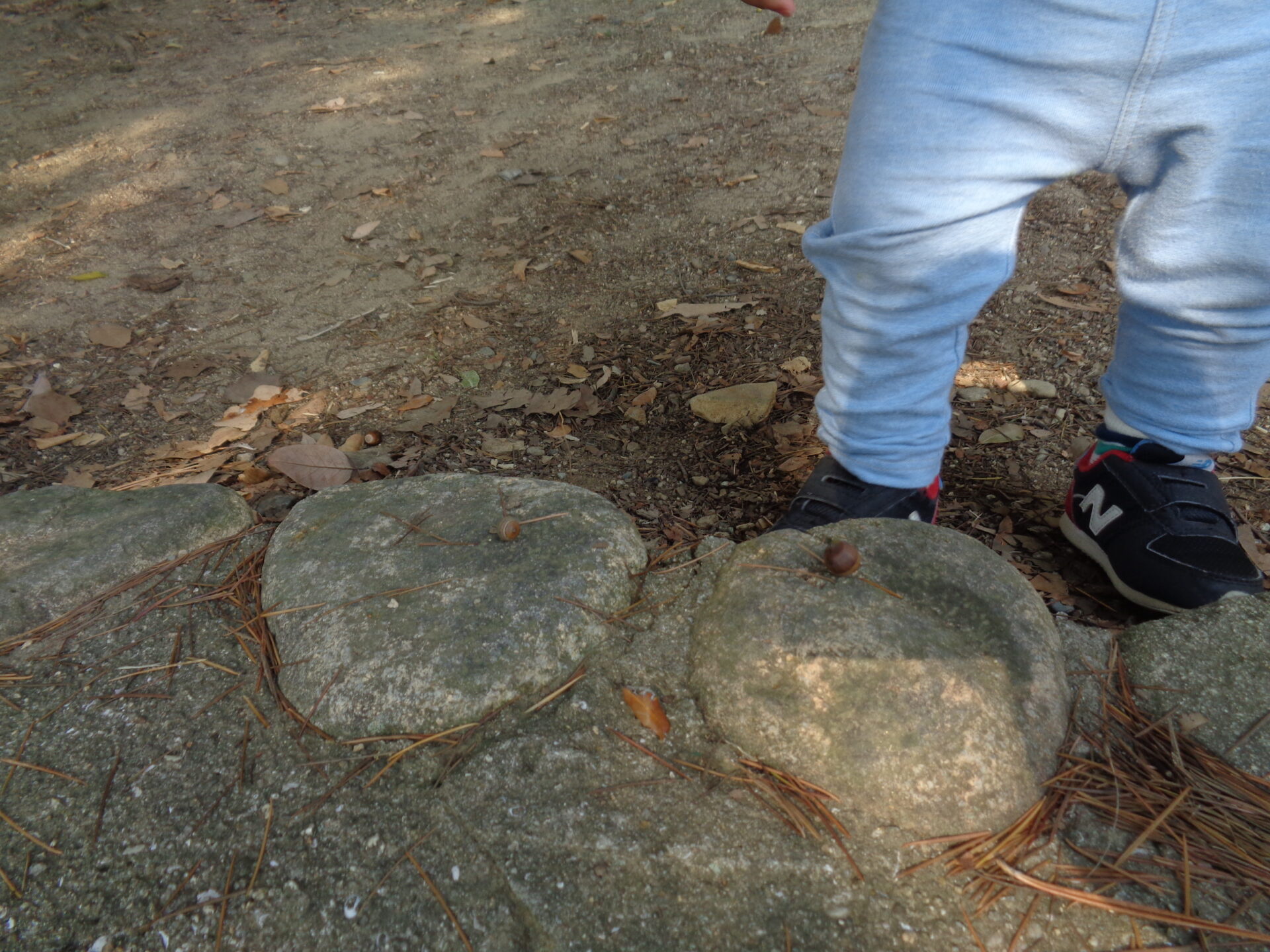 石がでこぼこなので、どんぐりがすぐにころころ転がってしまい、途中で心が折れそうになっていましたが、なんとか二つ乗せることができて満足そうでした^^