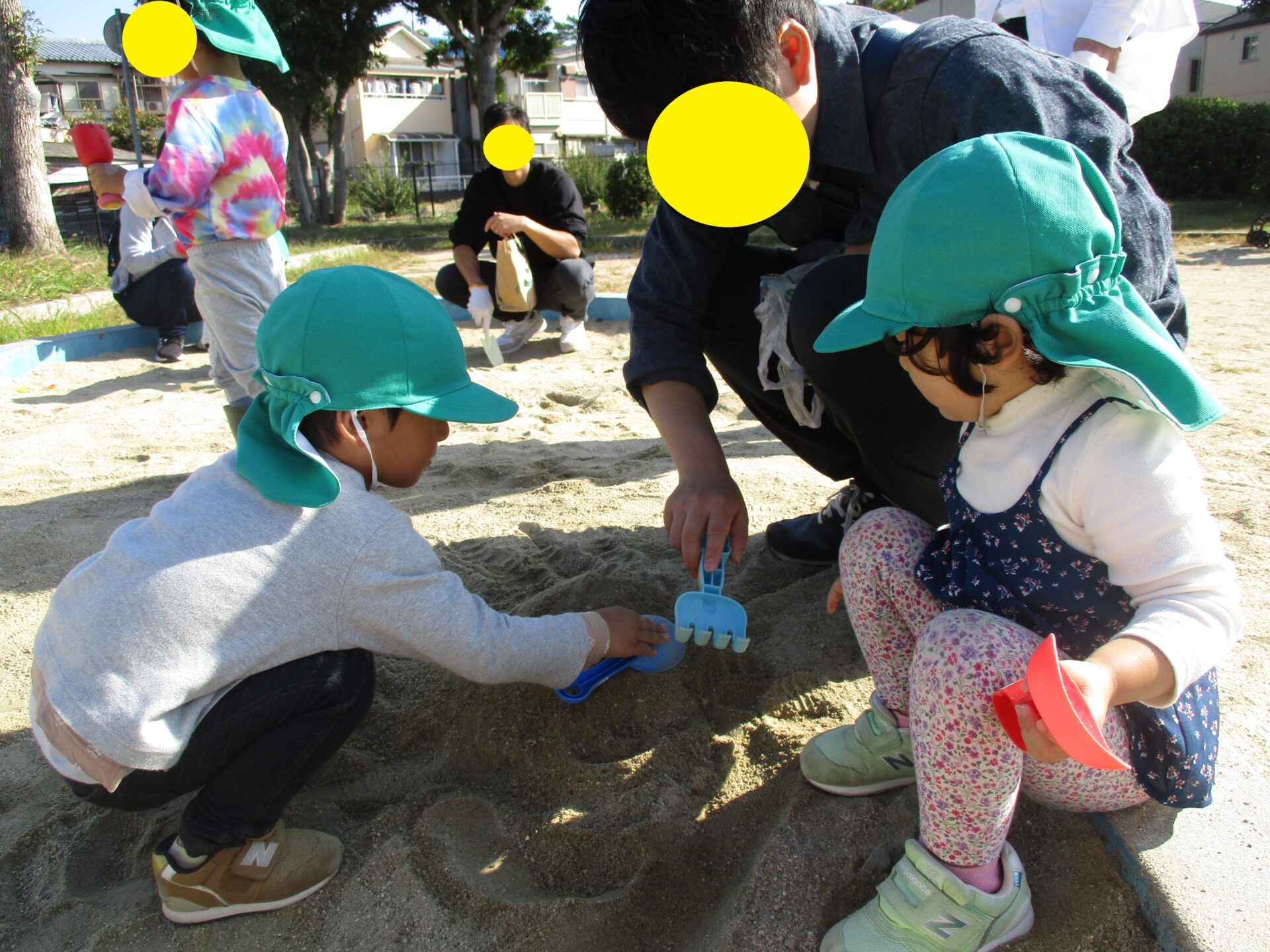 保護者の方と一緒に「どこかな~?」「ここかな~?」と言いながら、土を掘っていきます。