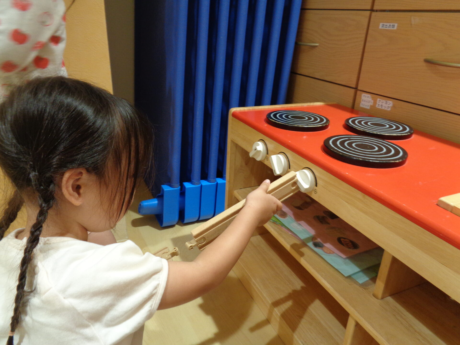 キッチンで二人で遊んでいると、調理をしていた子が、コンロのつまみをカチカチ回し、