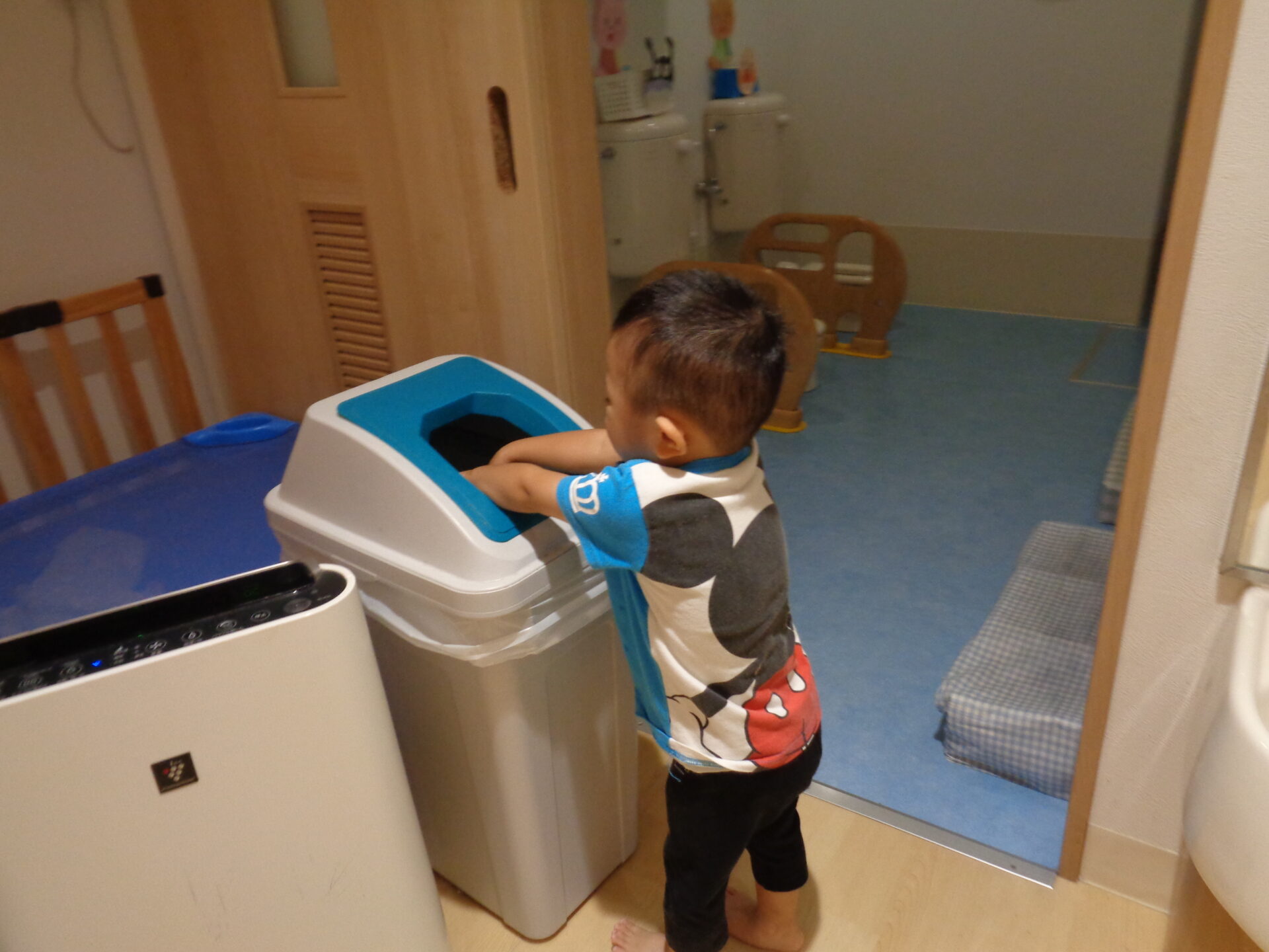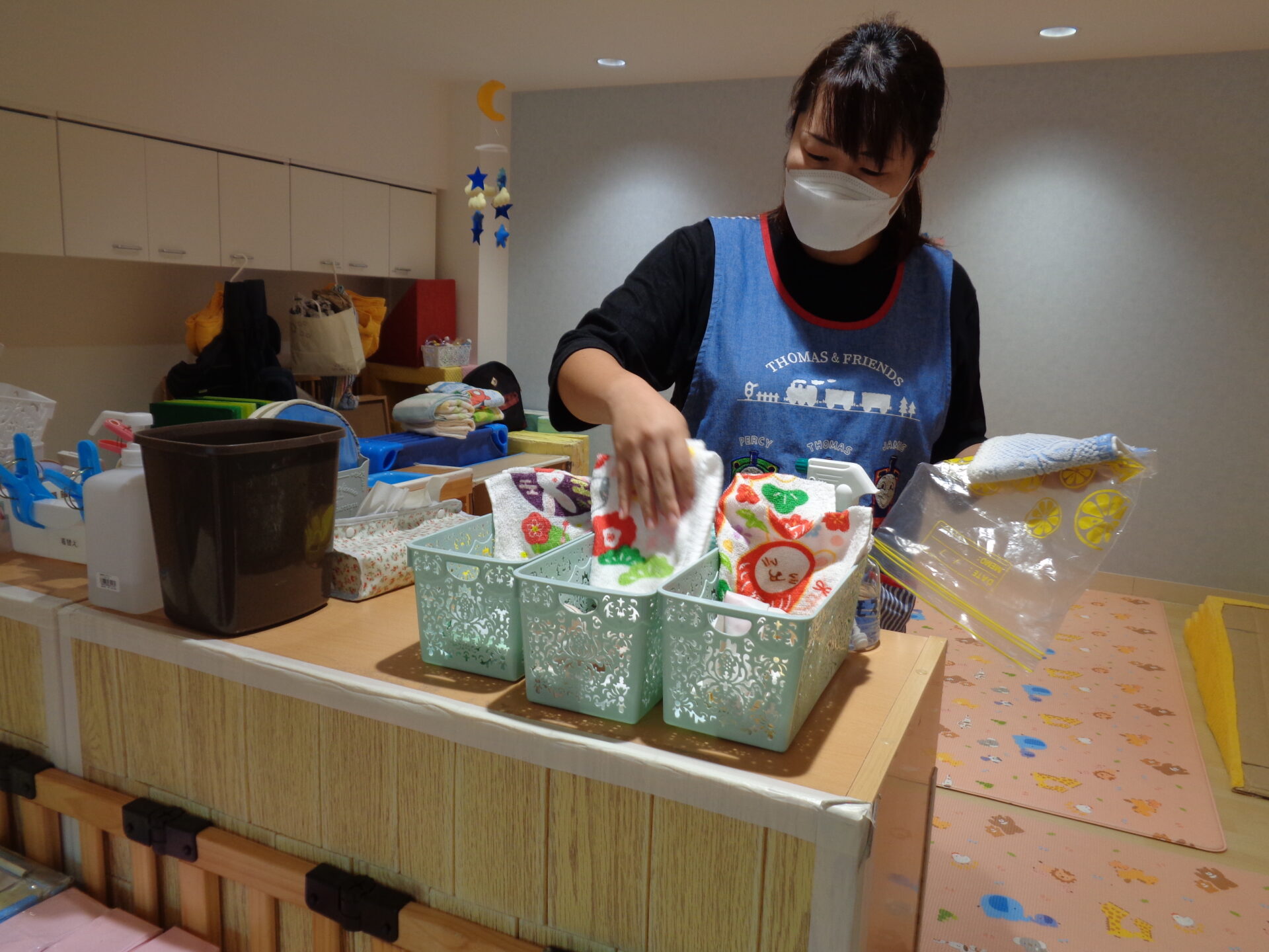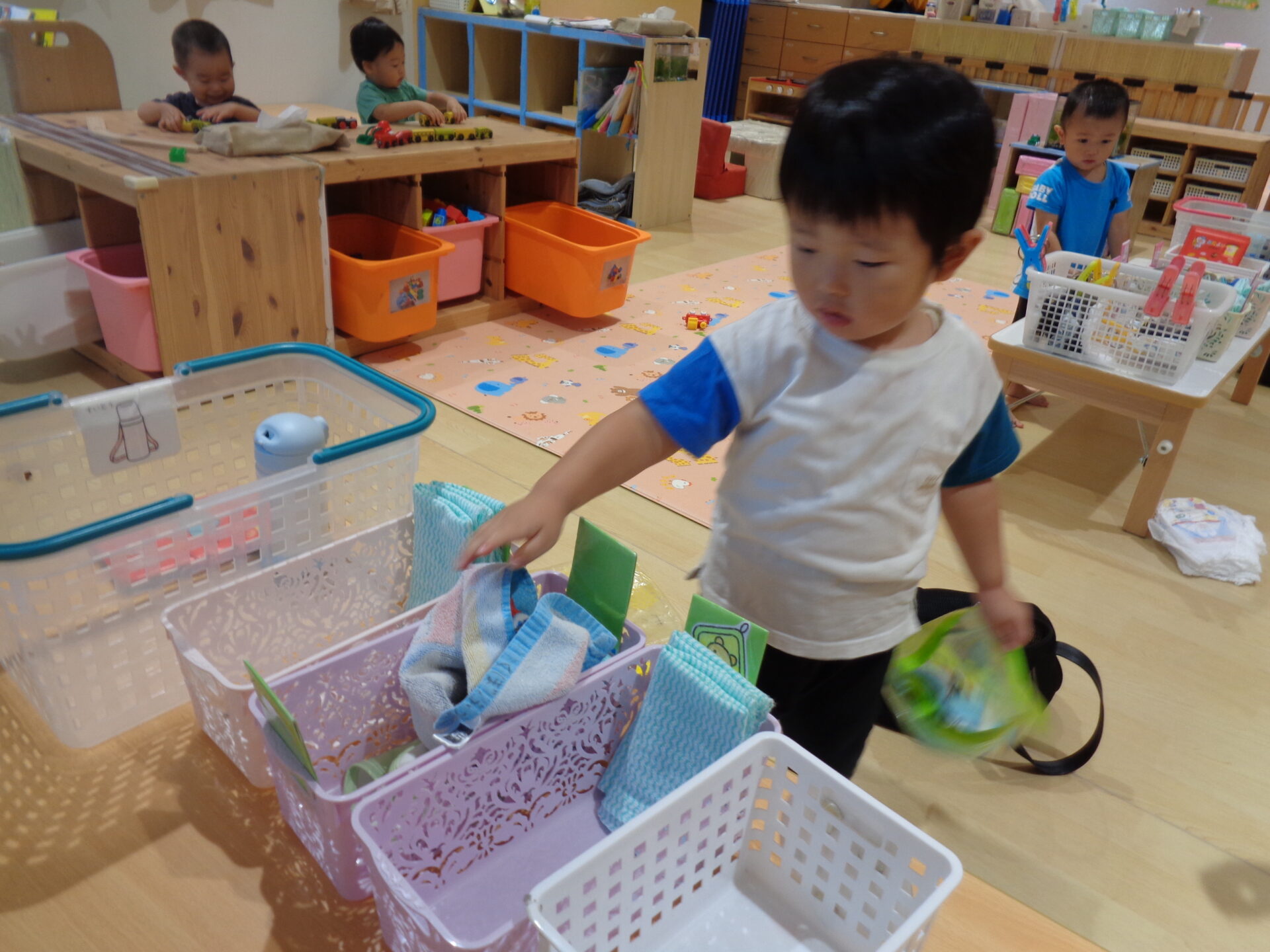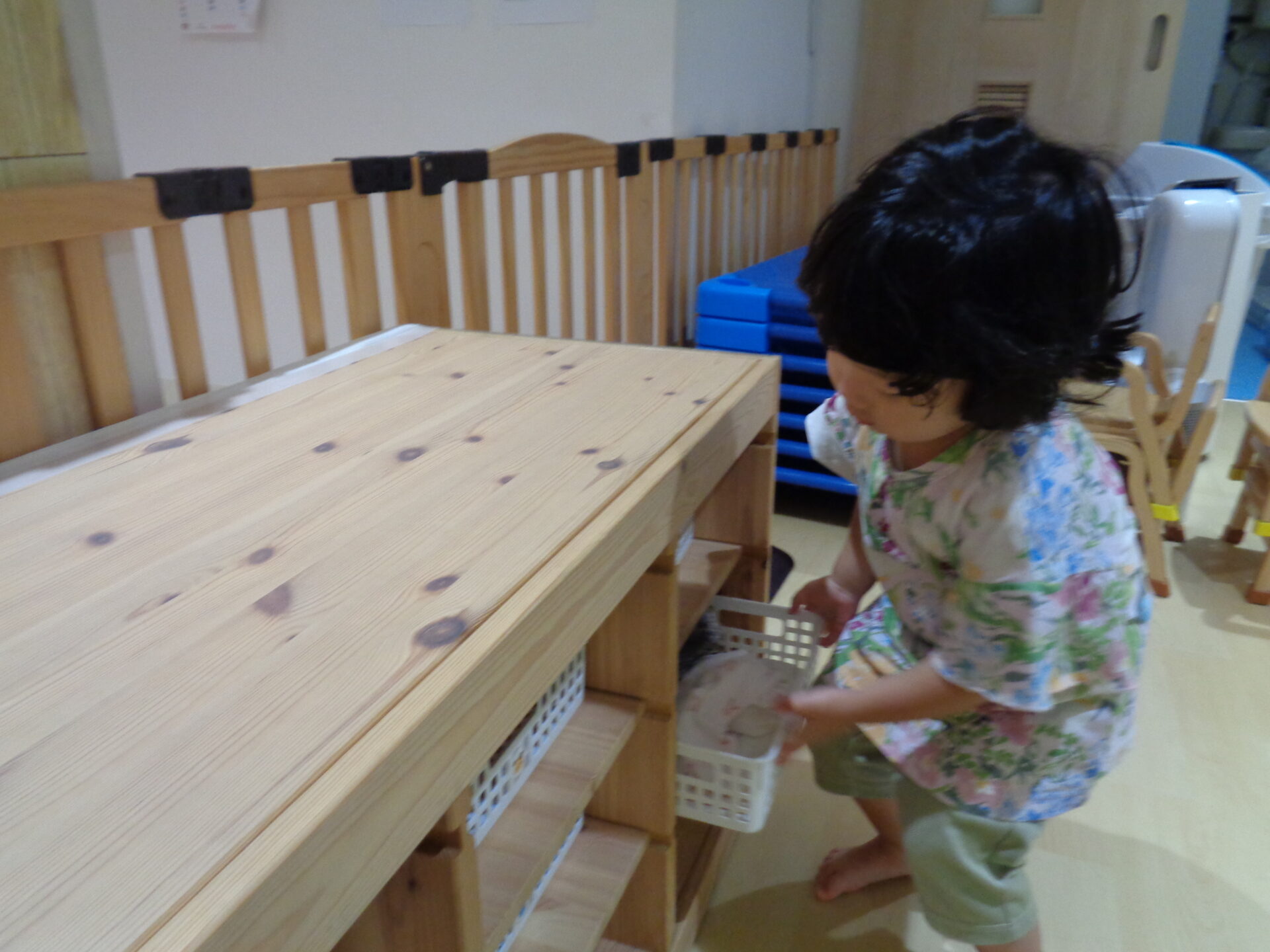 でもまだまだあめ組のように自分では出来ないので、保育士が「ここだよ」と声を掛けながら準備しています。