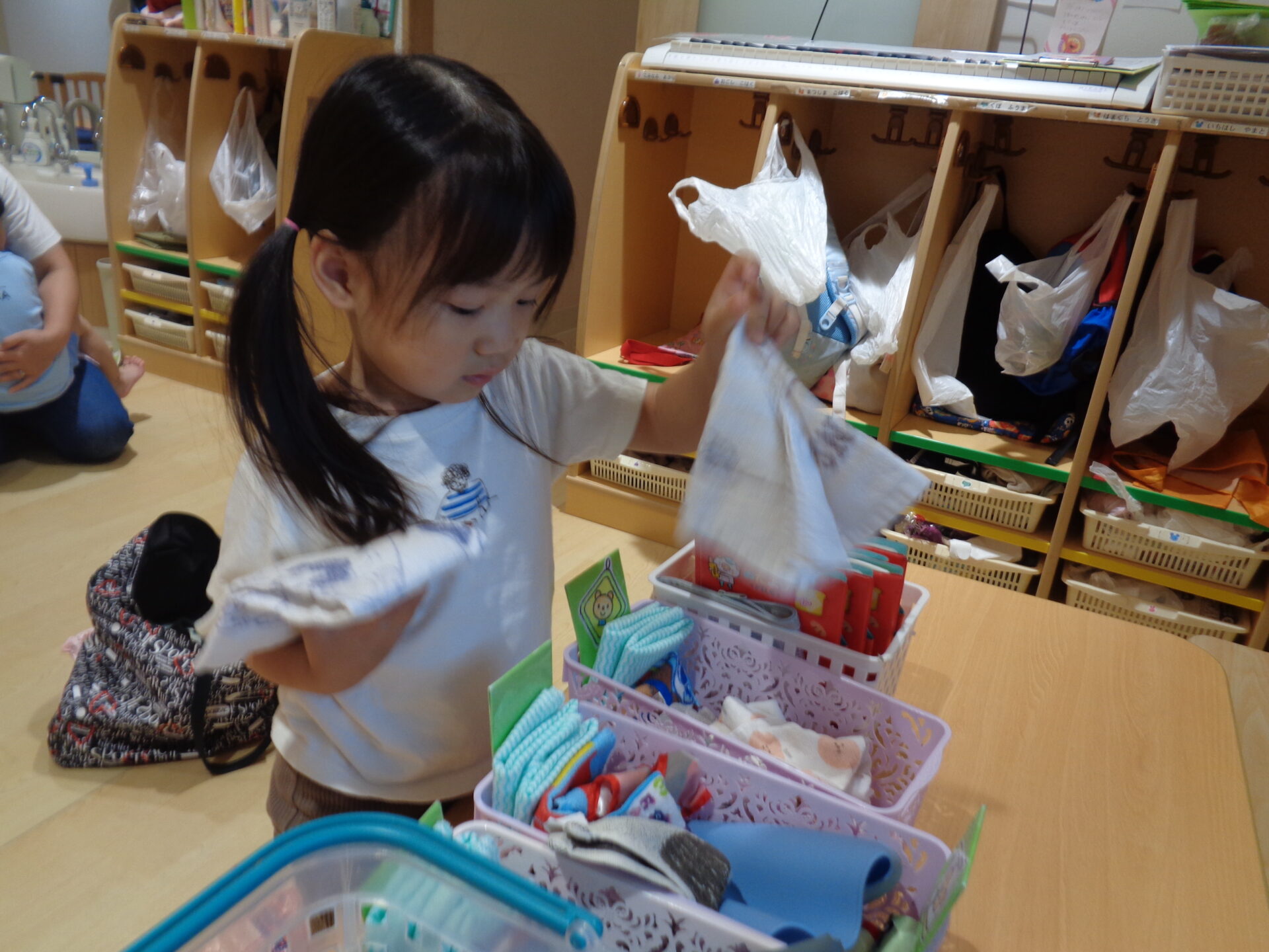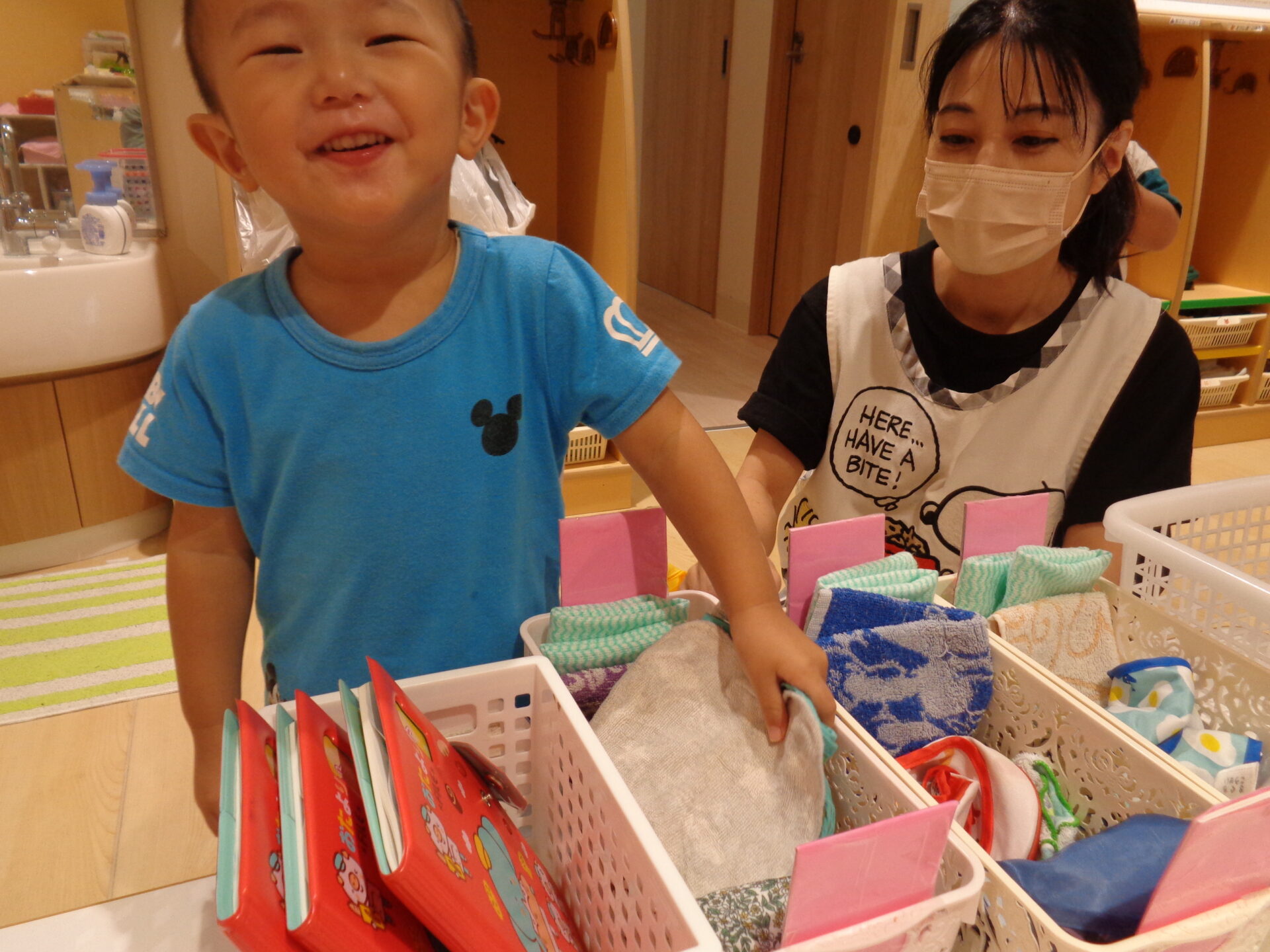 「この口拭きタオルは、給食の時に使うからここー!おやつはこれー!」