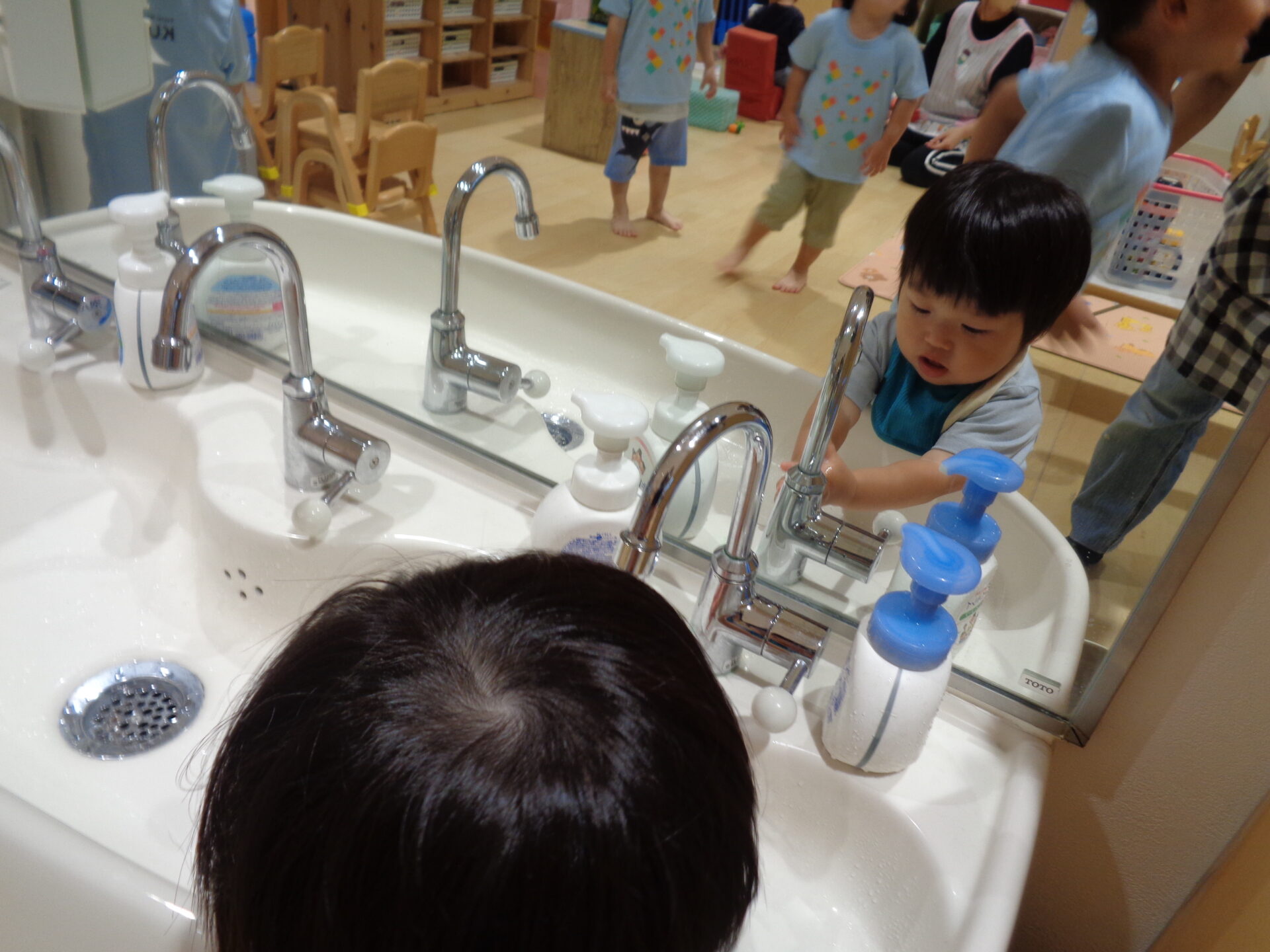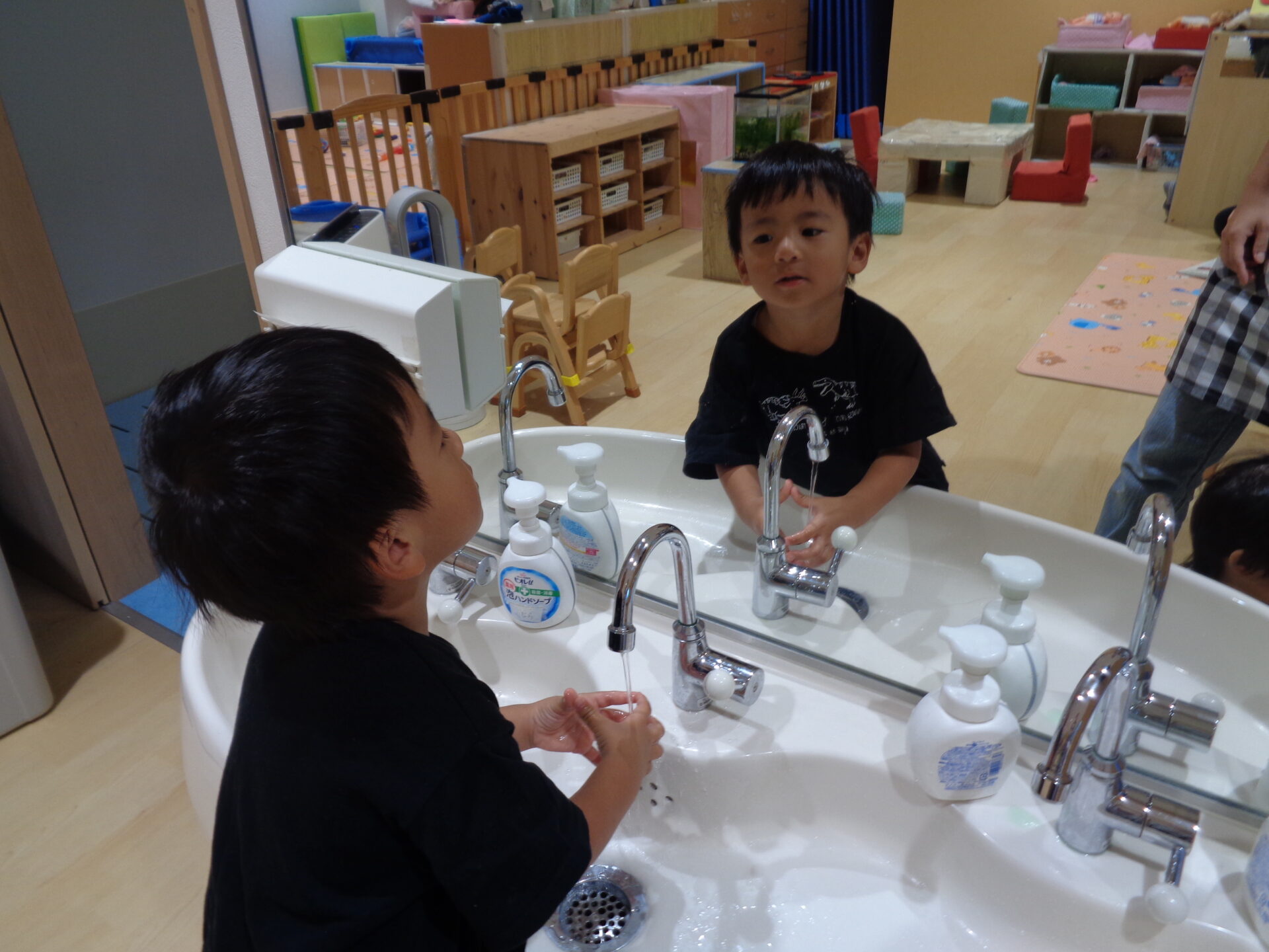 手を洗いながら、鏡で自分の顔をチェックする子もいて、鏡越しに目が合うと少し恥ずかしそうにする姿が、みんなかわいいです^^