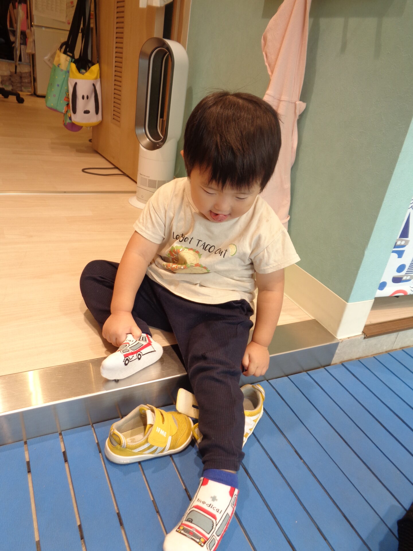 なかなか靴を脱ぐスイッチが入らない時や、練習中の子には、「ベリベリするよー」と、マジックテープを剥がす声掛けをし、まだ難しい子には、手を添えて一緒に脱いでいます。