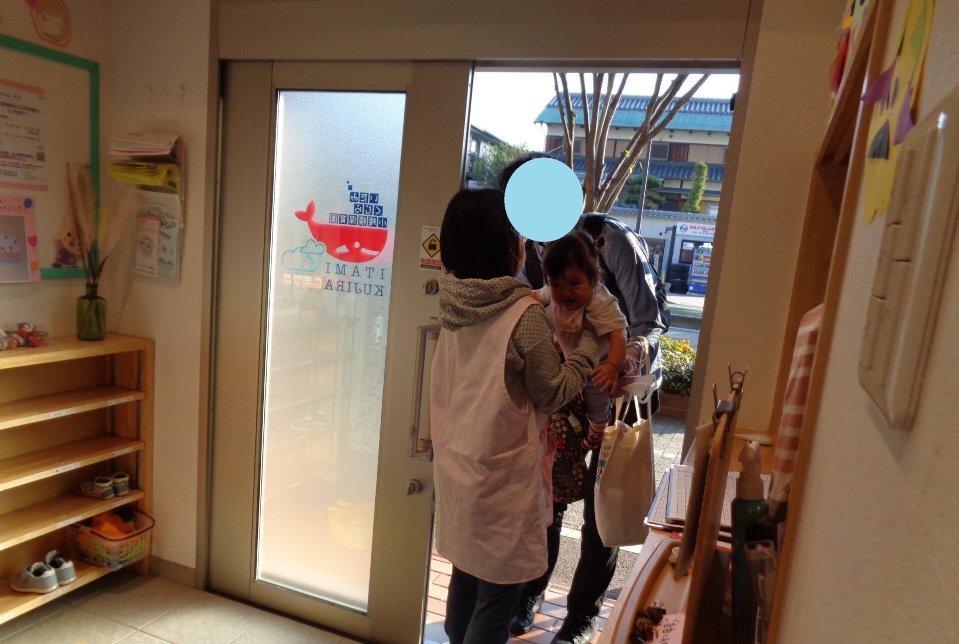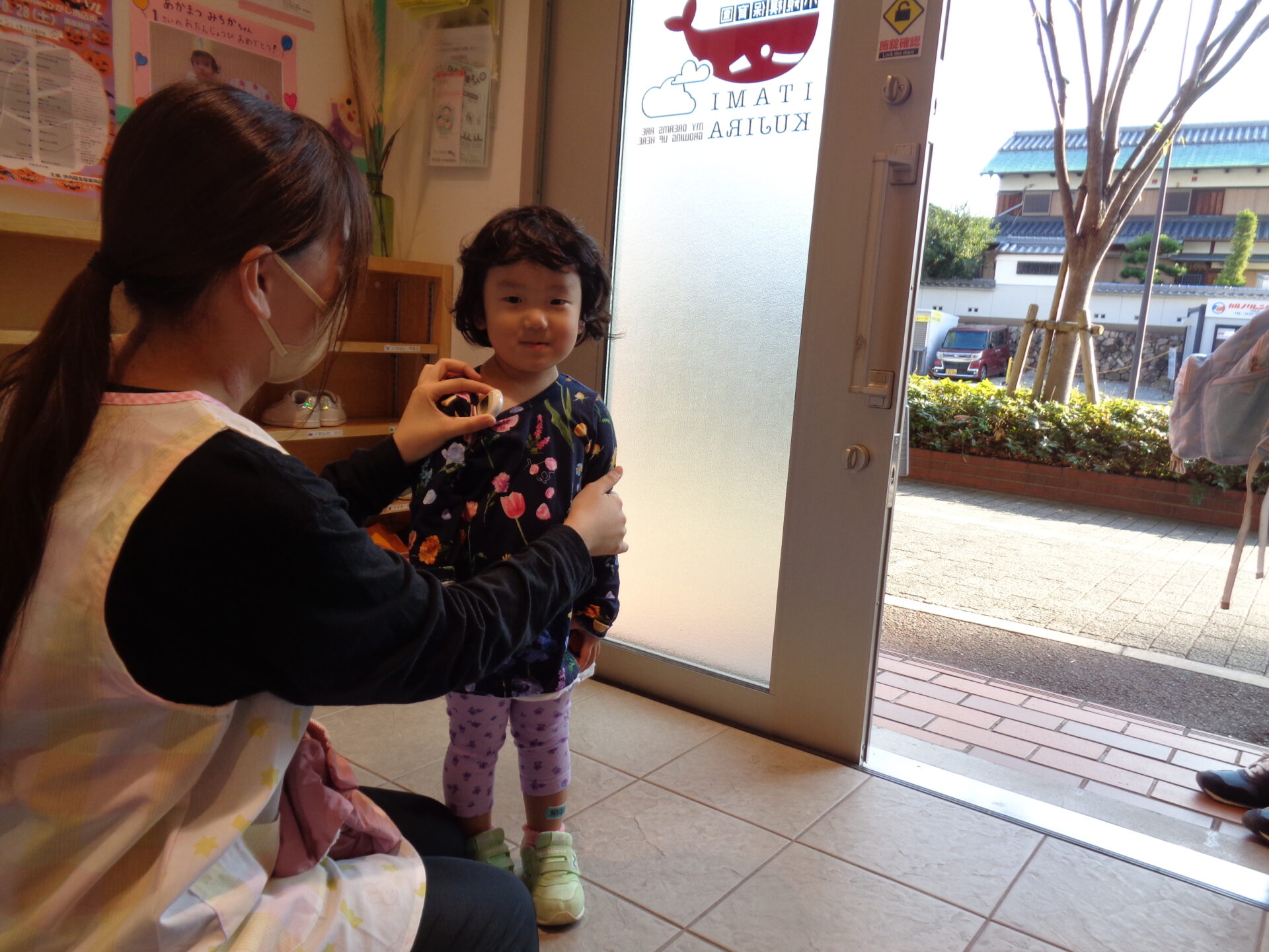 朝、登園時は玄関で受け入れをしています。