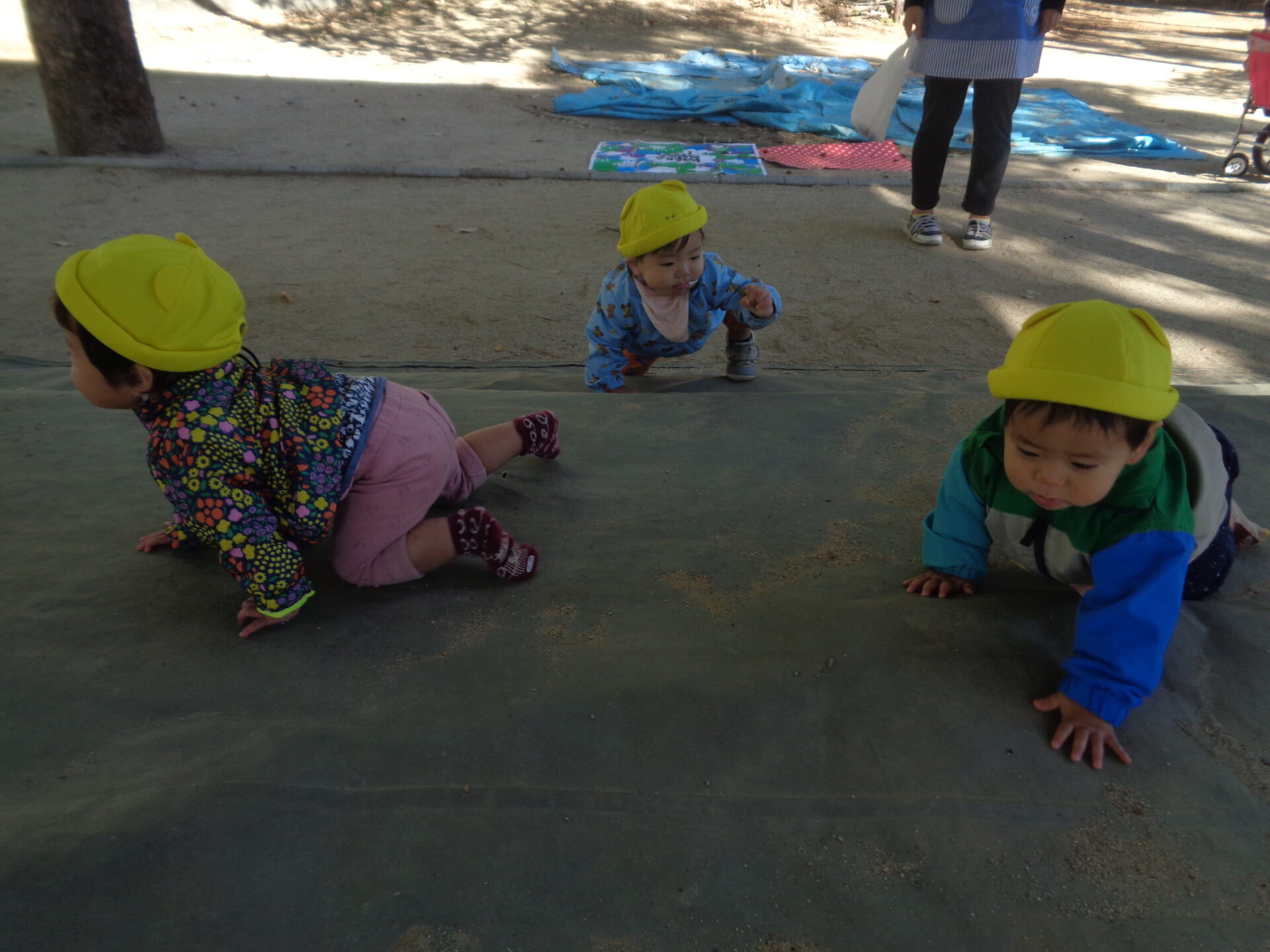 土俵の前に子どもたちを並ばせ、保育者が「よーいどん!」と合図を出しました。