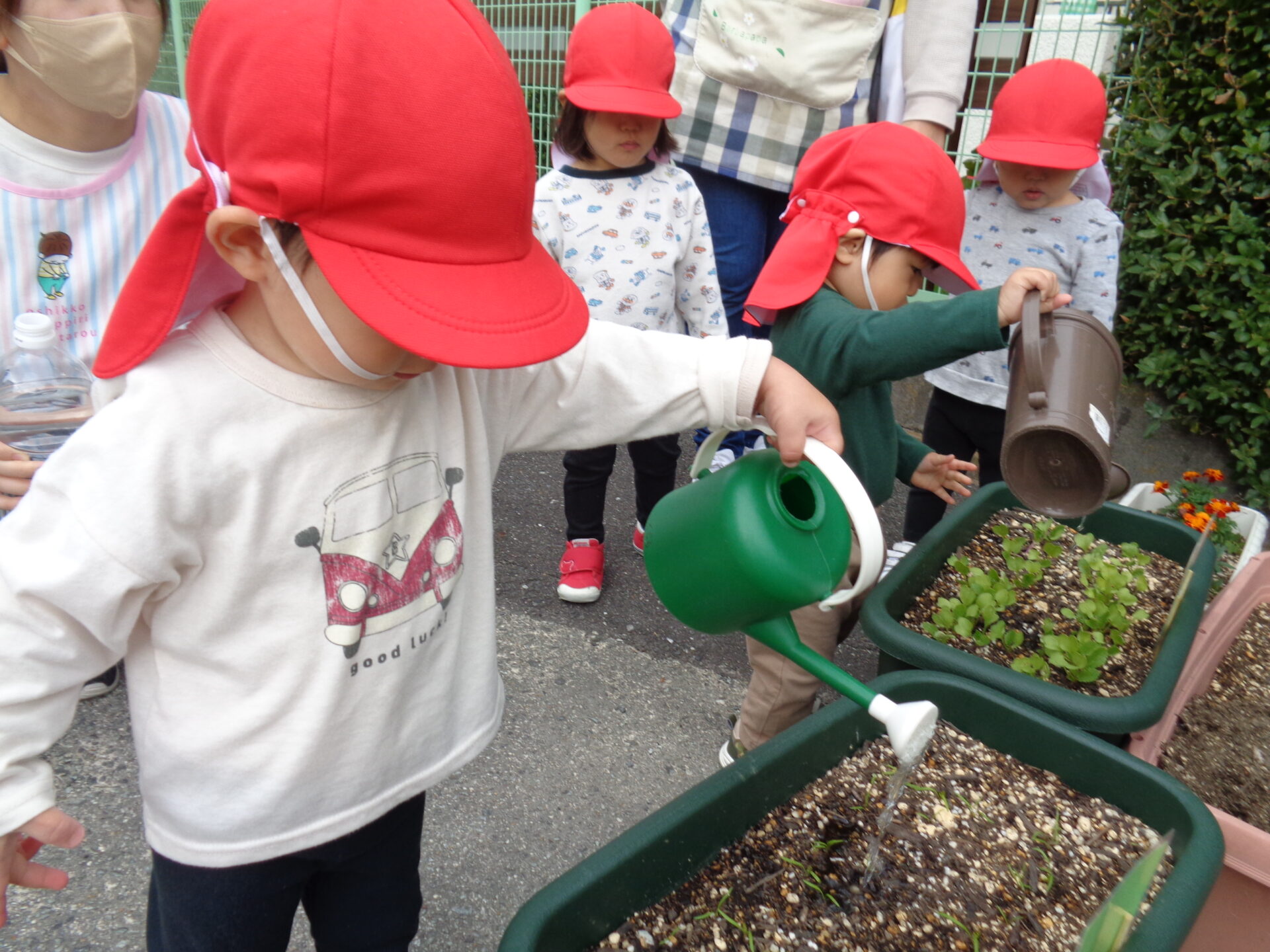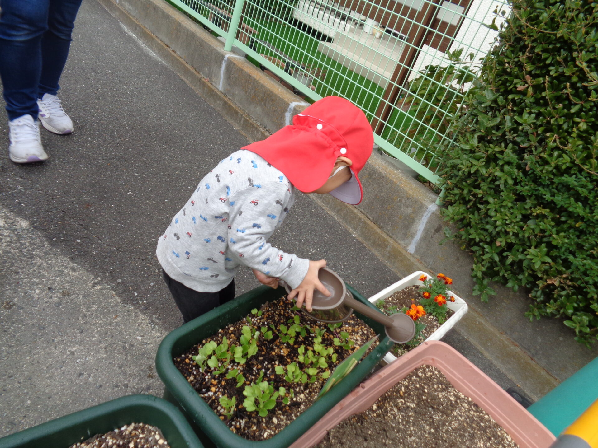 公園に行く前に、みんなで育てている大根とにんじんに、水やりをしました。