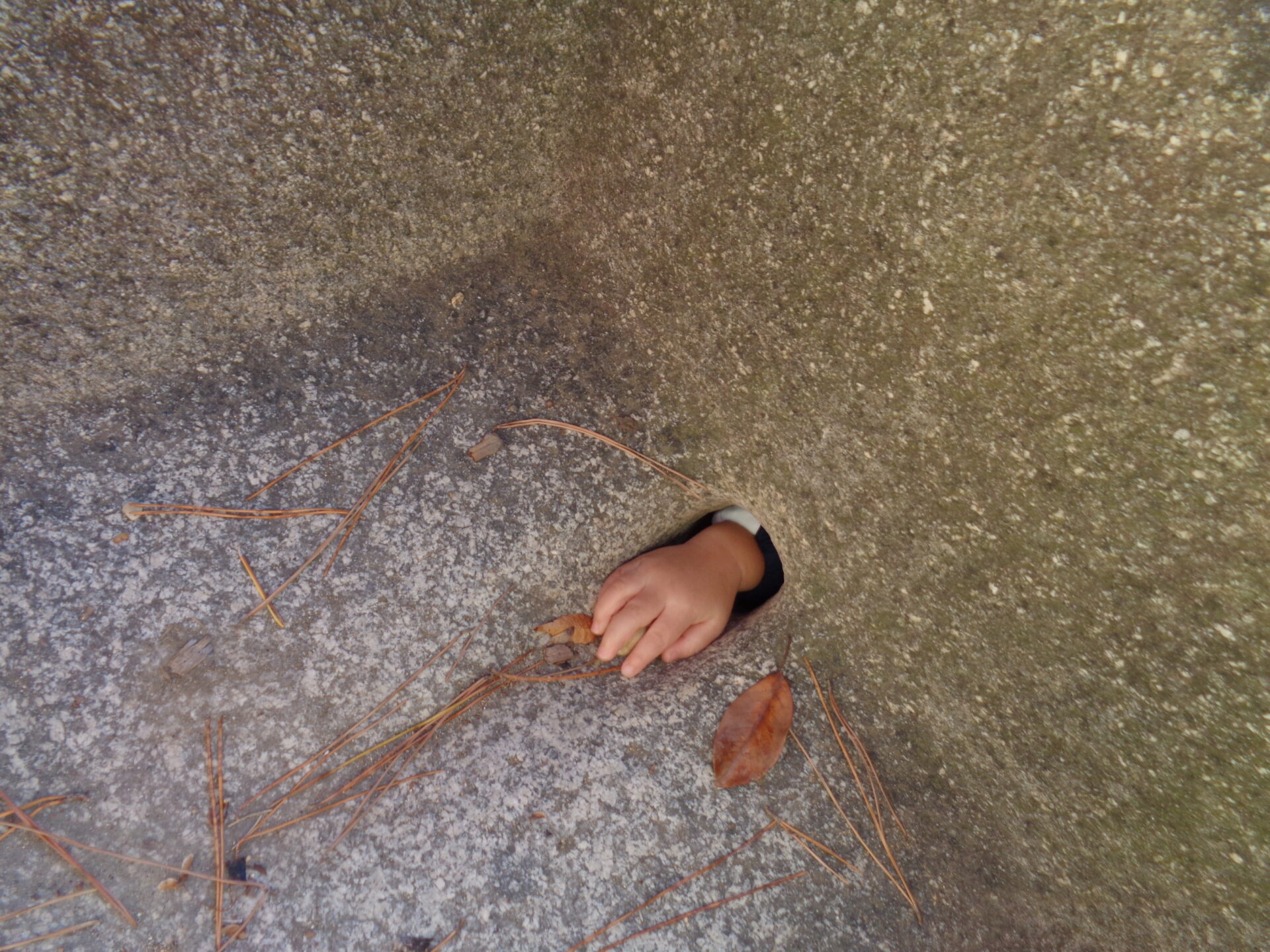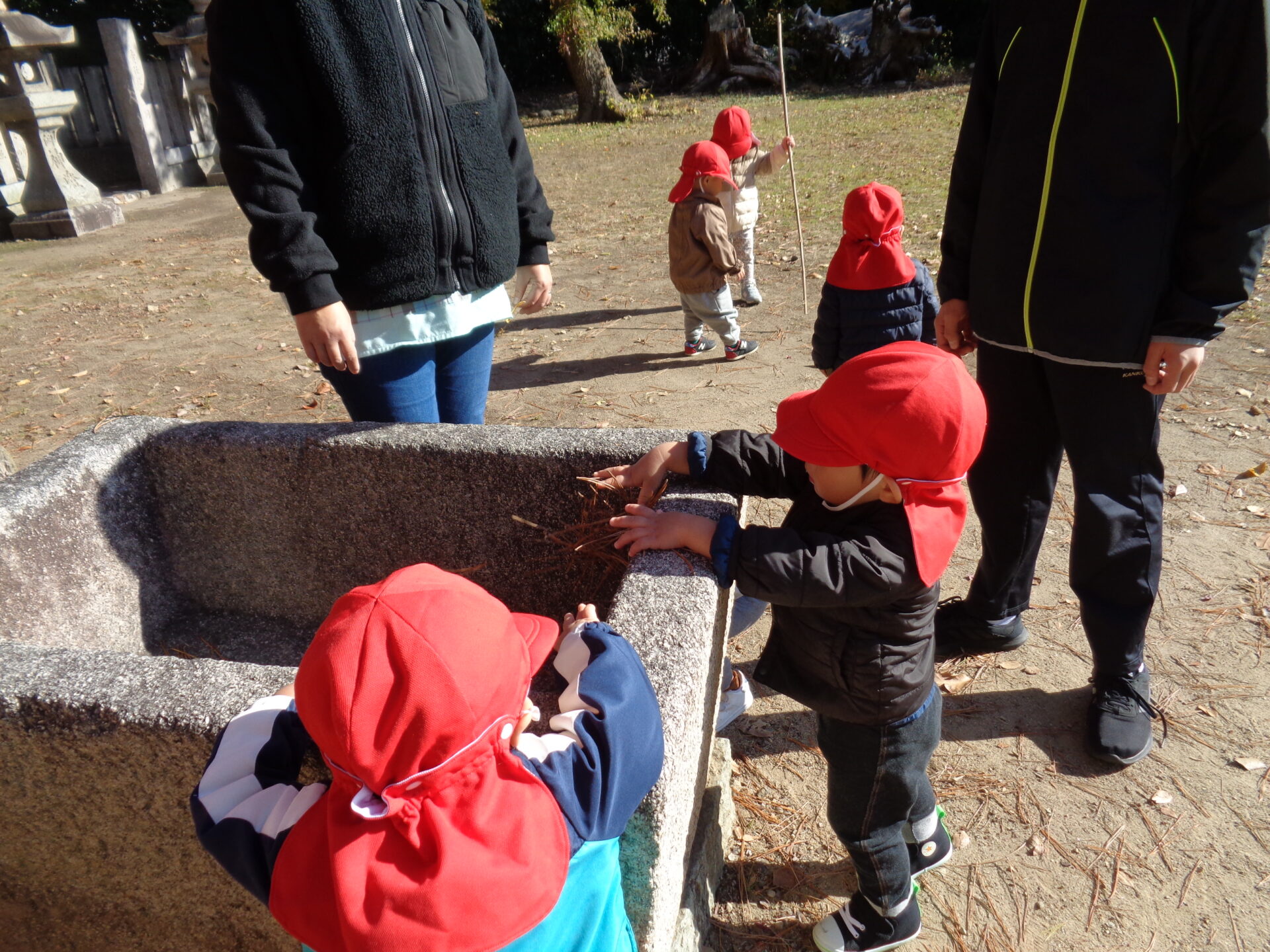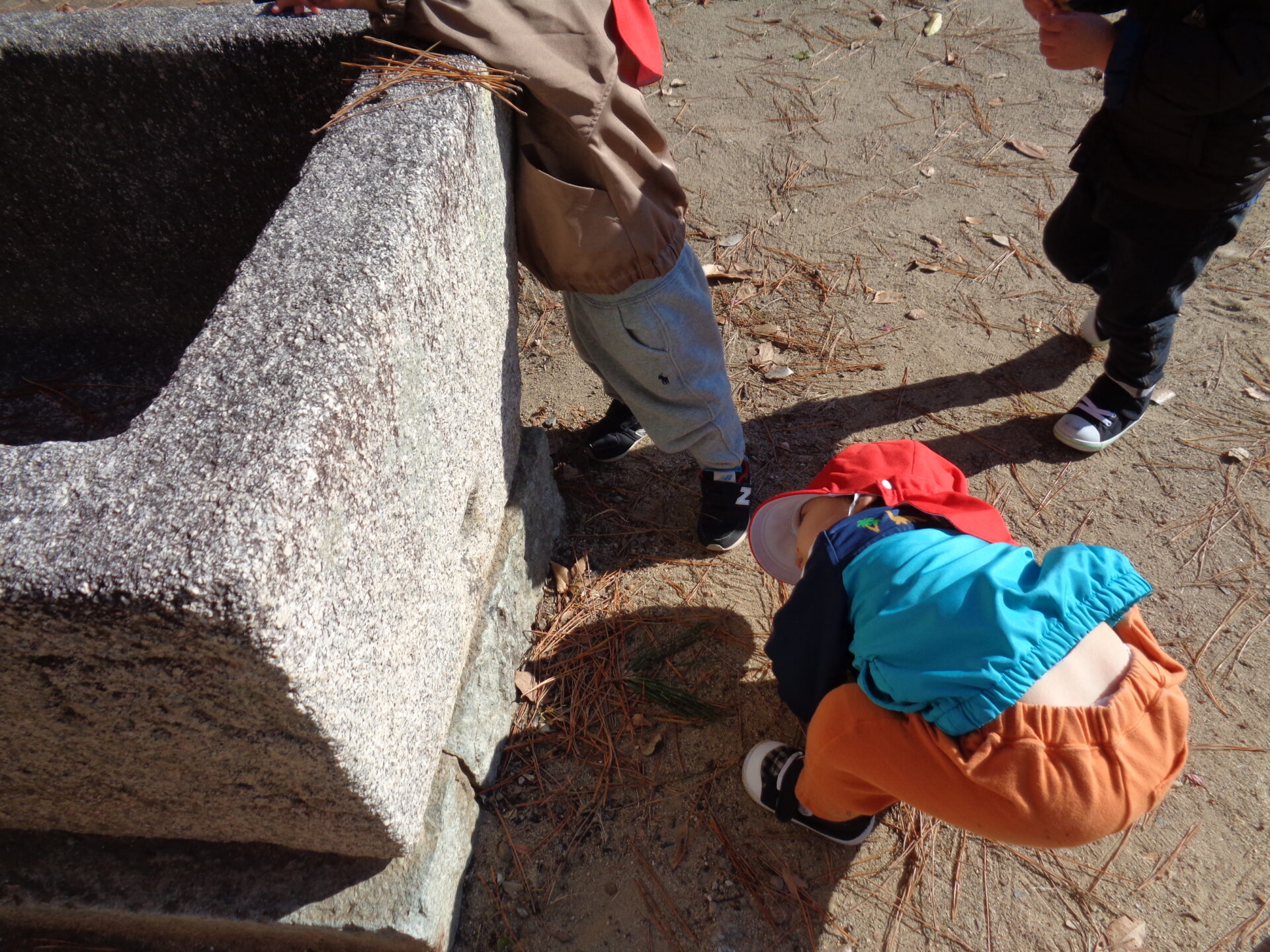 下に穴が開いているので、上から子どもたちが石や松の葉を入れたものを穴から出すと、「出てきた!」と大喜びでした✨