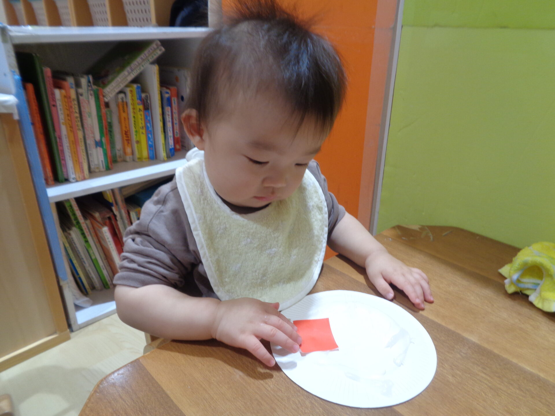 置いた折り紙をしっかり貼ろうと、手のひらで押さえたりしていました🤗