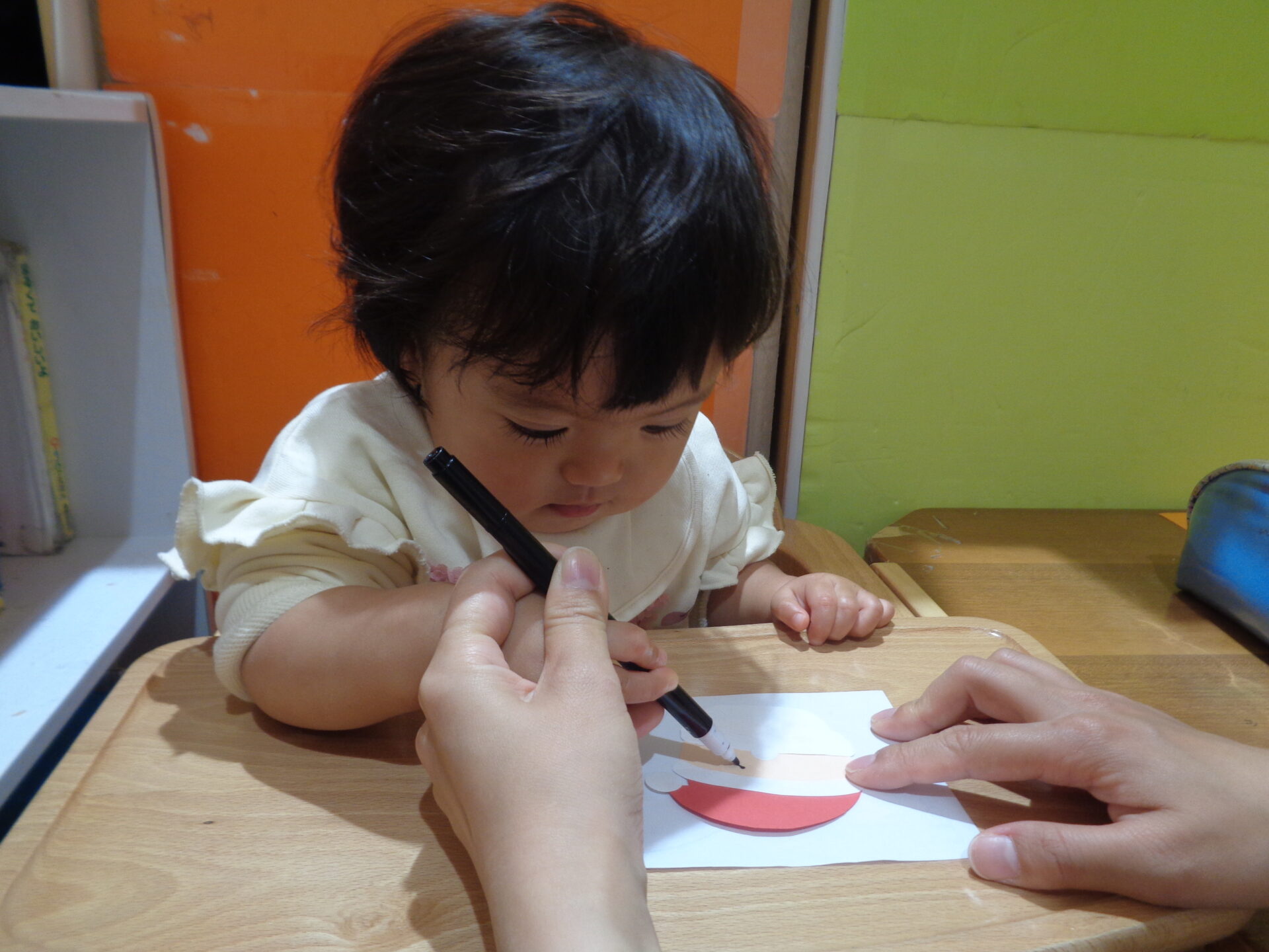 保育者と一緒にペンを持ち、サンタクロースの顔も描きました!