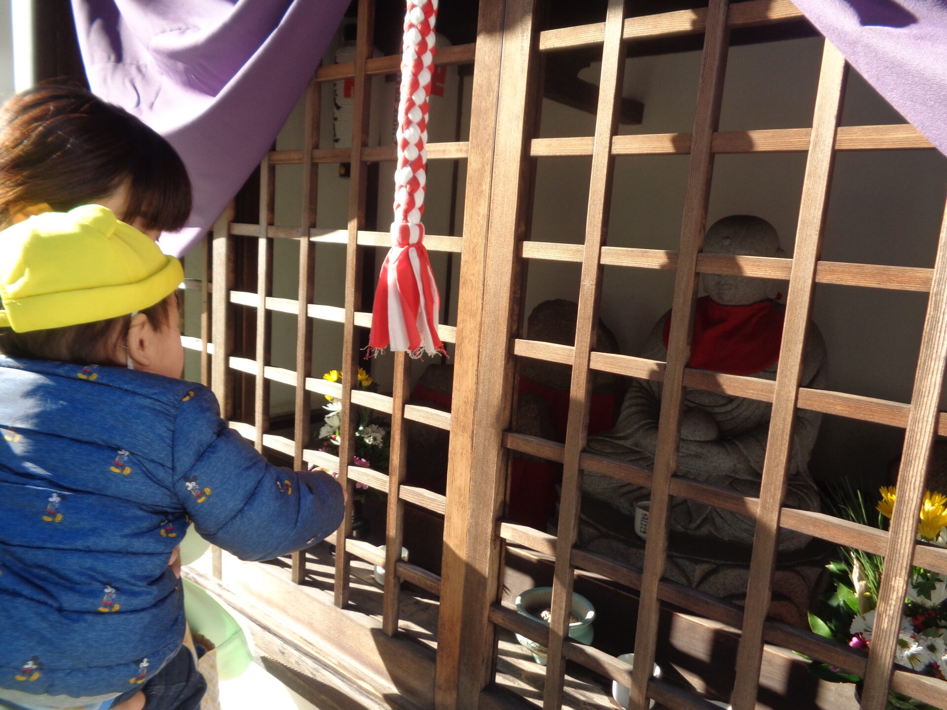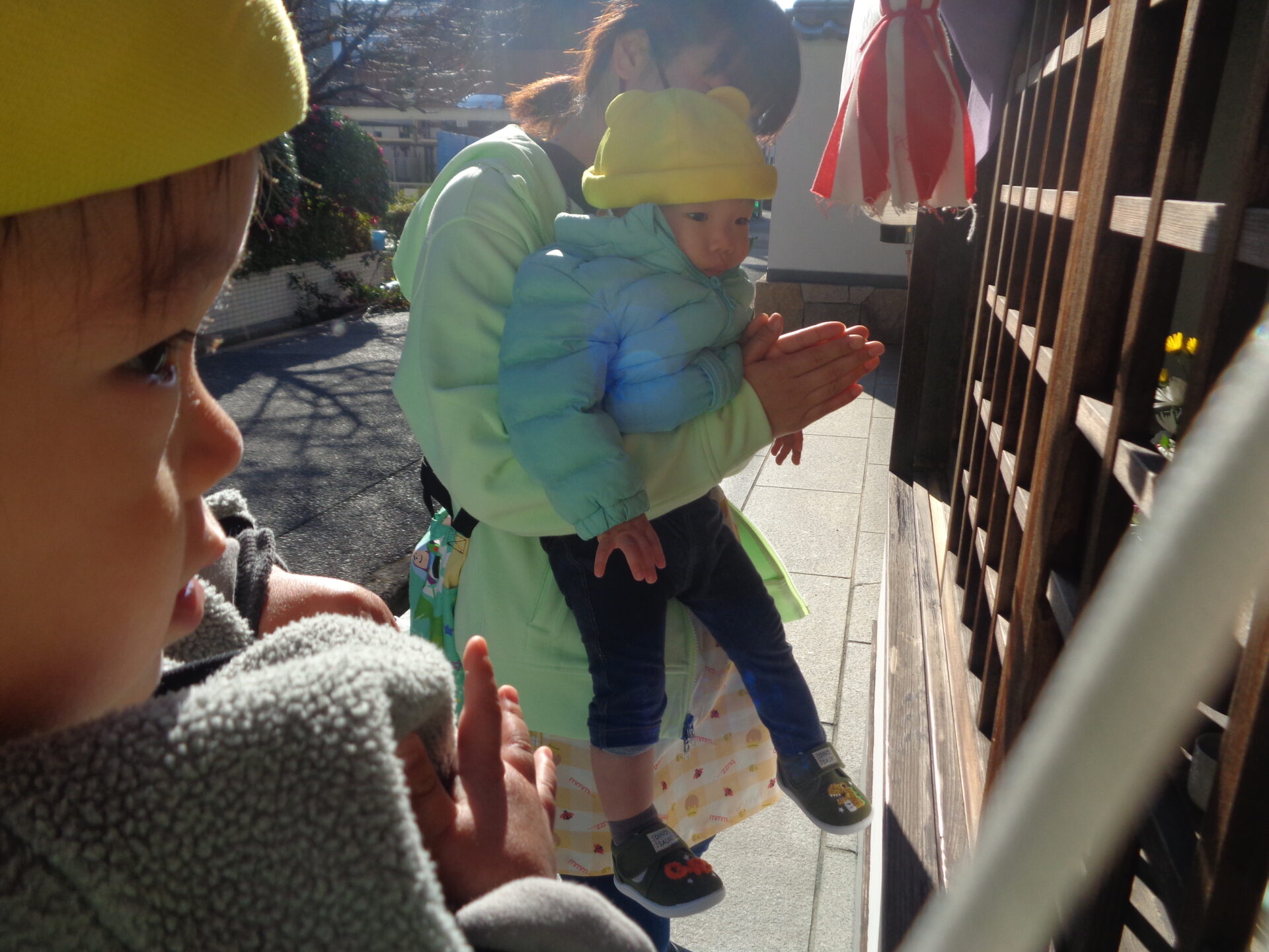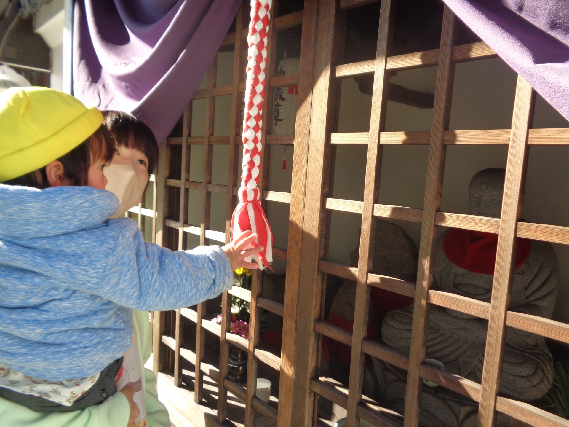 うみ組では、新年の挨拶をしに、近くのお地蔵さんの所へ行きました。
