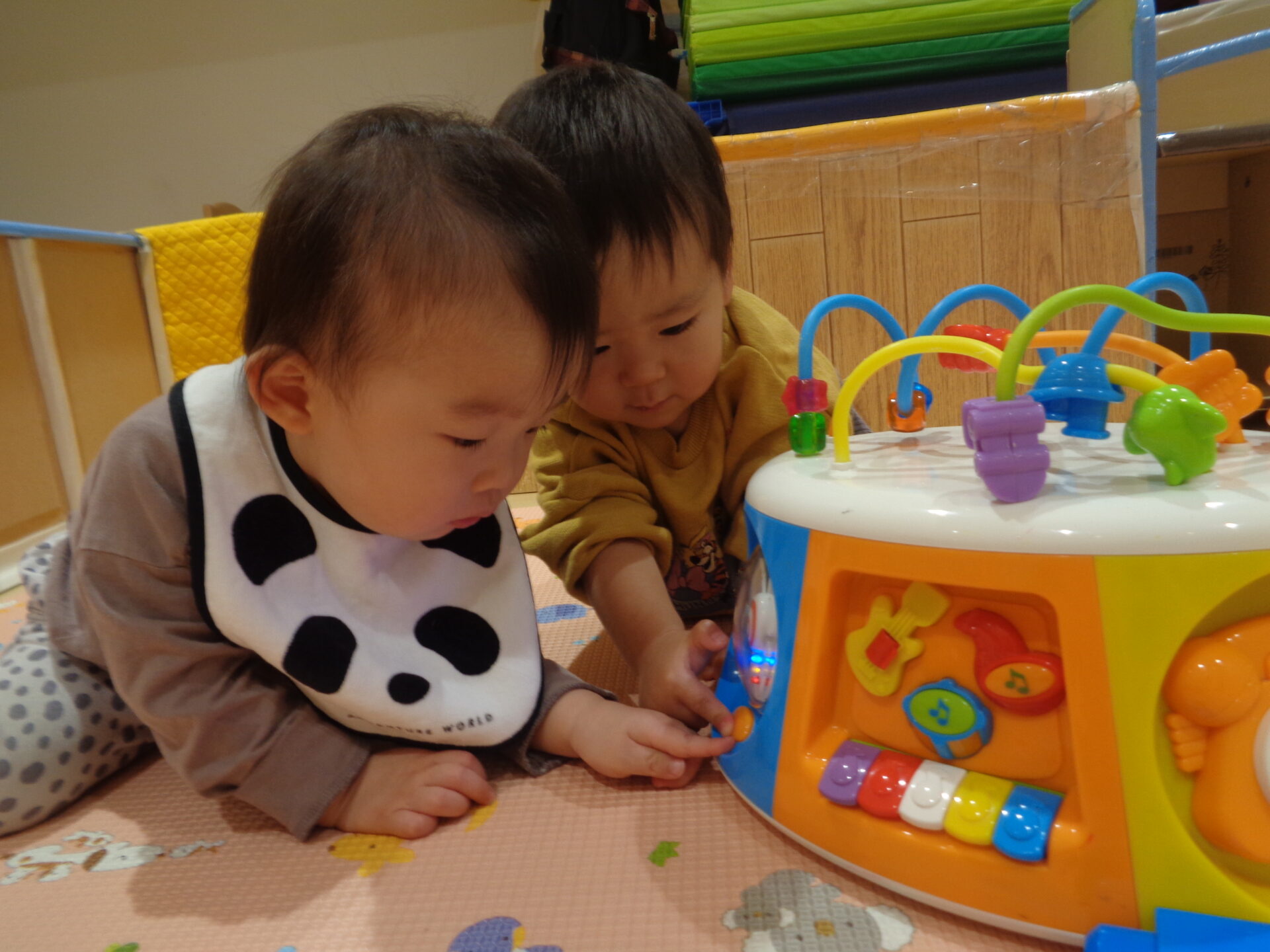 何か楽しそうな音が聞こえる!と音が聞こえる方へ向かい、”何をしているの~?”と覗き込みに行っていました。その後、2人で同じボタンを押して遊んでいました😄