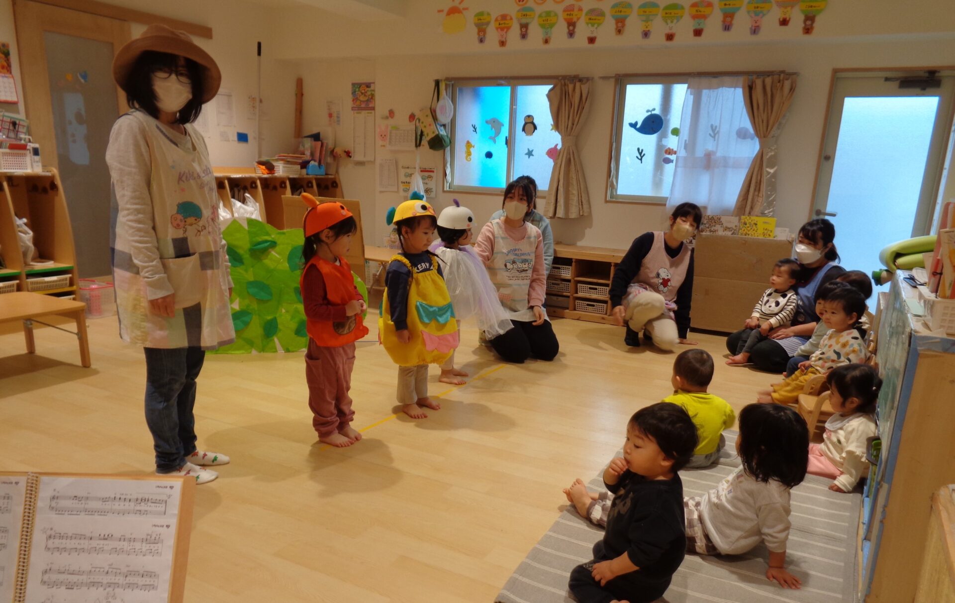 かわいい衣装を着たあめ組のお友だちを見て、何が始まるんだろう⁇という様子で見始めたうみ組・だいち組。