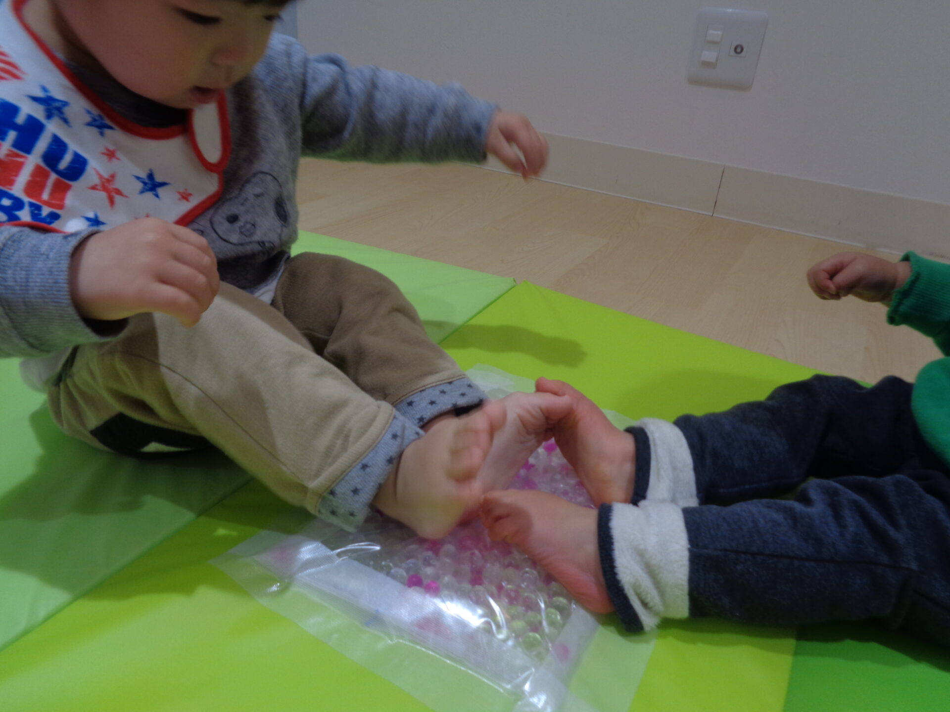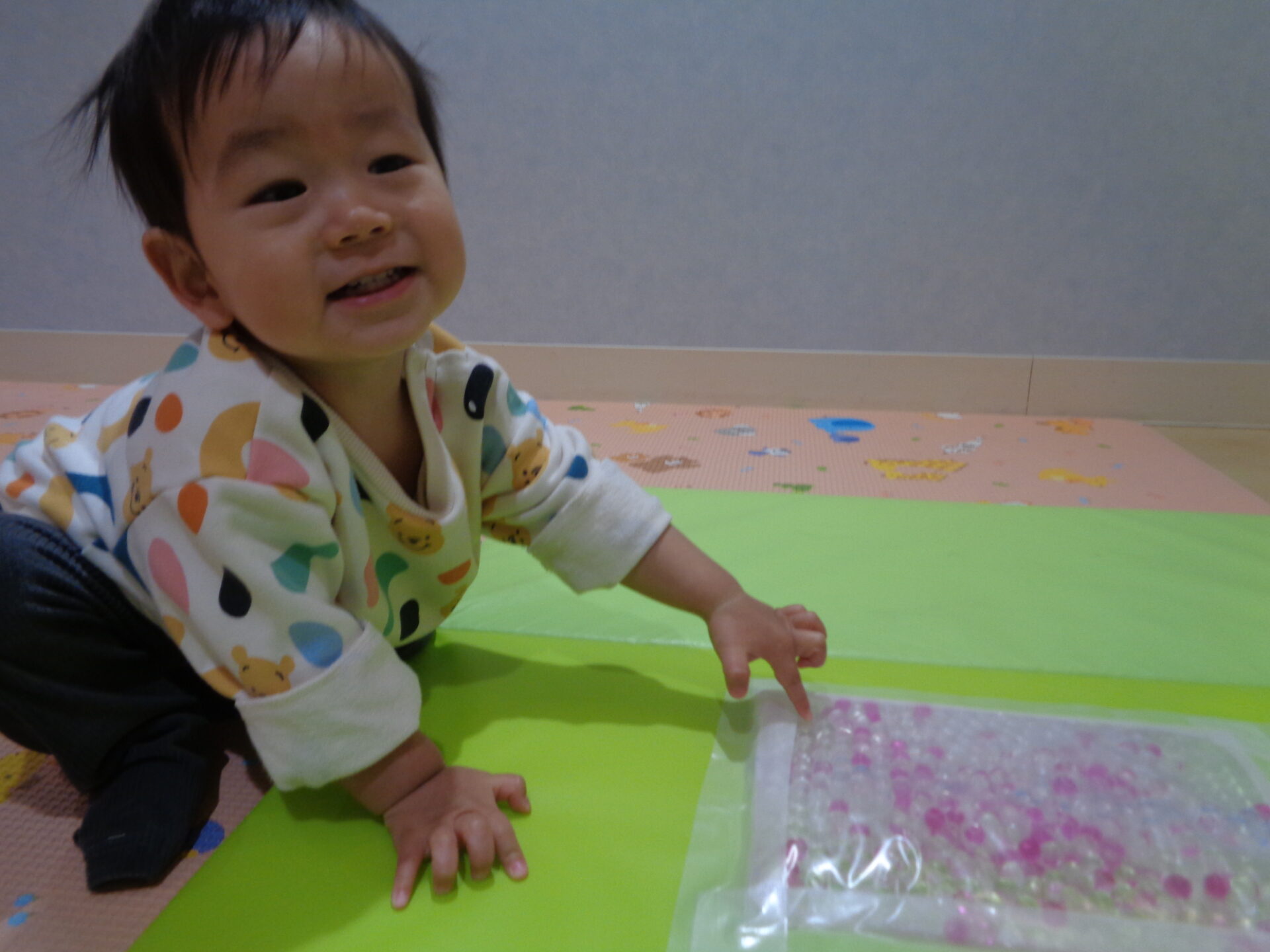 最初は恐る恐る「チョン」と触って様子を伺っていましたが、慣れてくるとマットの上を歩き、手だけではなく足でも感触を楽しんでいました。