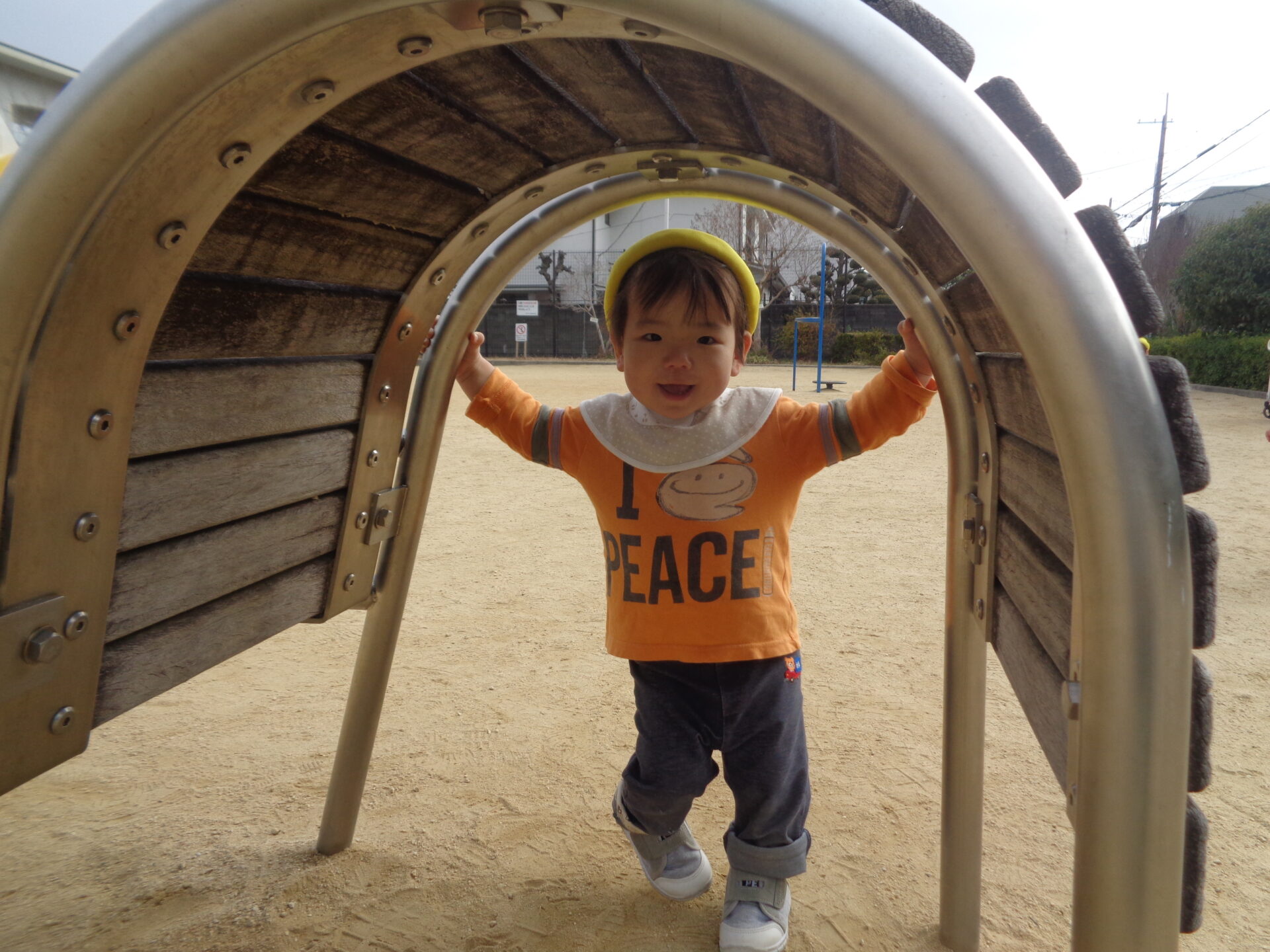 そのことに気付いたお友達は、「お、なんか通れそう!」と思って覗き込み、反対側にカメラを構えていた保育者の姿が見えると、「ばあ!」と言っていました。