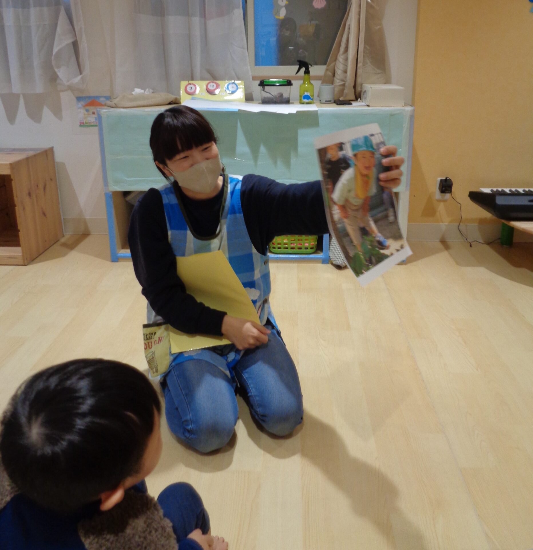 うみ・だいち組は個人のマークシールを、あめ組は入園した頃の写真を用意し、一部だけを見て、誰なのかを当てるクイズをしました。