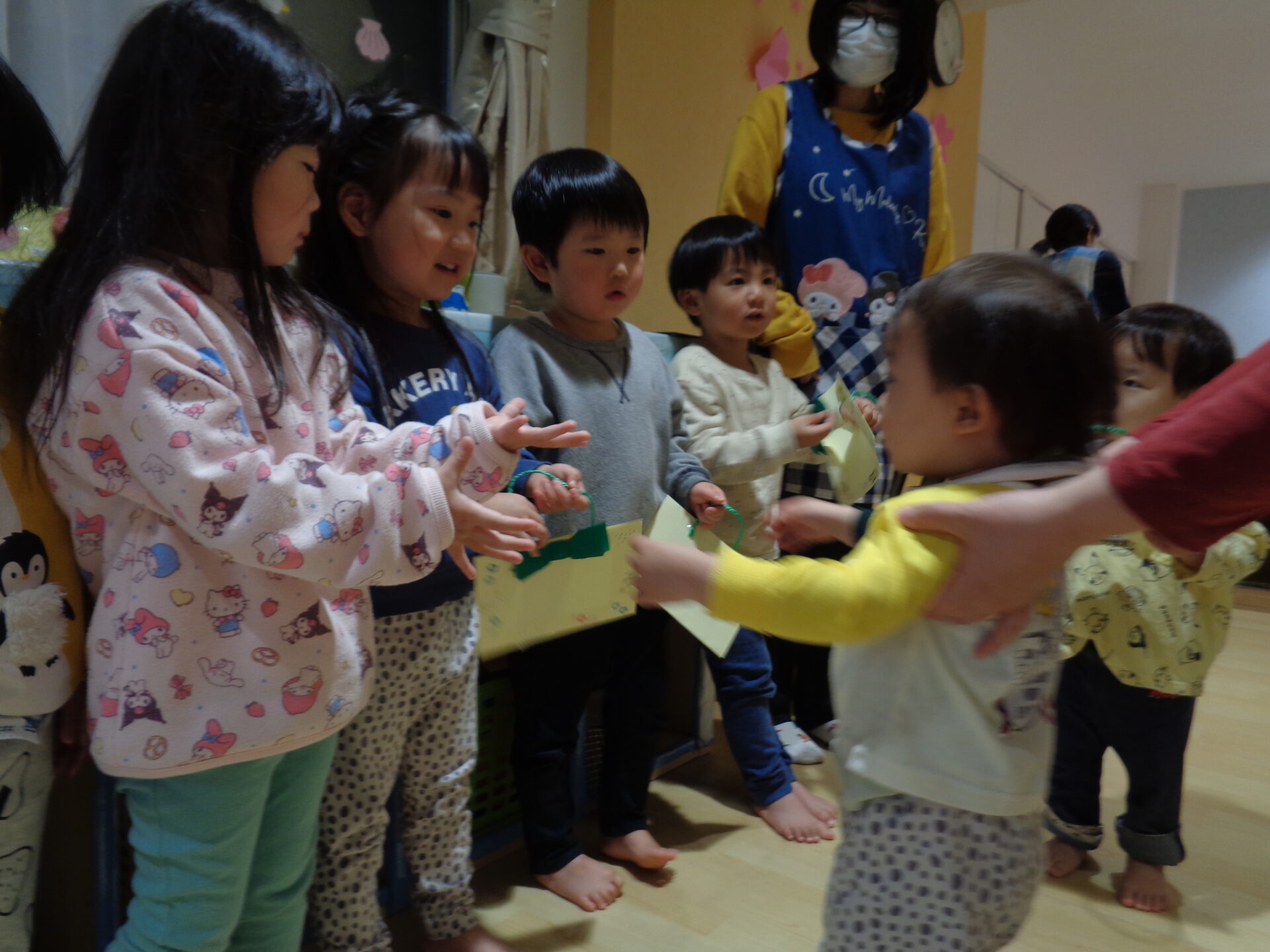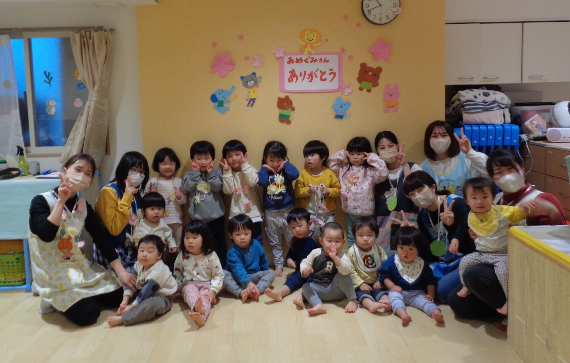 今日は、もうすぐ卒園する2歳児あめ組さんに、ありがとうの気持ちを込めて、おわかれ会をしました。