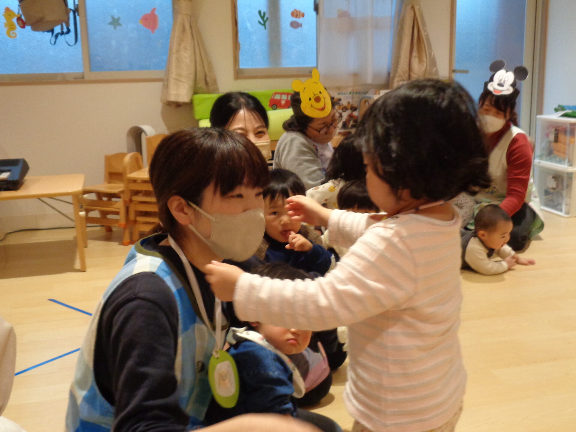 少しでもディズニーランドの楽しい雰囲気が出せるよう、先生たちはキャラクターのお面をつけました(くじ引きで決めました)