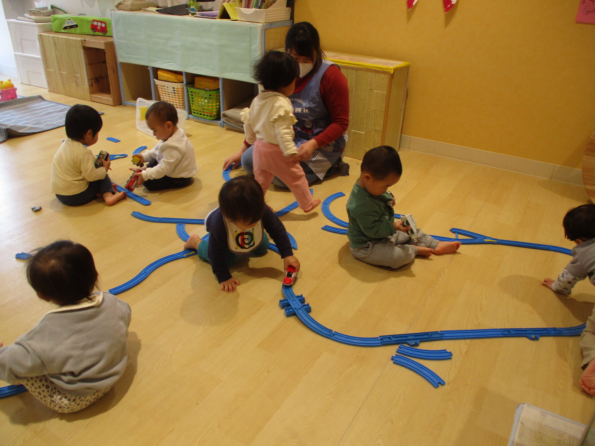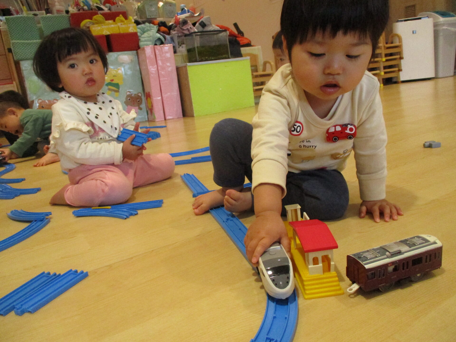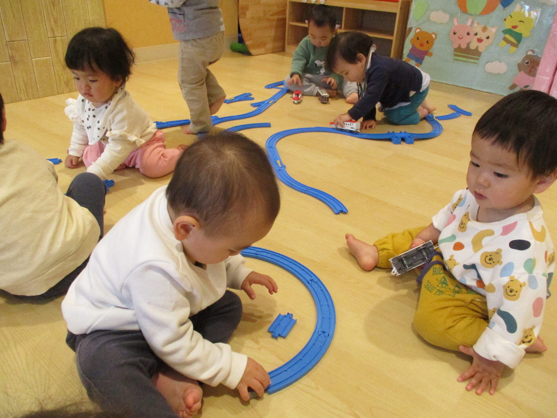 本番と同じように、うみ組の部屋で練習をしている間、0,1歳児うみ・だいち組は、プラレールや手先を使ったおもちゃで遊んでいました。