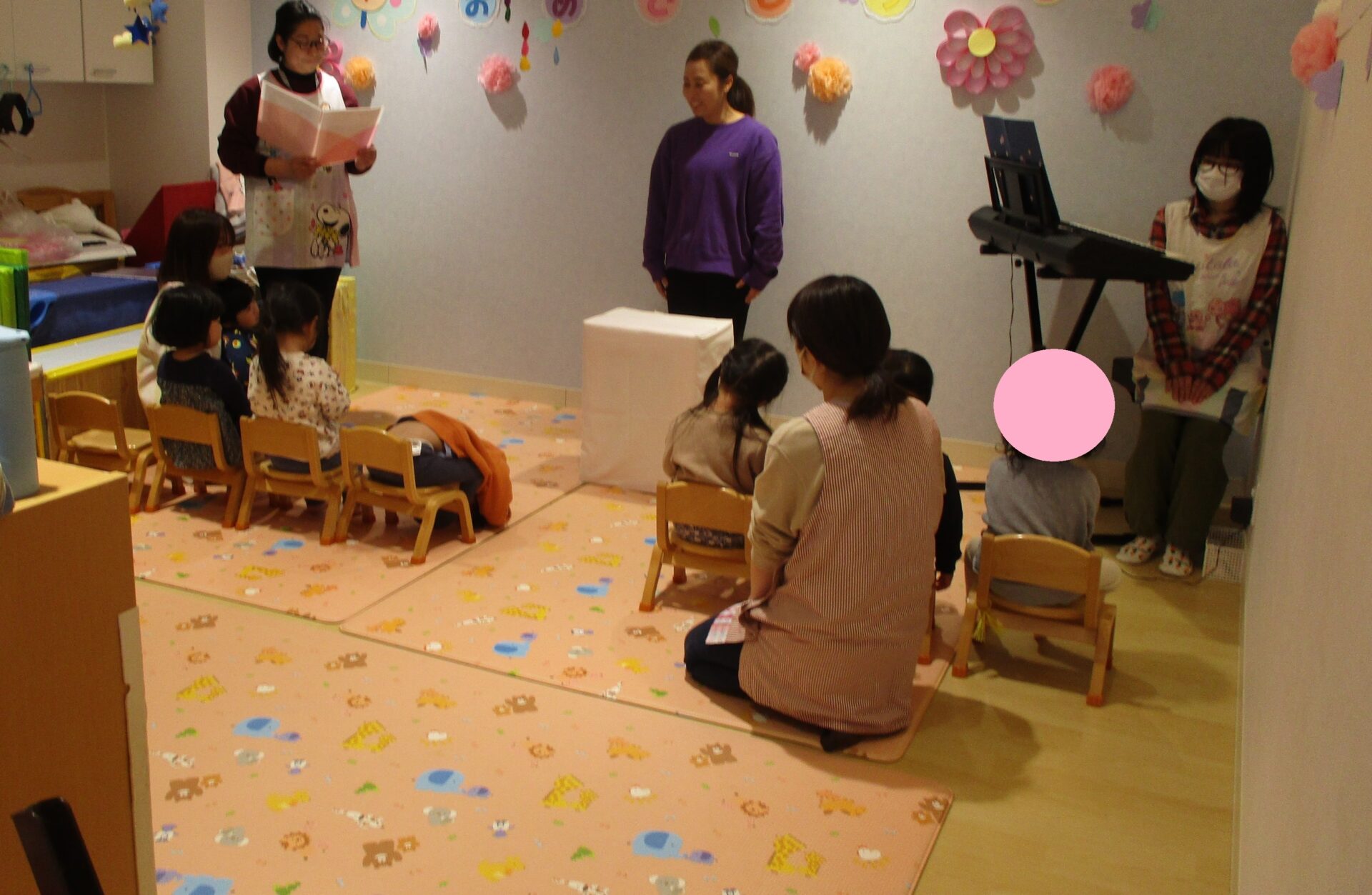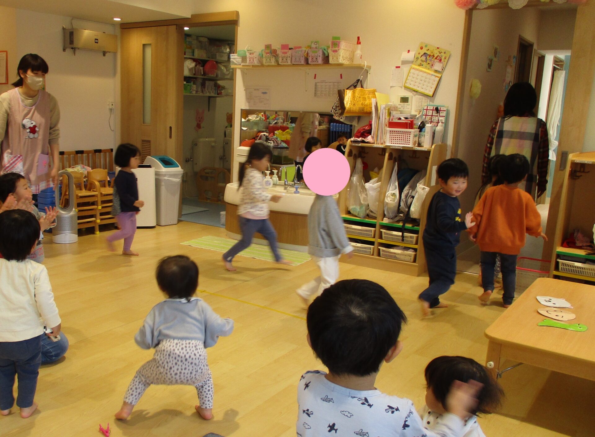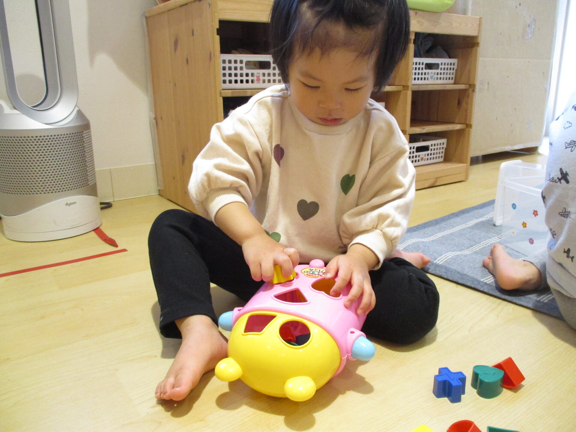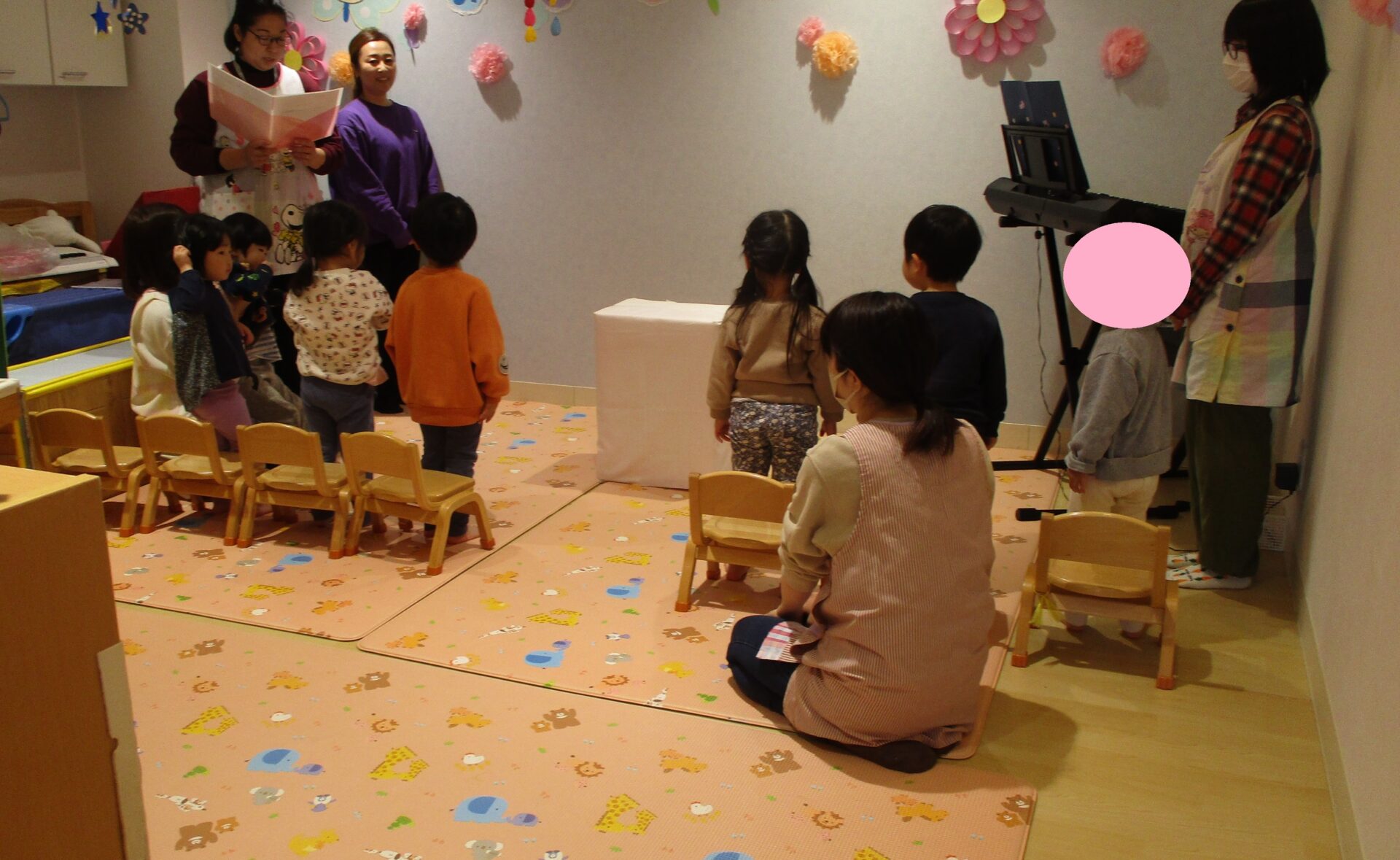 本番と同じように、うみ組の部屋で練習をしている間、0,1歳児うみ・だいち組は、プラレールや手先を使ったおもちゃで遊んでいました。
