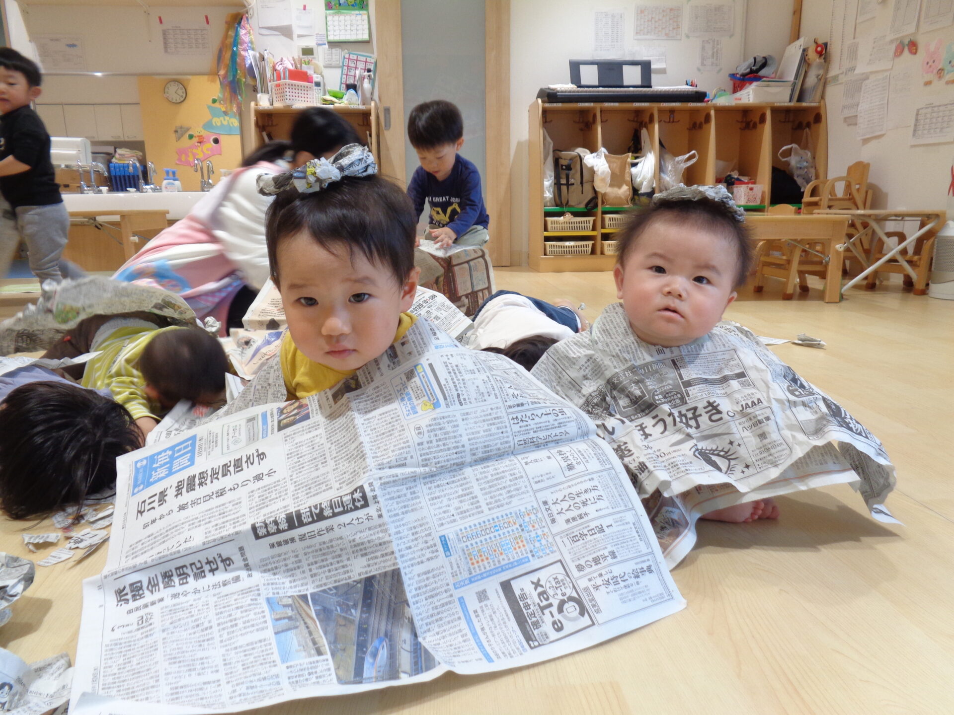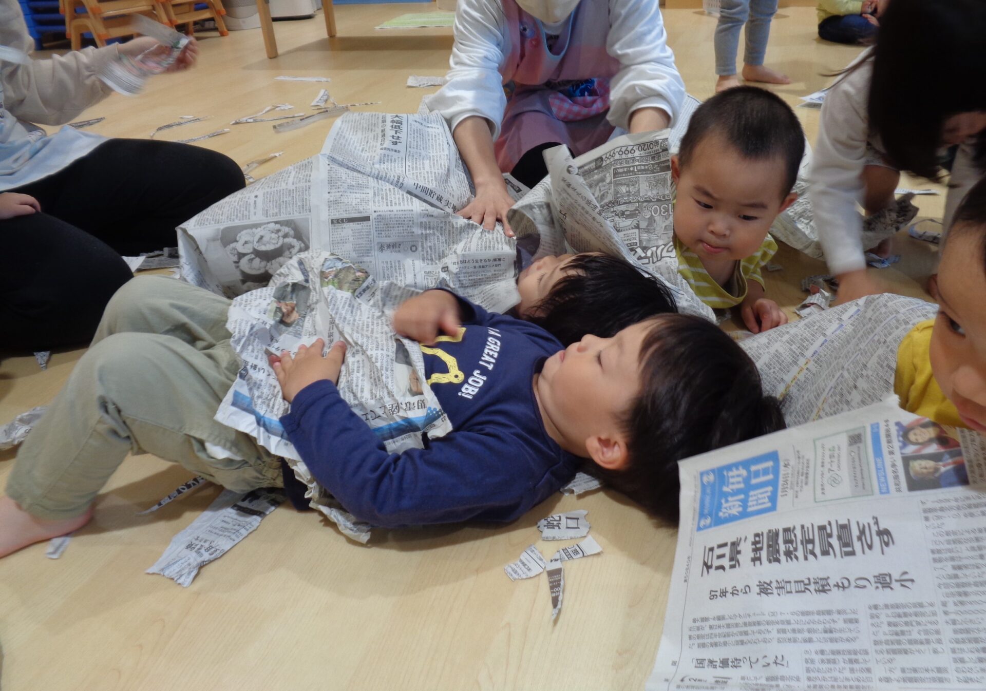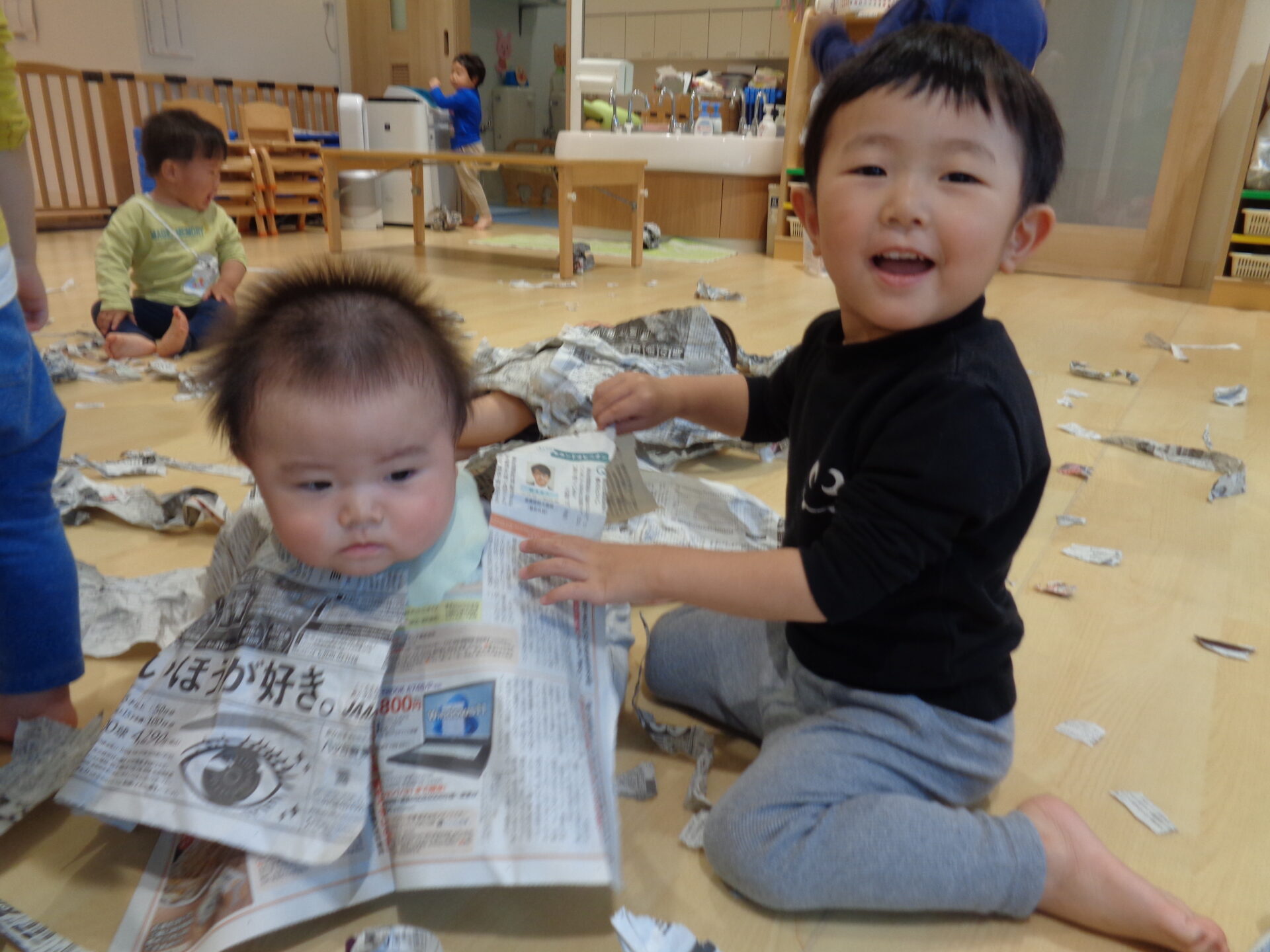 お部屋で0,1,2歳児全員で新聞遊びをしました。