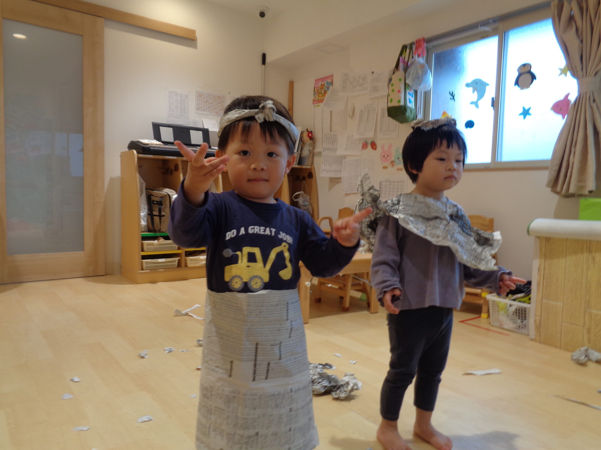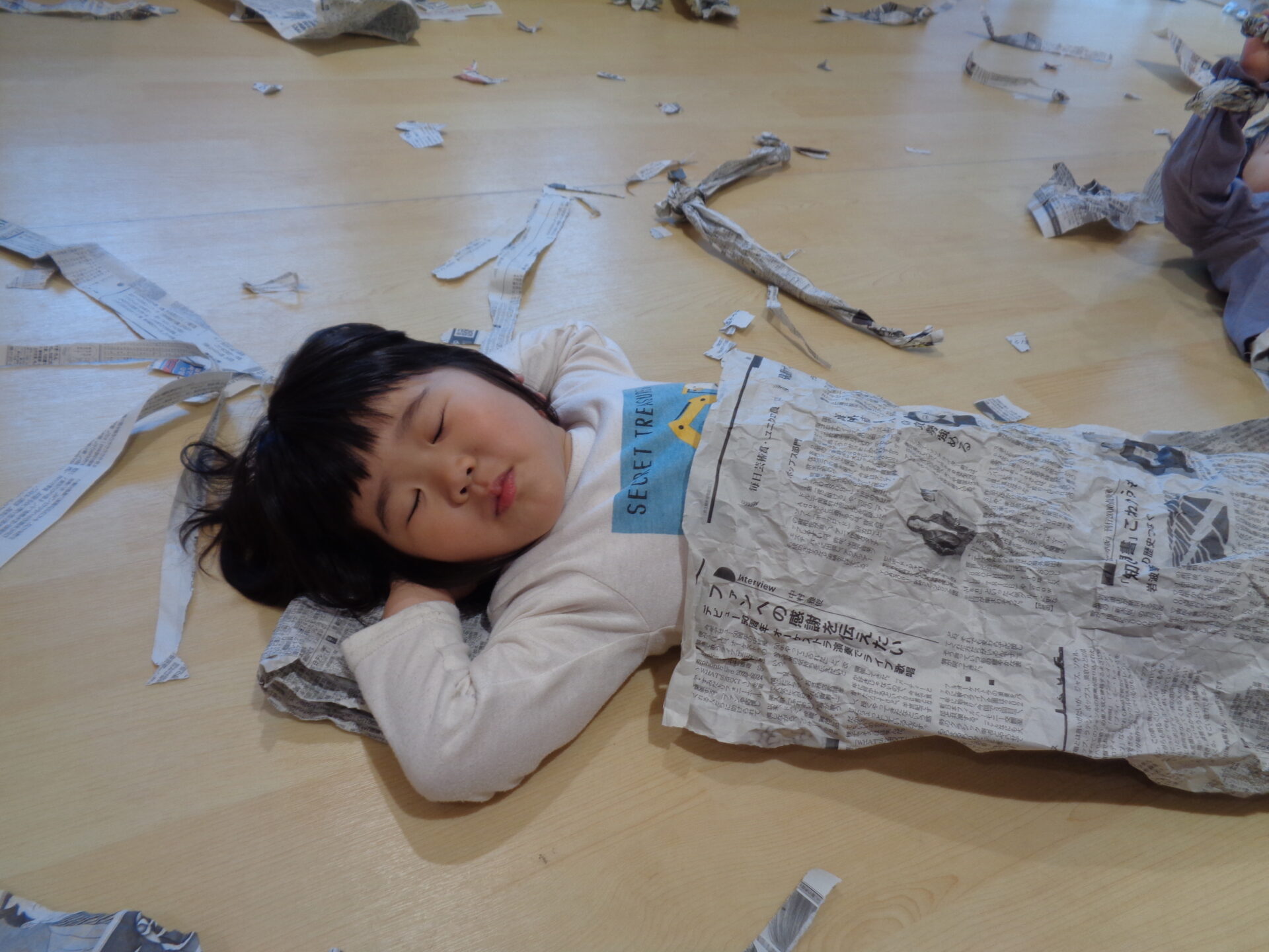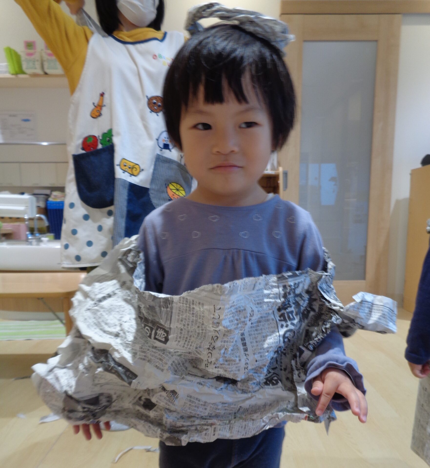 はじめに、「新聞ってこんなこともできるんだよ~!」と見せると、「やりたーい!」と目がキラキラした子どもたちでした^^