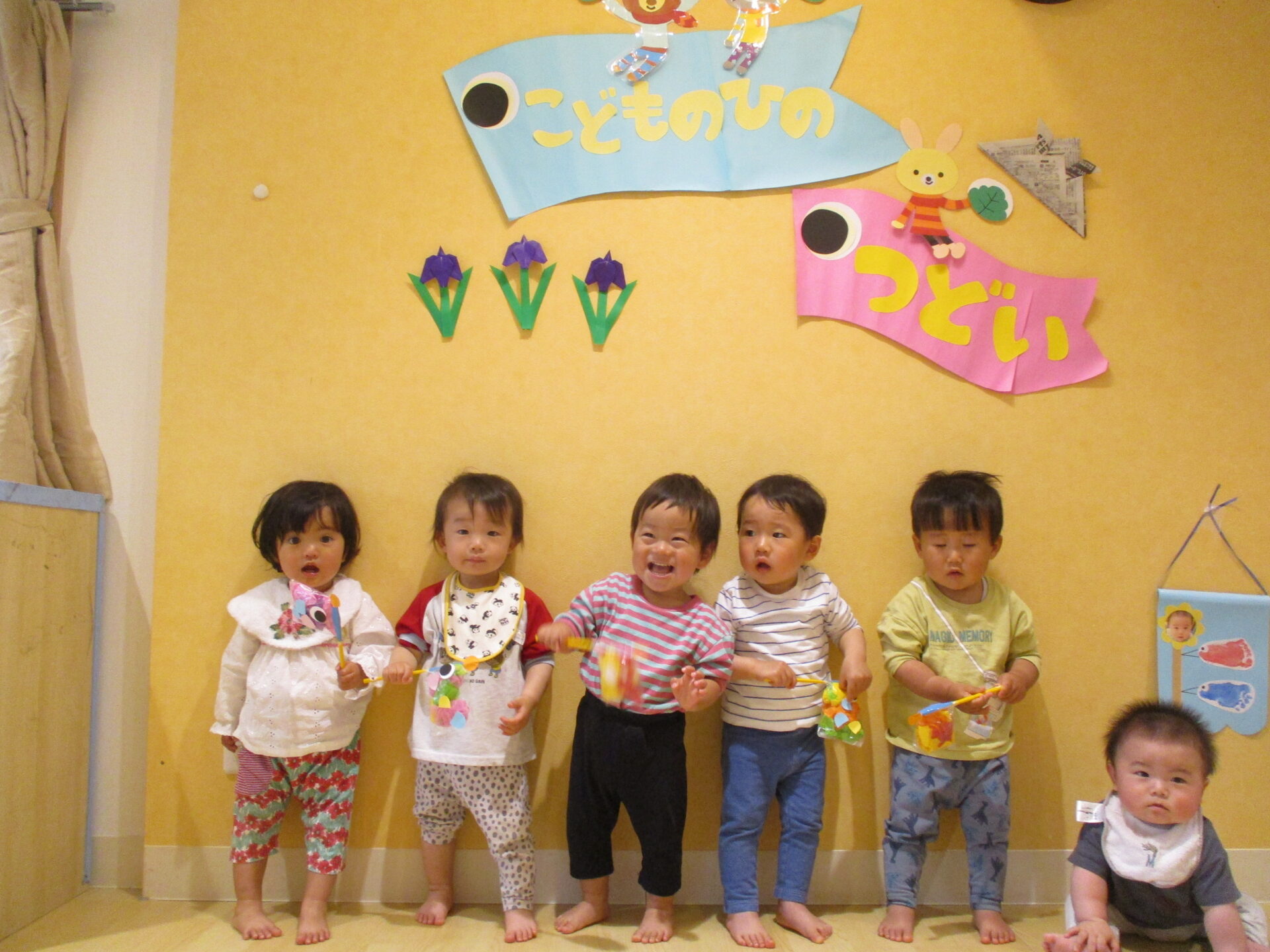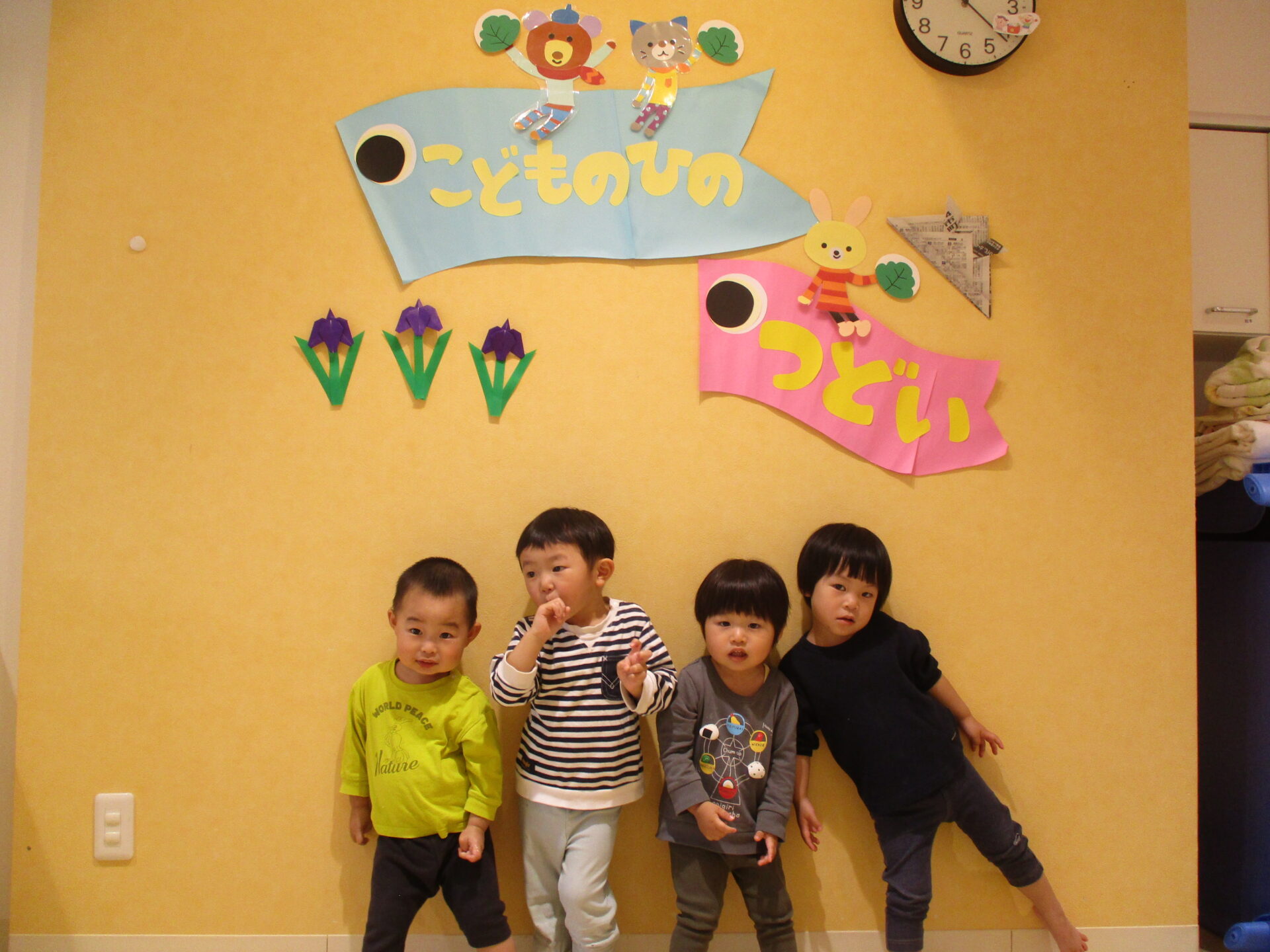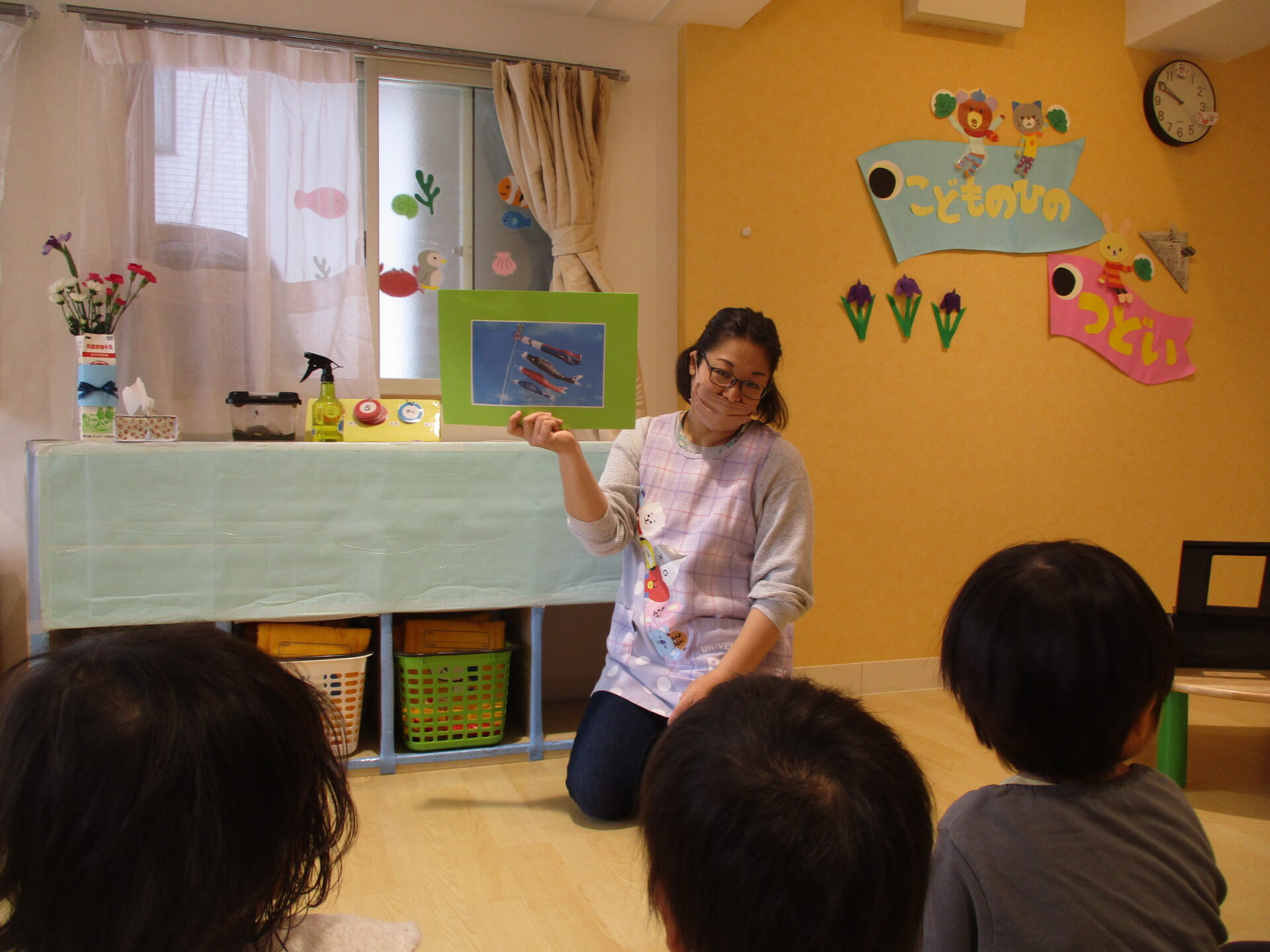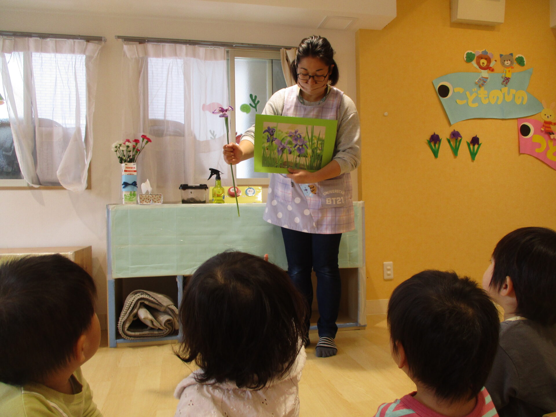こいのぼりの写真や菖蒲(しょうぶ)の花を見て、意味や由来の話を聞きました。