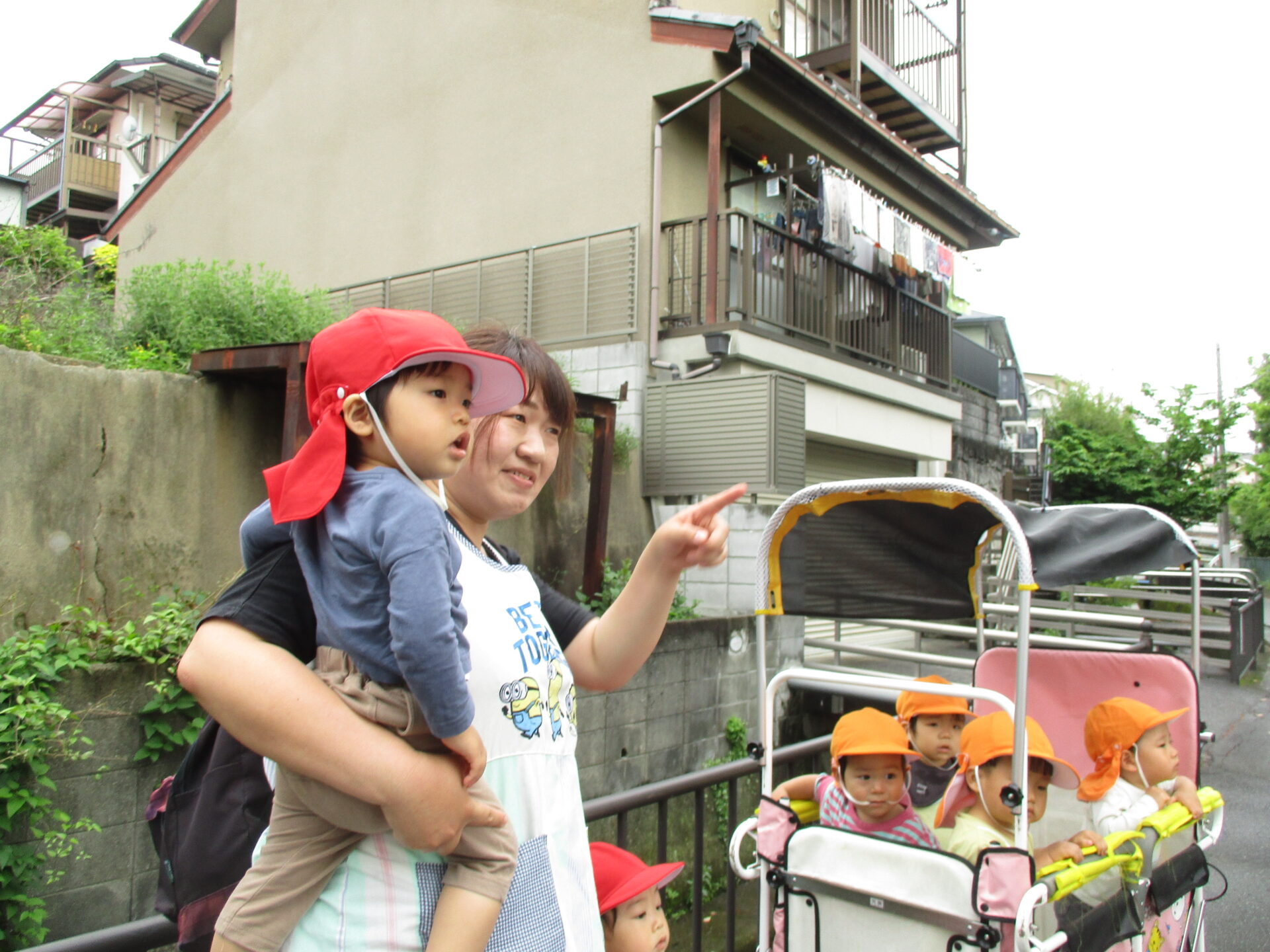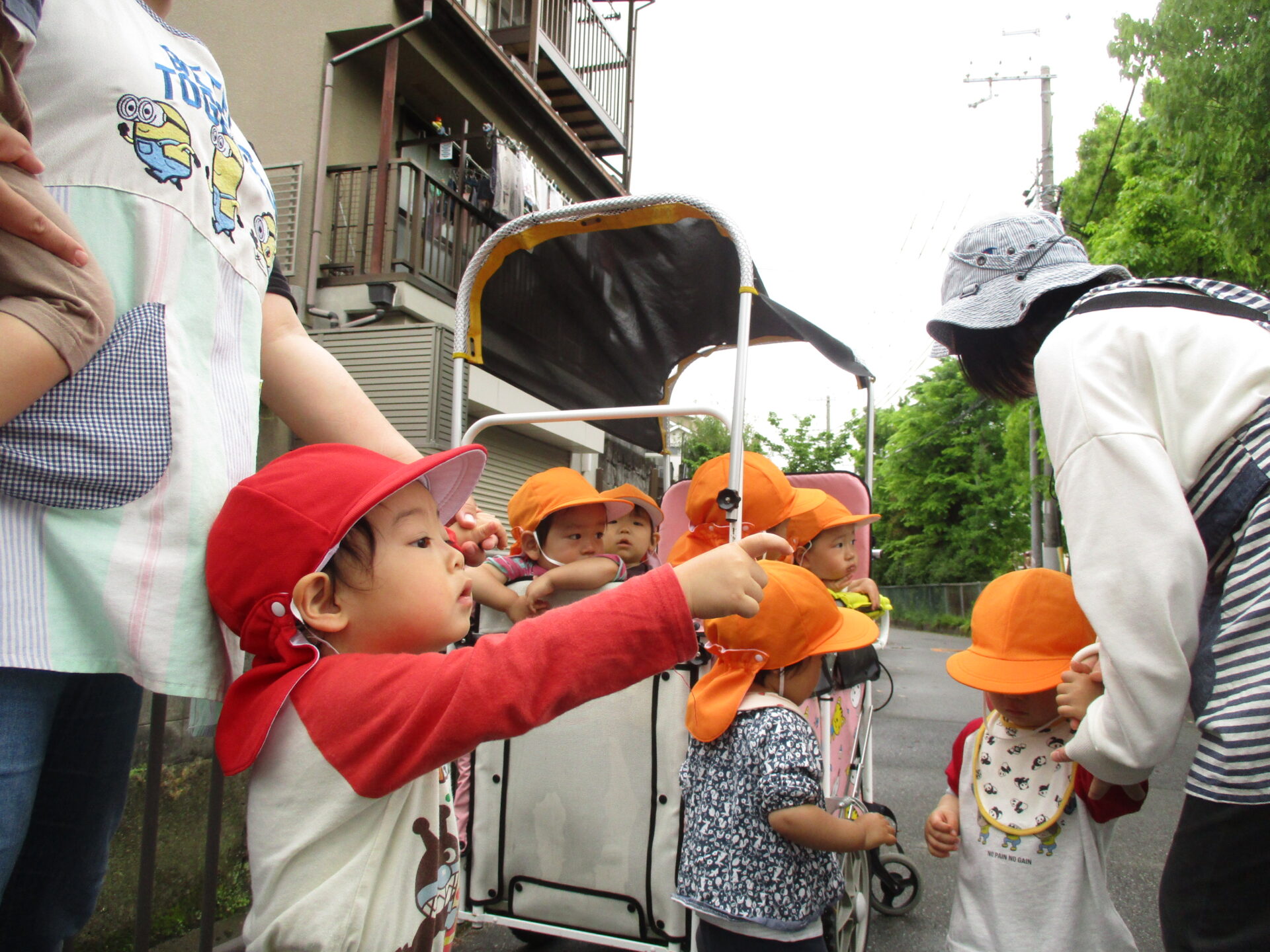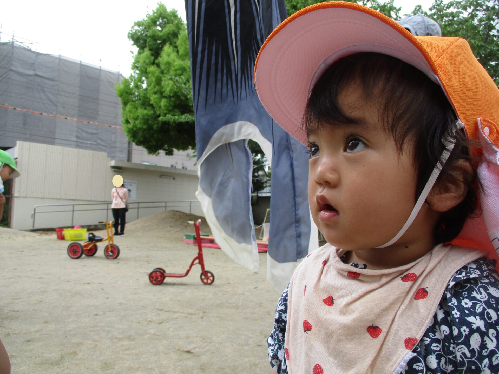 先日園では、こどもの日の集いをしましたが、空に泳ぐ大きなこいのぼりを見たくて、みんなでお散歩に出かけました。