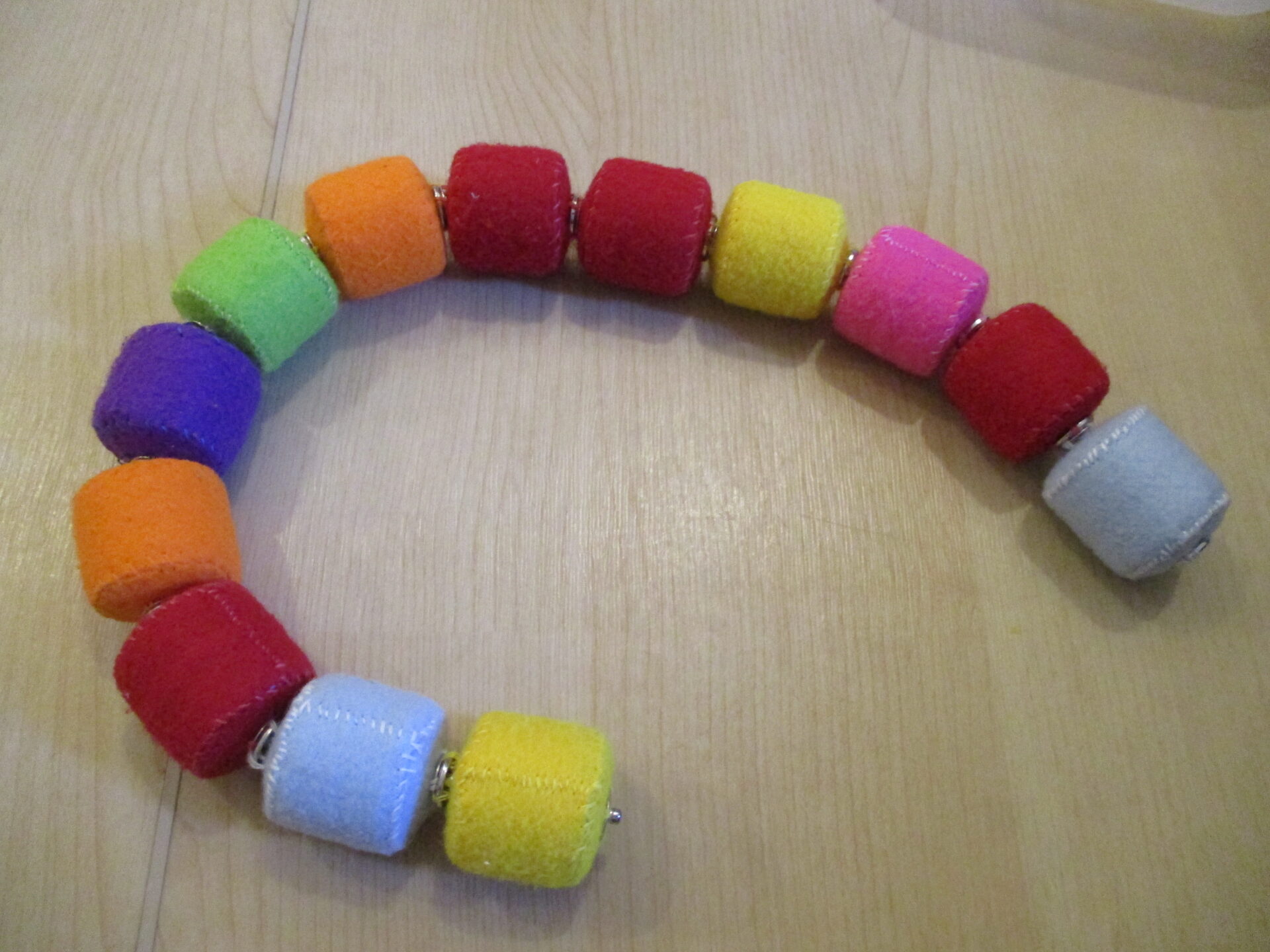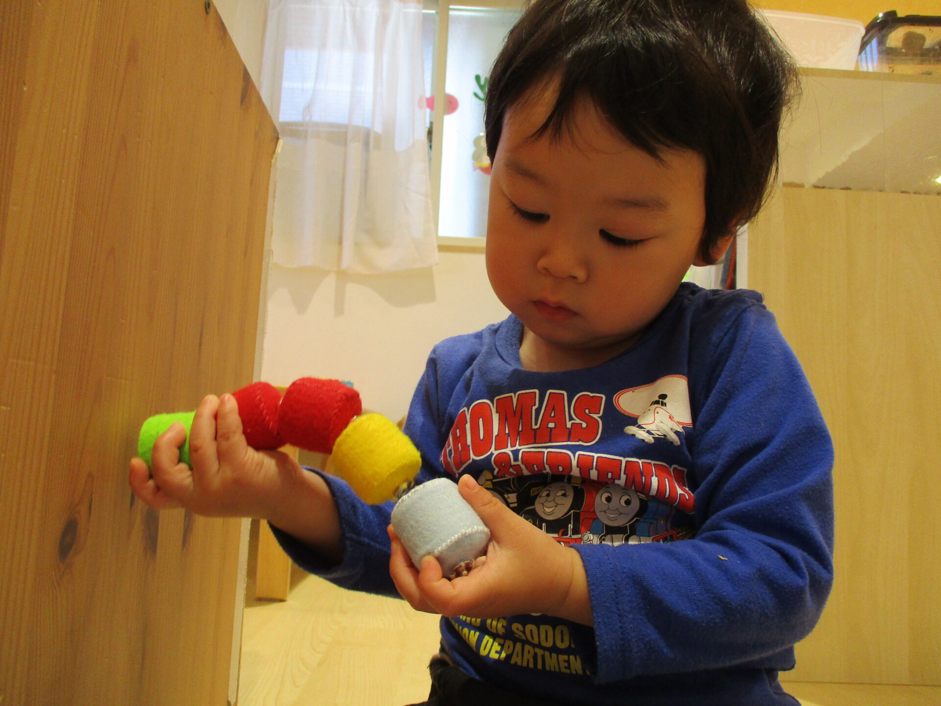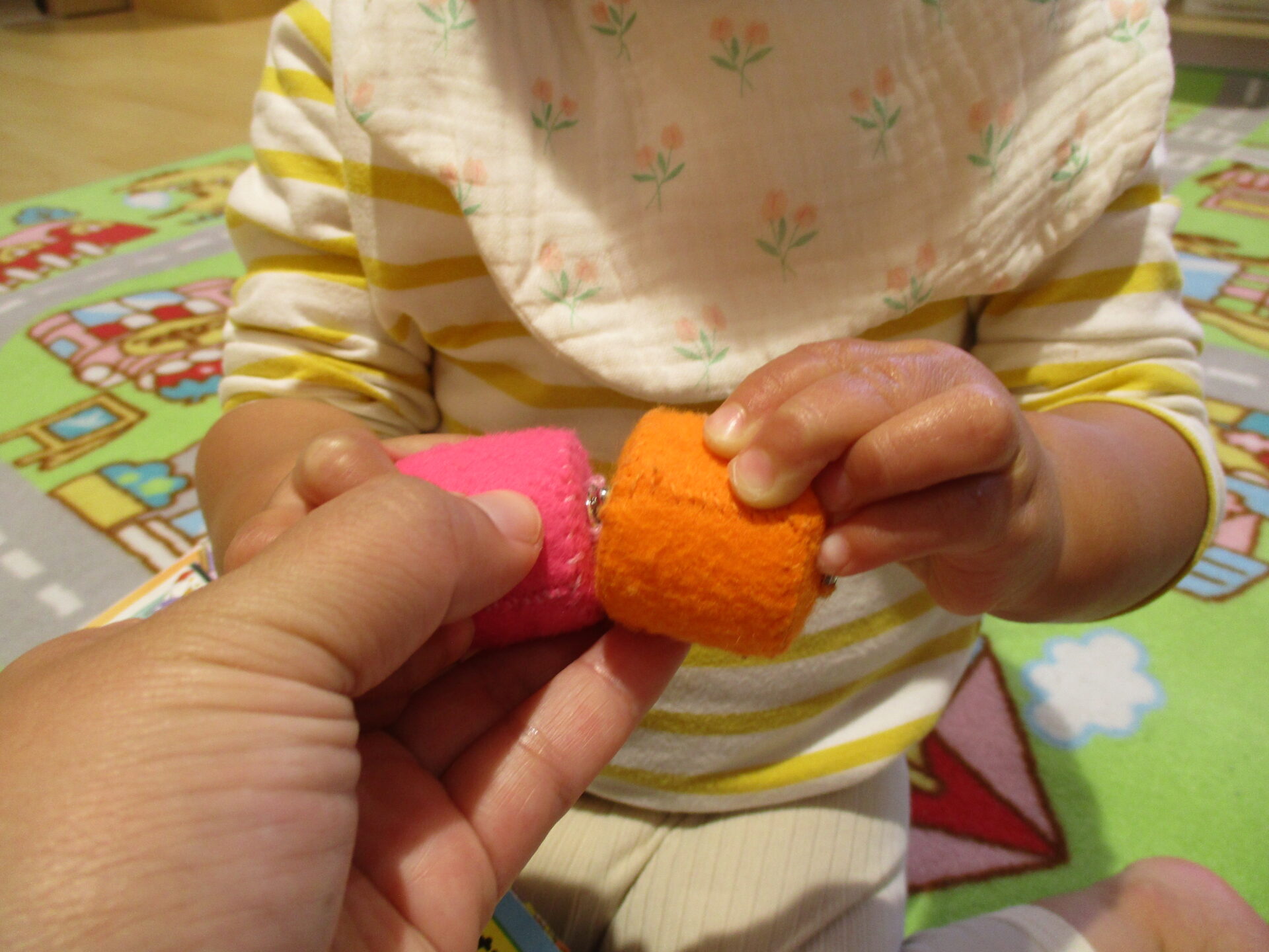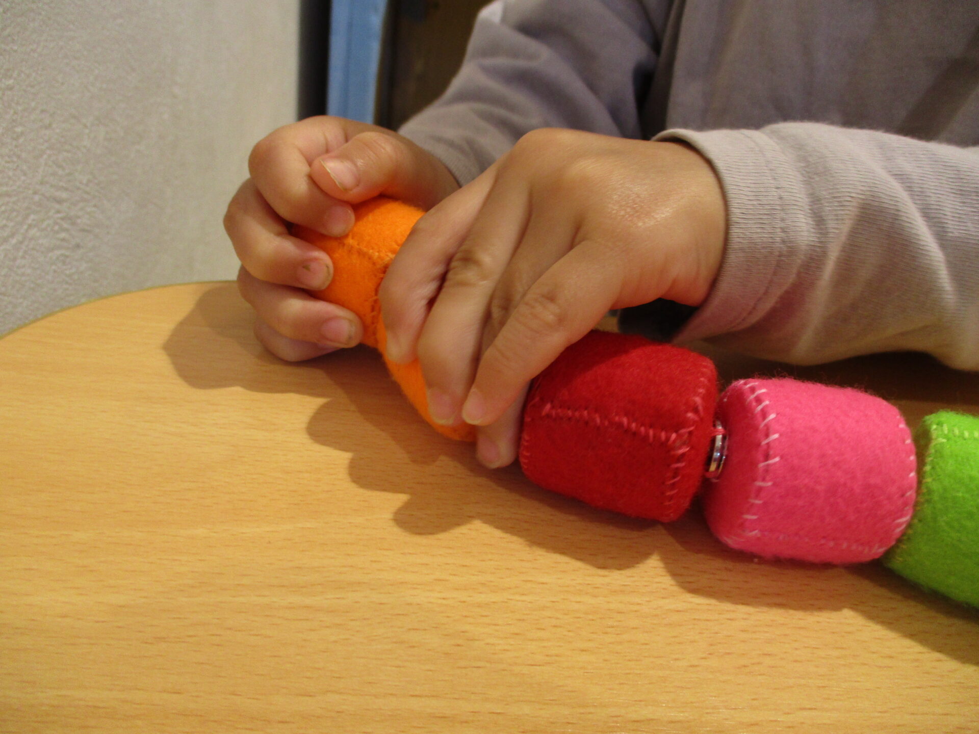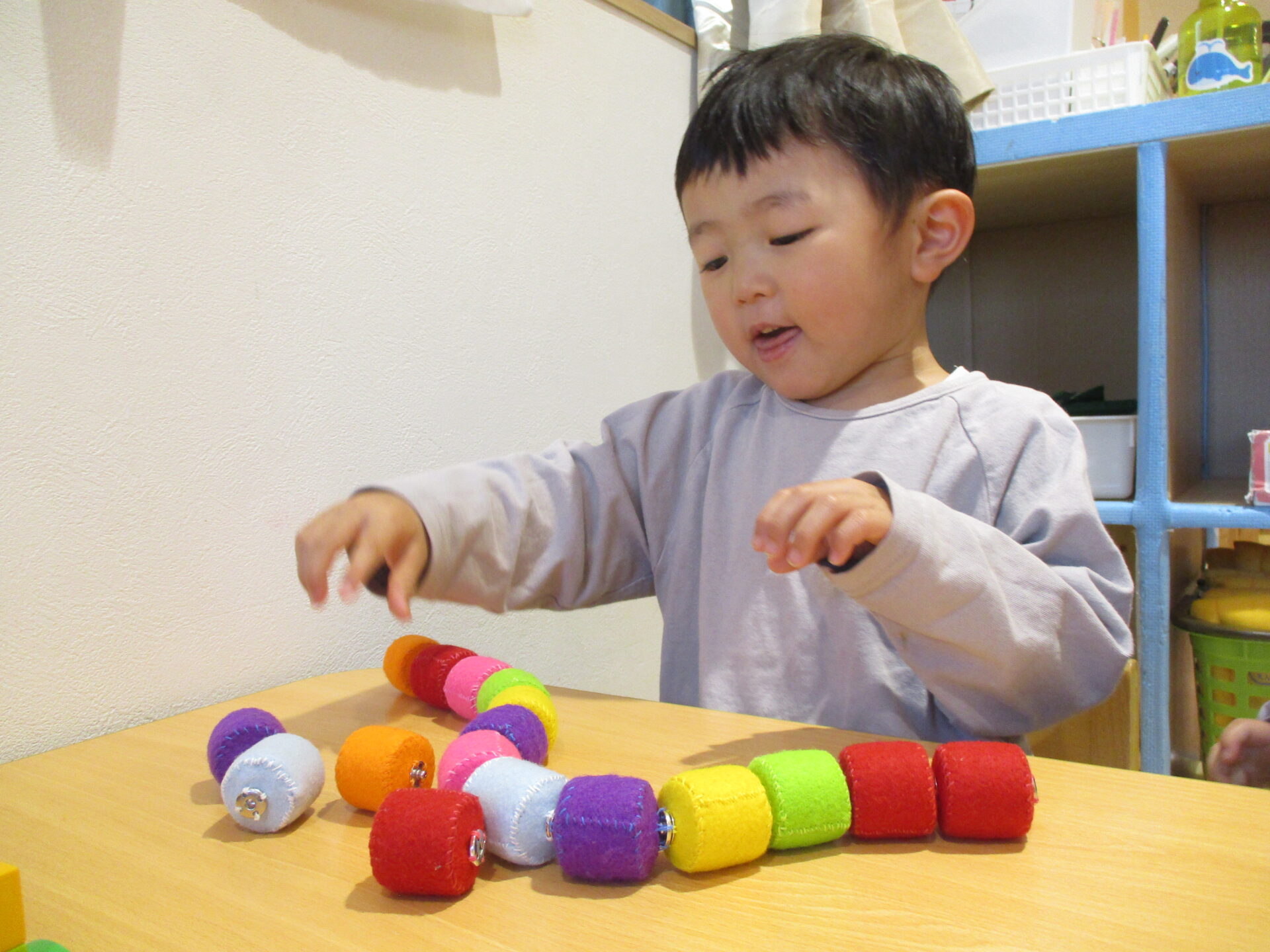 最初はうみ組で使っていたこのオモチャ、0歳児の子ども達は保育士が繋げた状態のものをプチプチ千切って遊んでいました。