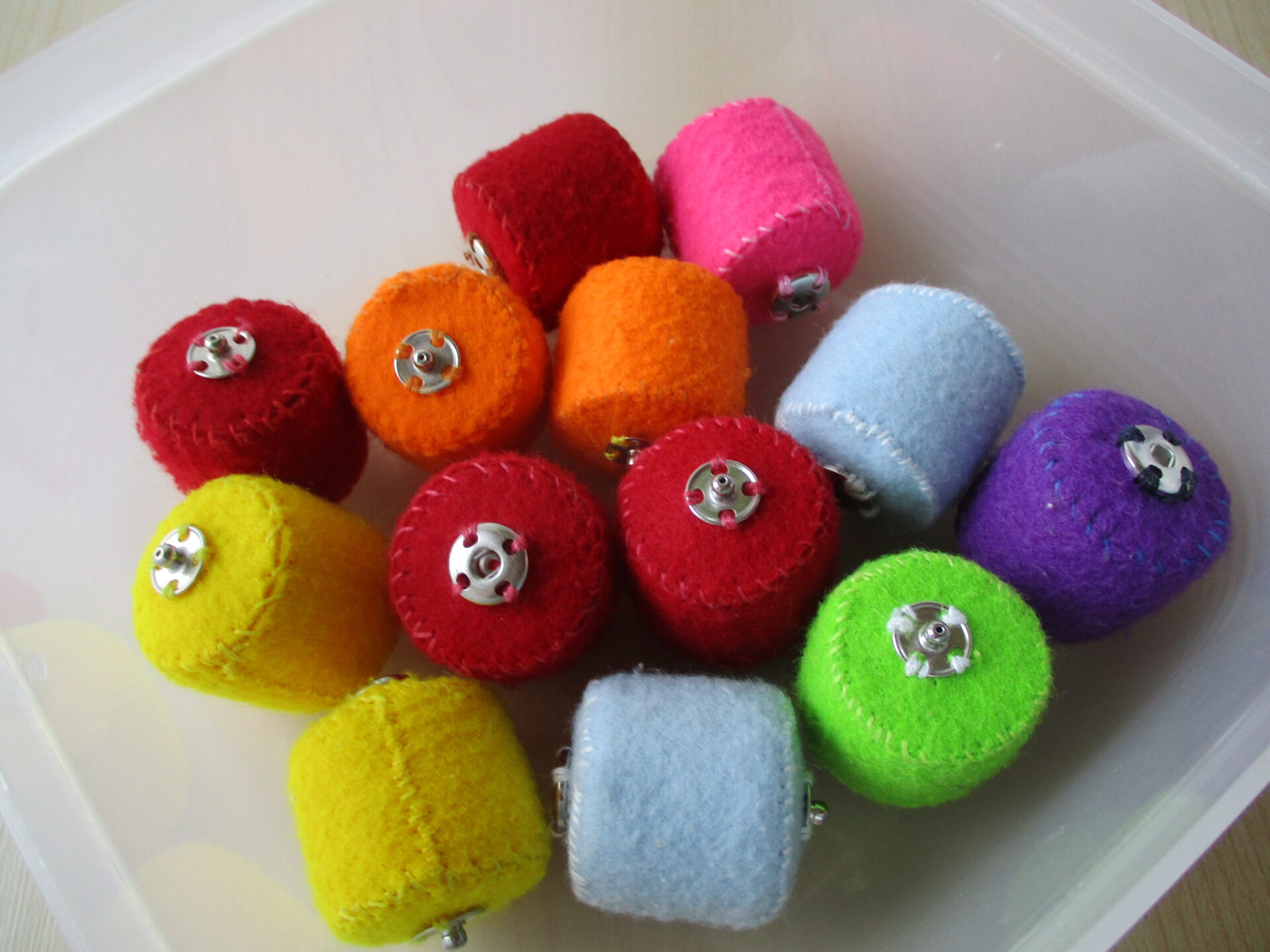 こちら、ペットボトルキャップを合わせ、フェルトを縫い、スナップボタンを付けたものになります。
