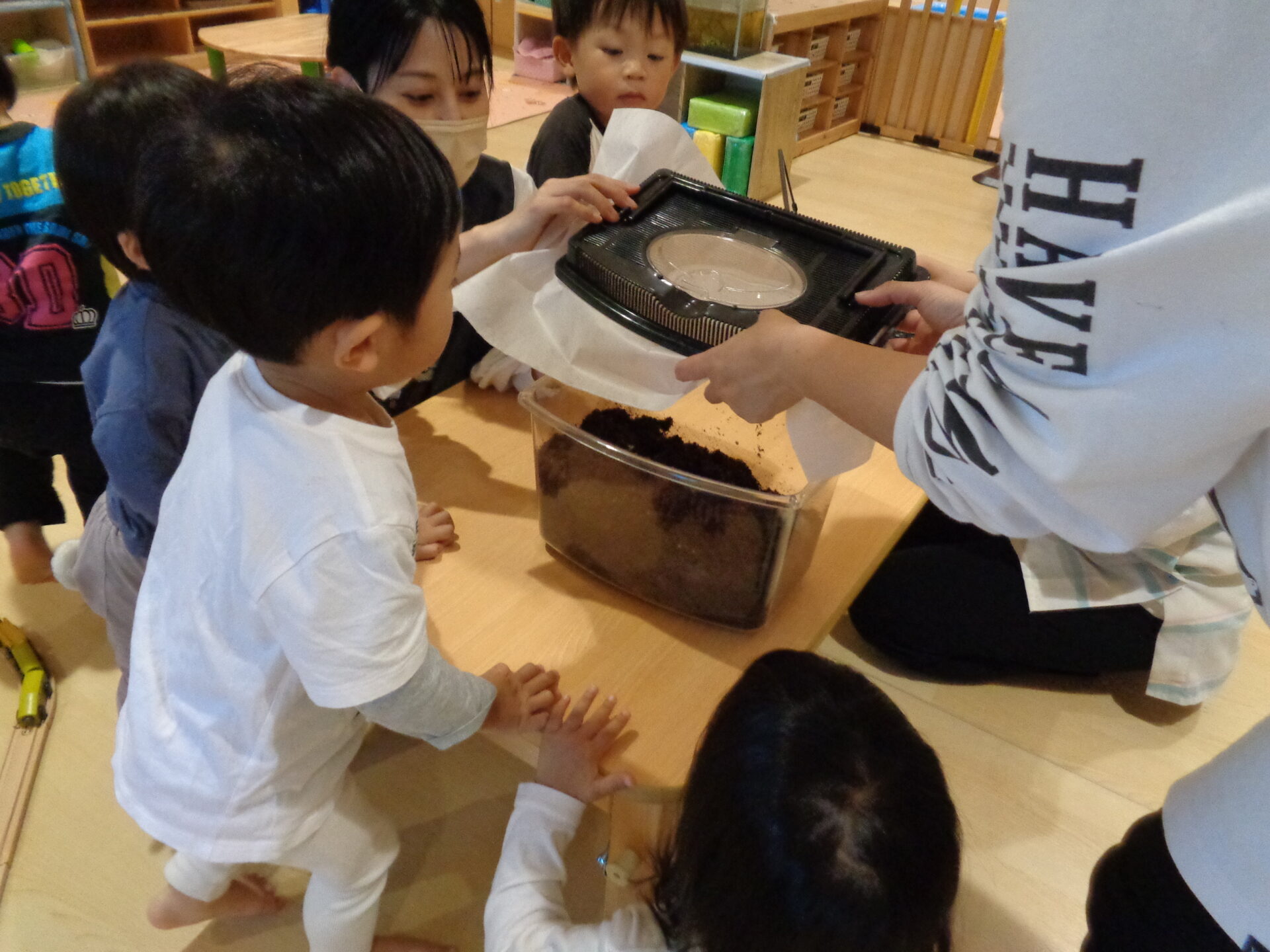 先日、姉妹園からカブトムシの幼虫をいただきました。