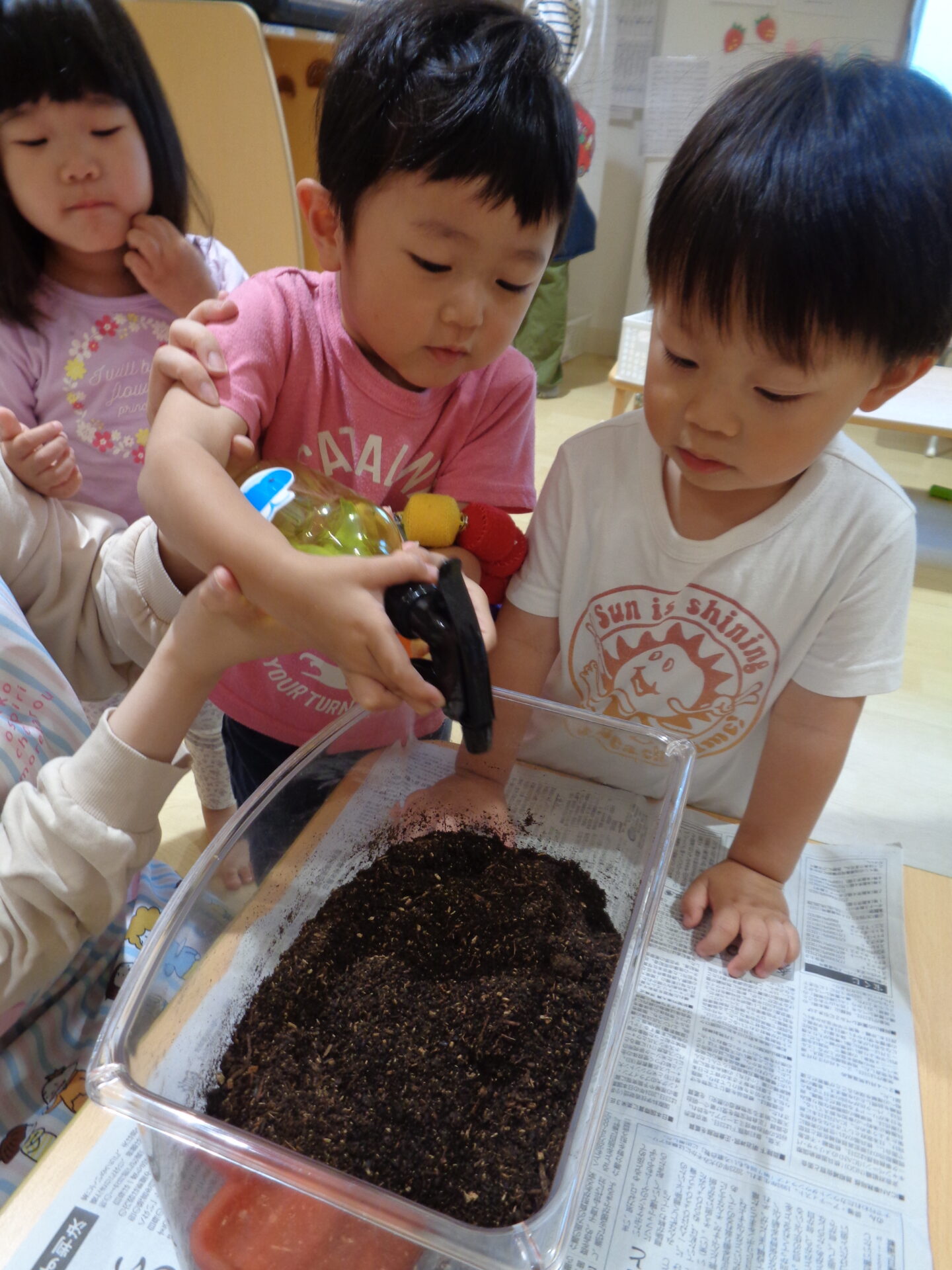 出てきていたカブトムシさんに土のお布団を掛けて、お水をシュッ💦