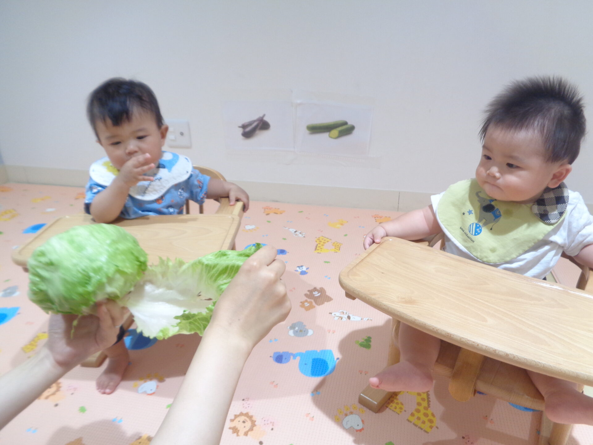 はじめにレタスに触れました!保育者が目の前で、葉をぺりっとめくると、「おー!!」と真剣な眼差しで見る子どもたち。