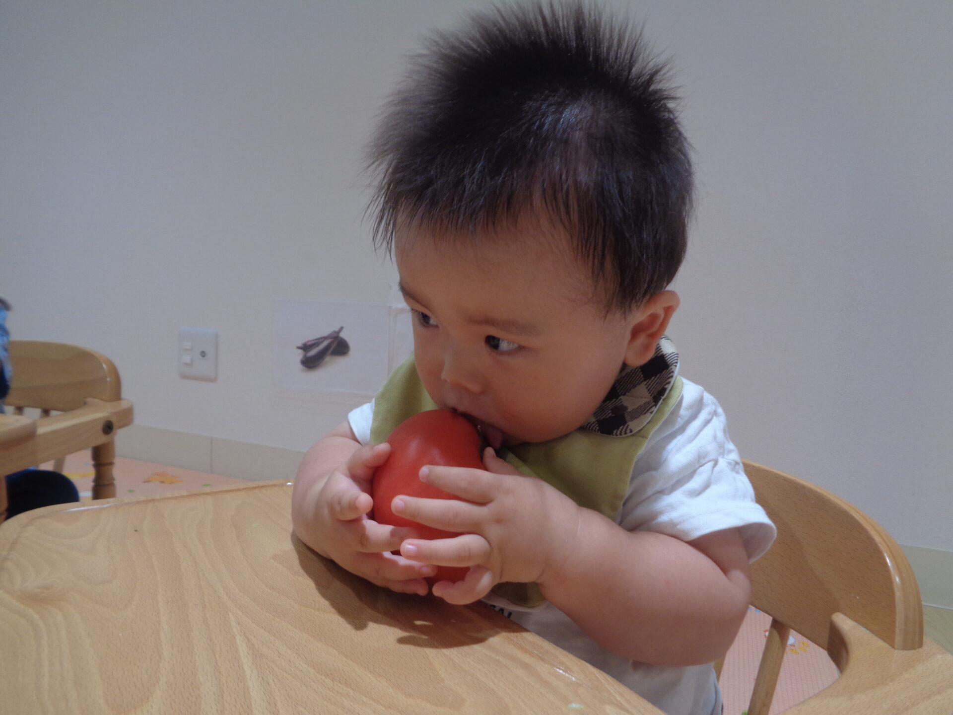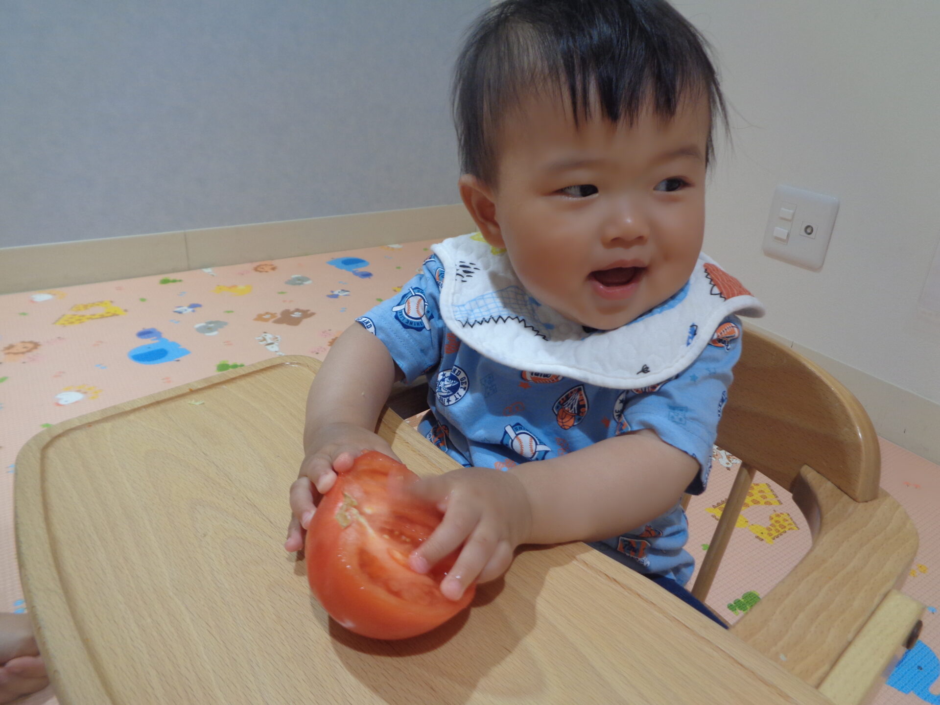 トマトの形と色味を見て、”これはおいしいのかな?”と思ったようで、ペロリ!!