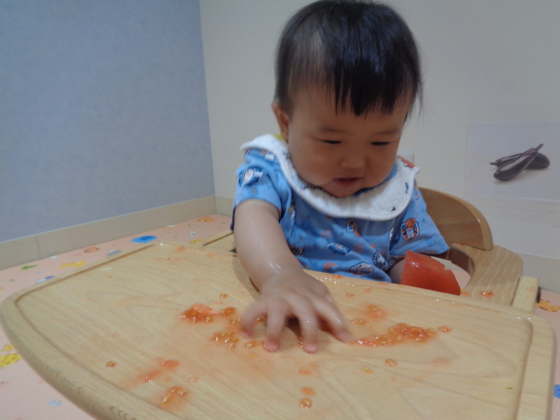 机の上にトマトの種と汁が広がると、手でパシャパシャと叩いて、楽しんでいました🎵