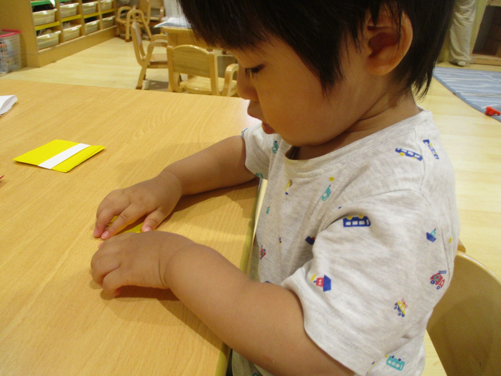 また、保育士が折り紙を半分に折ってから渡していると「やってみたい」と言ってくれて